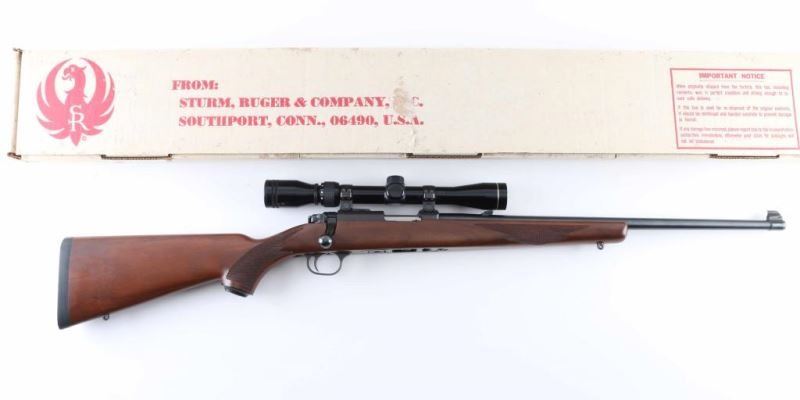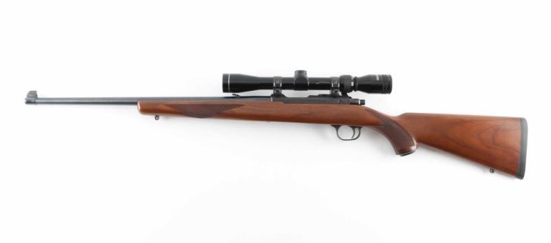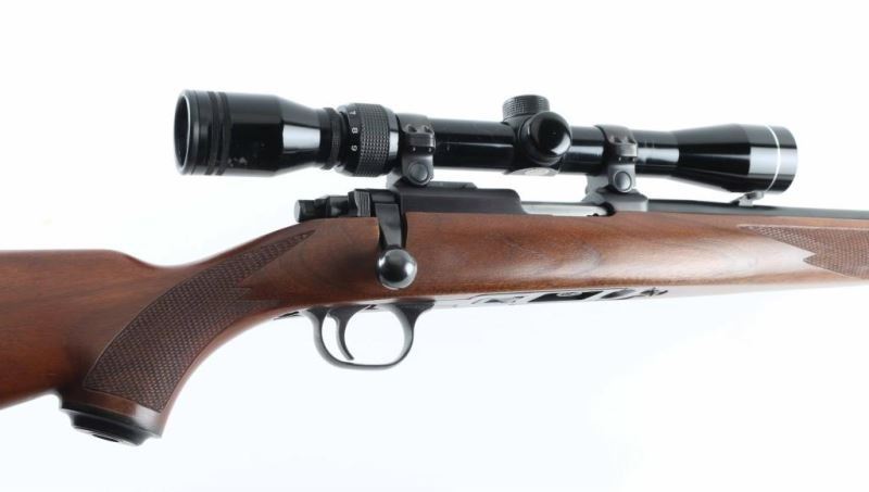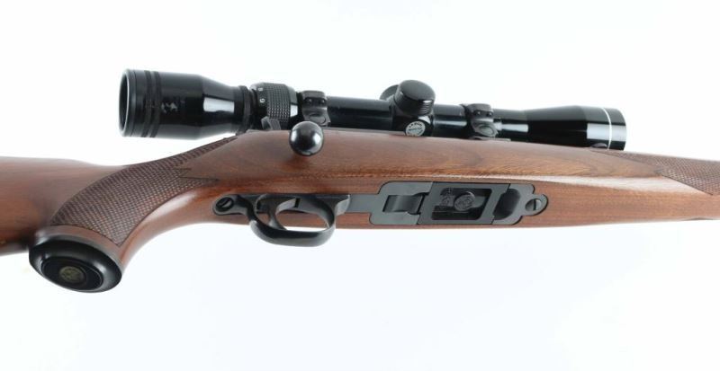 Bolt action rimfire rifle features blued finish, wood stock with checkered panels at forend & curved wrist, no cheekpiece, thin solid rubber recoil pad, sling studs, 20" barrel, blade front sight, folding adjustable rear sight, scalloped dovetails on receiver for scope mounting, detachable magazine, manual safety. Bore is very good condition. Retains 95% blue. Wood is excellent condition. Mounts a Tasco 3-9x32mm scope with clear view, duplex reticle, large scratch on left side. Includes factory cardboard box. Condition is NRA Excellent *** Modern Firearm ***