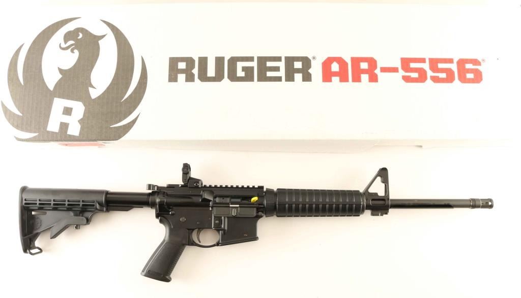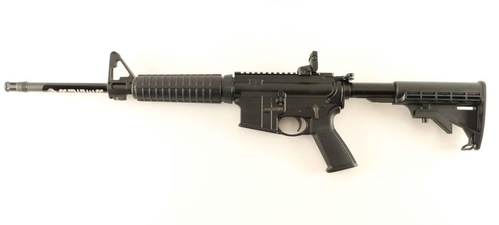 Quality direct impingement AR platform modern sporting rifle chambered in 5.56mm Nato. Features a matte black finish, medium contour 16.1" cold hammer-forged alloy barrel with 1:8" twist, flash suppressor, adjustable shrouded post front sight with integral bayonet lug & QD mount in the base, flip-up Rapid Deploy adjustable aperture rear sight, two-piece carbine black synthetic handguard without heat shields, twist-off delta ring, flat top upper receiver with dust cover, forward assist & shell deflector, M16 profile bolt carrier, standard fire control group, ergonomic black synthetic pistol grip and six-position collapsible M4 style shoulder stock. Includes the original factory cardboard box with documents, lock and sight adjustment tool. Rifle exhibits approximately 99% of it's original finish showing some scratches in the magazine well and a few dings on the shell deflector with no major wear observed. Action is crisp, the bore is pristine and the synthetic stocks are fine. Condition is near NRA Perfect in box. ***Modern Firearm***
