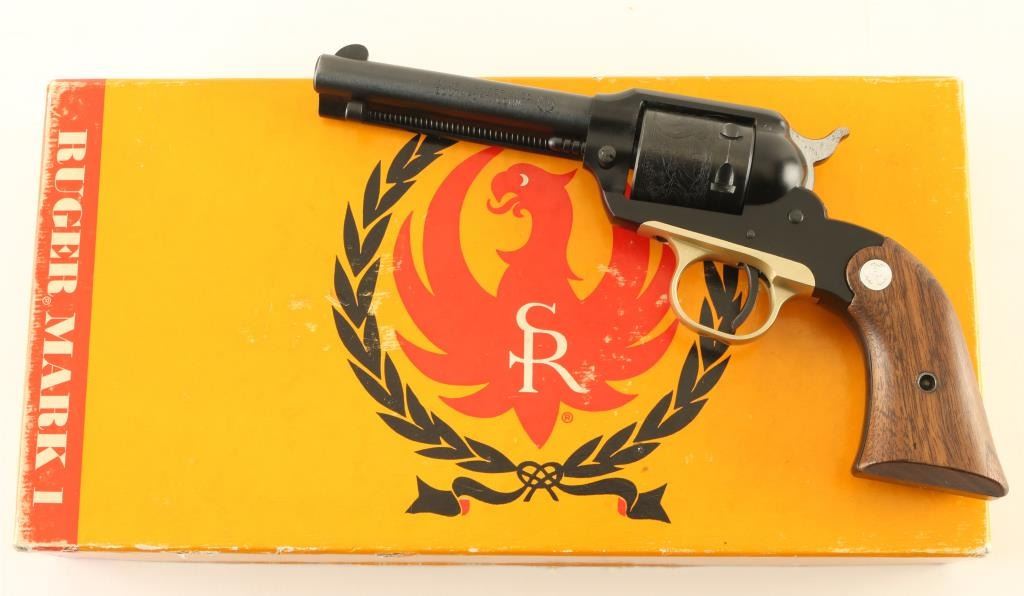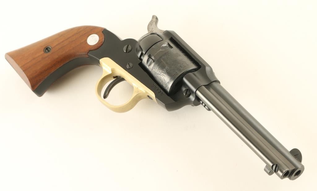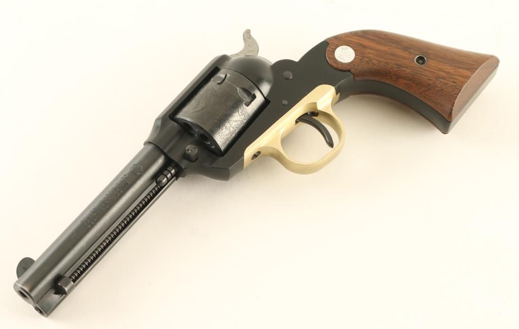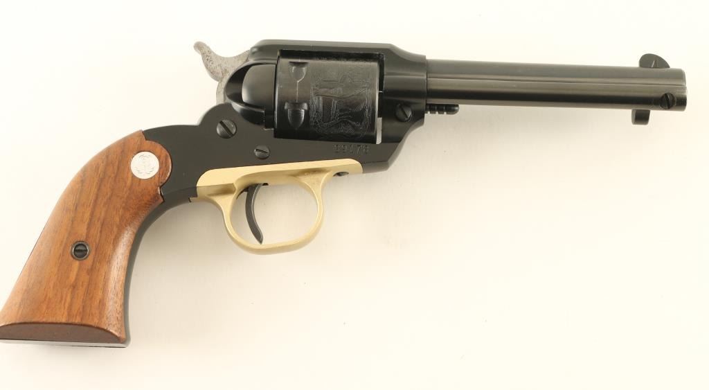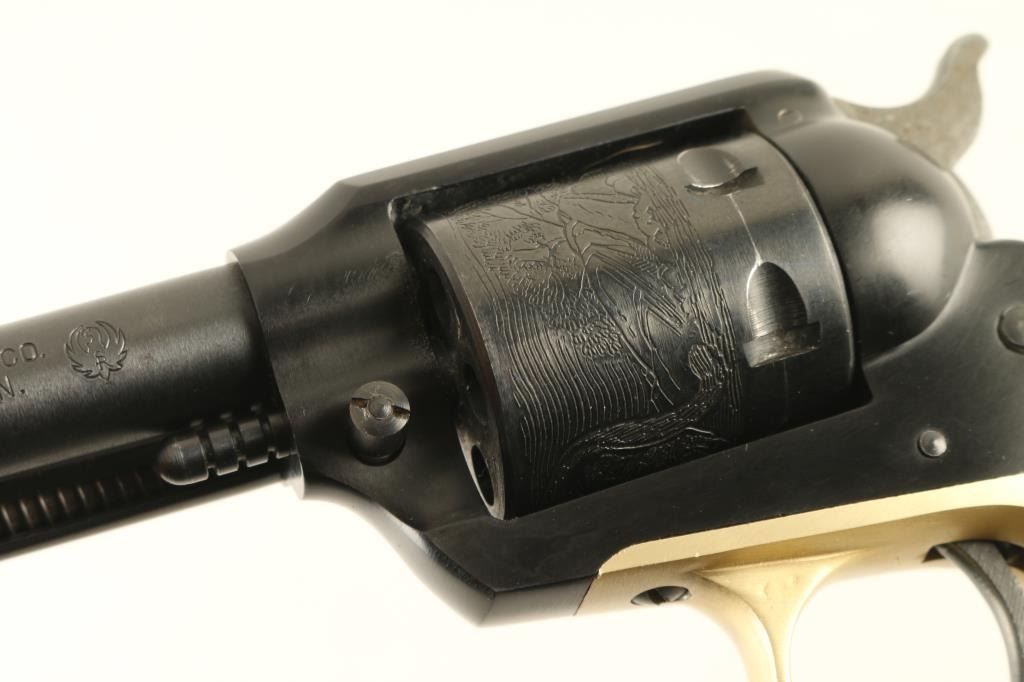 'Old Model' Single action revolver manufactured circa 1964. Features blued finish, smooth wood grips with silver Ruger medallions, 4" barrel, fixed sights, engraved scene on cylinder. Bore is excellent. Retains 95% blue, with signs of use & handling, some fouling at rear of barrel needs cleaning. Grips are excellent. Action operates smoothly, with good lock-up. Includes good condition two piece yellow color factory box. Condition is NRA Excellent *** C&R Firearm ***