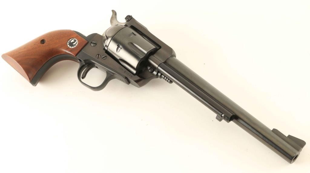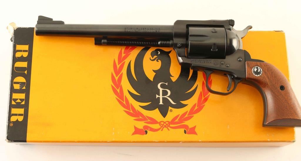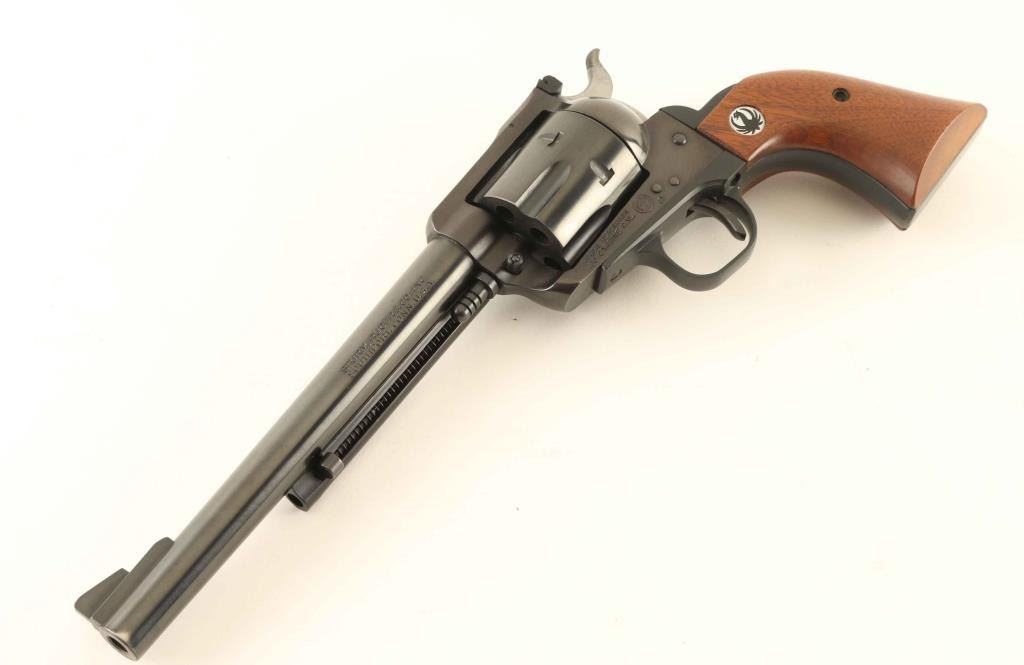 'Three Screw' American made single action revolver chambered in .30 Carbine, manufactured circa 1970. Features a blued finish, 7 1/2" barrel, raised serrated ramp front sight, adjustable rear sight, ejector rod, fluted six-shot cylinder, three-screw frame, smooth thin trigger, serrated hammer spur, black anodized aluminum alloy grip frame and two-piece smooth walnut grips with Ruger medallions. Includes a factory two-piece yellow & black cardboard box with documents. Revolver exhibits approximately 97% of it's original finish showing light muzzle wear, a faint drag line on the cylinder, some small dings on the barrel and the frame turned slightly plum. Action is smooth with tight lock-up, the bore is pristine and the wood grips are fine. Condition is NRA Excellent in box. ***Modern Firearm***