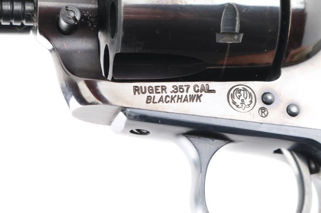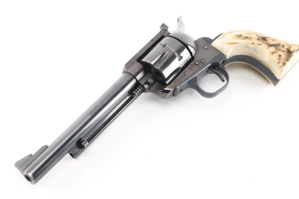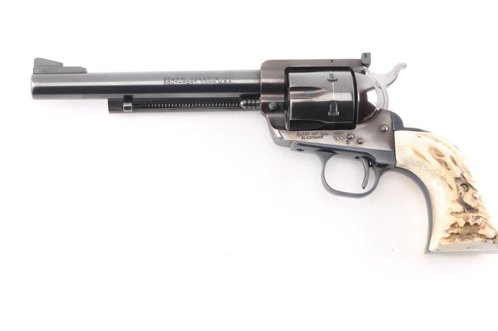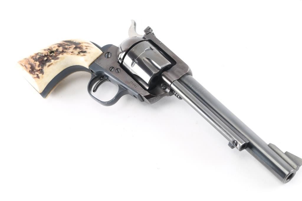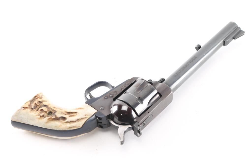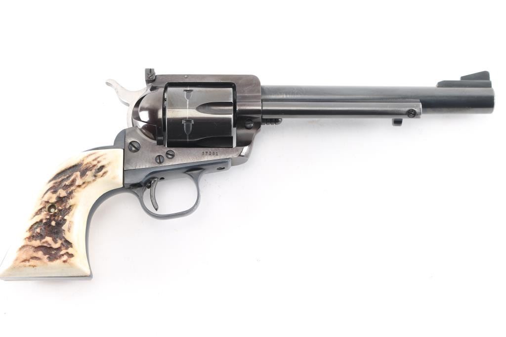 Old Model, Three Screw Vintage American made single action revolver chambered in .357 Magnum, manufactured circa 2013. Features a blued finish, 6 1/2" barrel, raised serrated ramp front sight, Micro adjustable rear sight, smooth thin trigger, serrated hammer spur, fluted six-shot cylinder, flat top three-screw plum colored frame, black finished aluminum alloy grip frame and two-piece faux stag grips. Revolver retains about 90% of its original finish showing muzzle wear and drag wear on the cylinder, holster wear mostly on the barrel and cylinder. Good lock-up, the bore is excellent/bright, grips are excellent..NRA Condition-Very Good+. Modern Firearm.