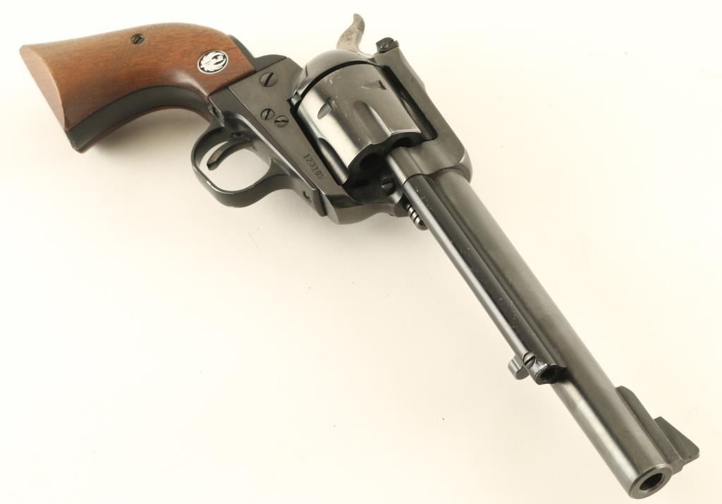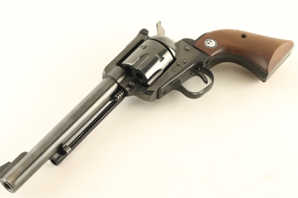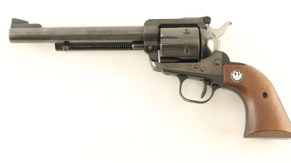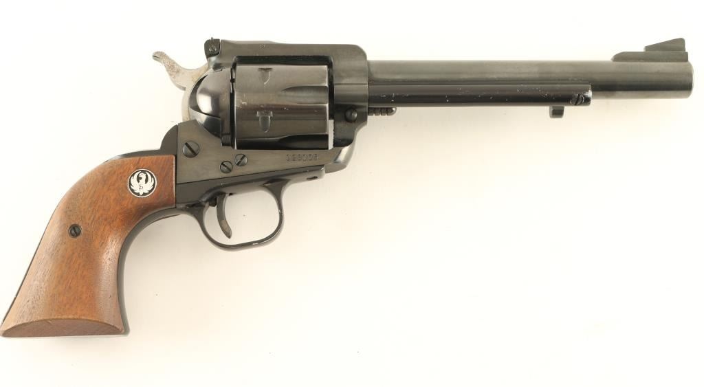 Old Model (three screw) single action revolver features 6.5" barrel, adjustable sights, side gate loading 6 shot cylinder, ejector rod under barrel. Bore and charge holes are very good condition. Retains 85% finish with bare metal showing on sides of muzzle and at sharp edges. Wood grips with nickel color Ruger medallions are very good condition. Condition is NRA Very Good *** Modern Firearm ***