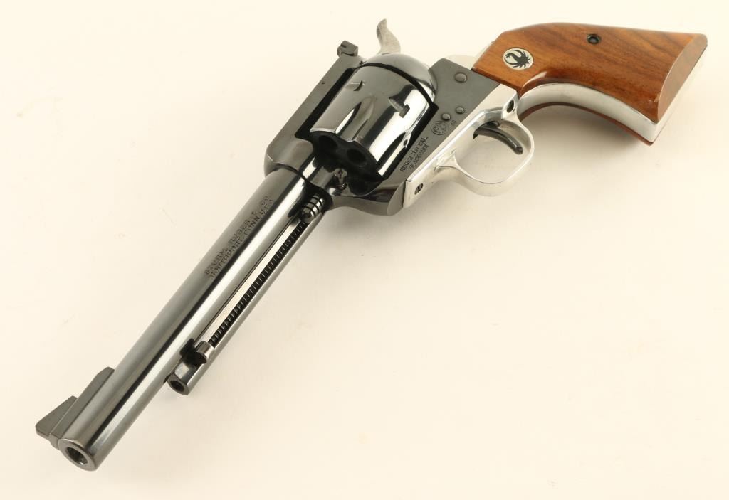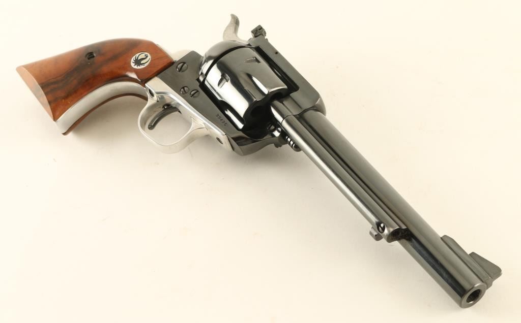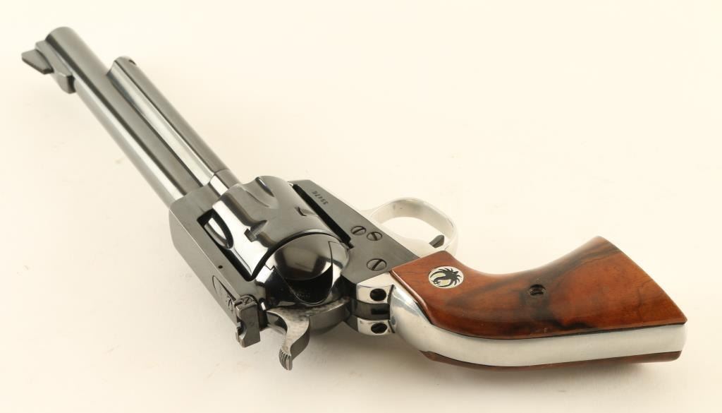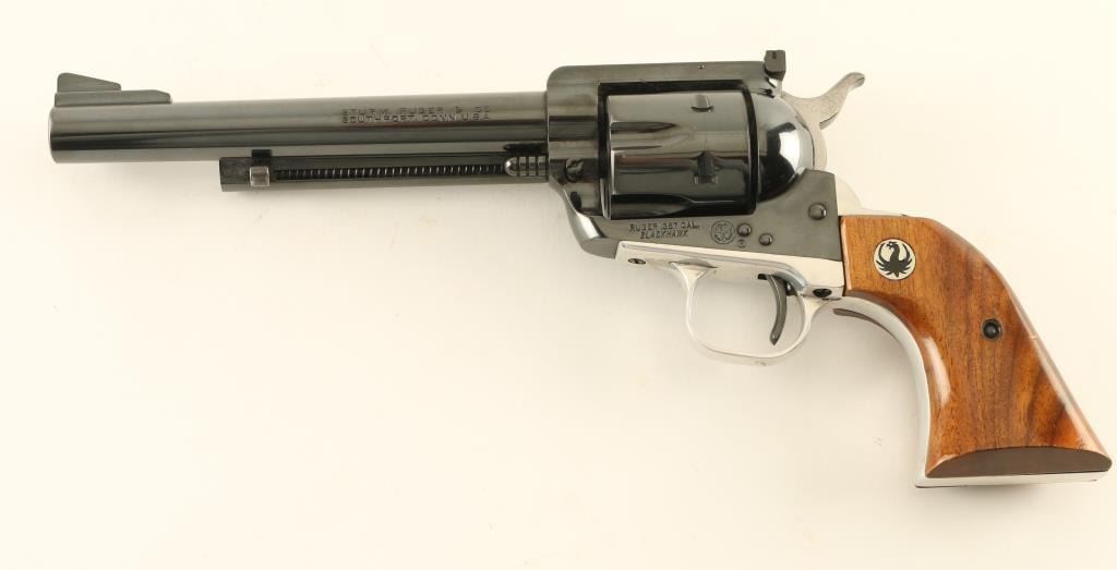 "3 Screw" Single action revolver features blued finish, bright aluminum grip frame, smooth wood grips with silver & black Ruger logo medallions, 6.5" barrel, adjustable sights, ejector rod under barrel. Bore is very good condition. Retains 90% blue (appears reblued) with some thinning or bare metal showing at muzzle, on sharp edges, cylinder drag line. Grip frame is very good condition as stripped of finish. Sides of hammer have been polished in jeweled pattern. Grips are very good. Condition is NRA Very Good - as reblued *** Modern Firearm ***