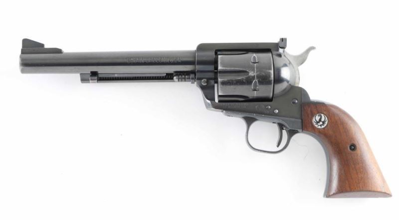 Old Model, Three Screw' Vintage American made single action revolver chambered in .44 Magnum, manufactured circa 1958. Features a blued finish, 6 1/2" barrel, raised serrated ramp front sight, Micro adjustable rear sight, smooth thin trigger, serrated hammer spur, fluted six-shot cylinder with counterbored chambers, ejector rod with dimpled button, flat top three-screw frame, black finished aluminum alloy grip frame and two-piece smooth walnut grips with Ruger medallions. Revolver retains most of it's original blued finish showing scattered light handling marks and drag wear on the cylinder. with a ding in the bottom of the grip frame and loss of blue on backstrap. Good lock-up, the bore appears very good and the wood grips are good. Condition is NRA Good++ C&R Firearm