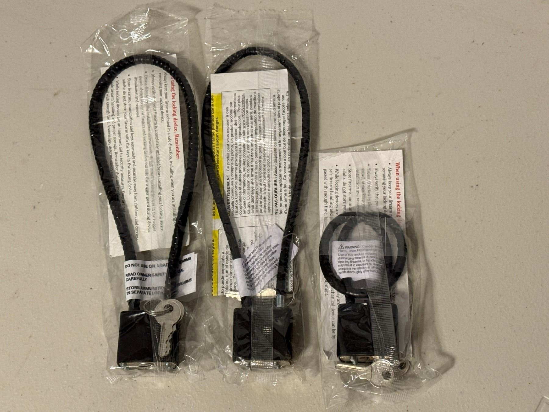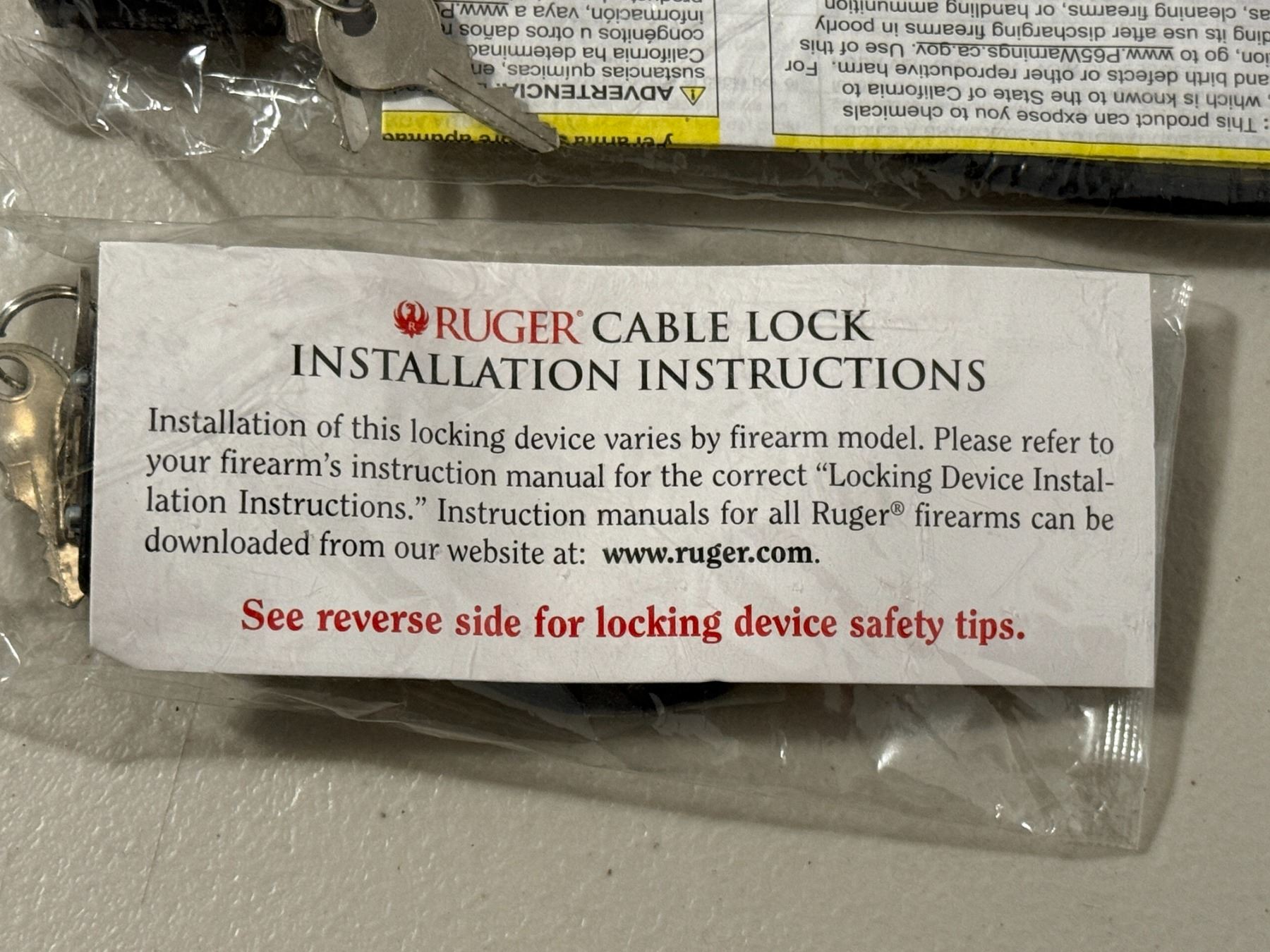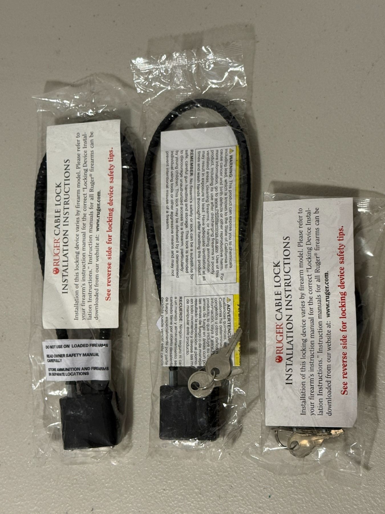 Three Ruger-branded cable firearm locks with keys, new in original packaging. Ideal for safe storage and transport.