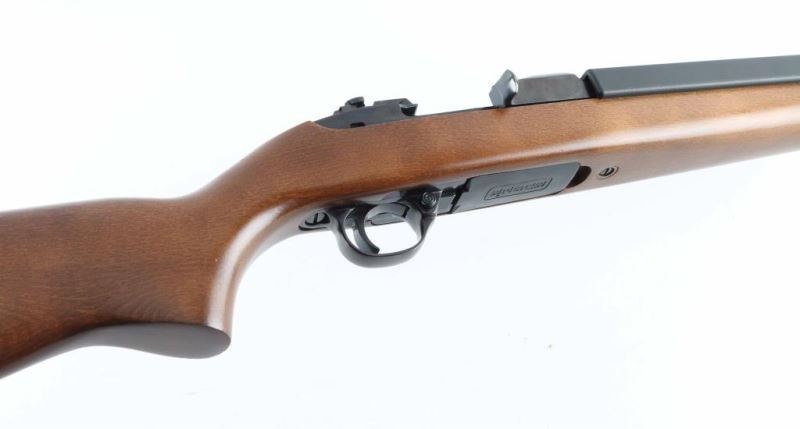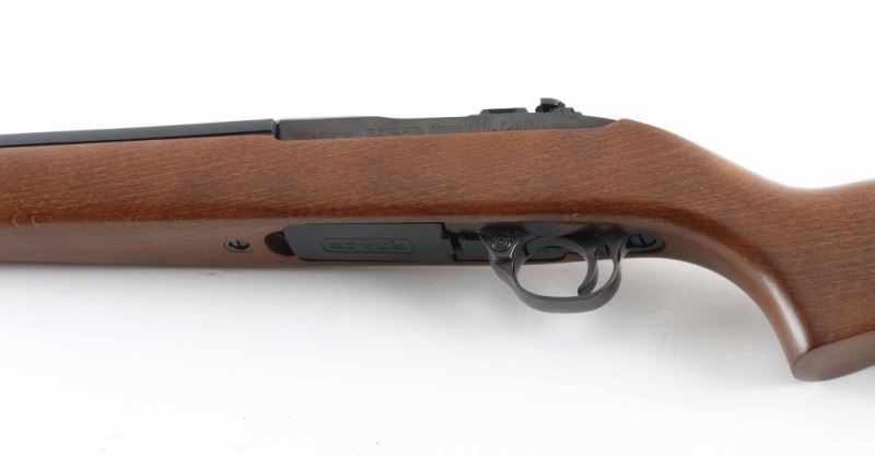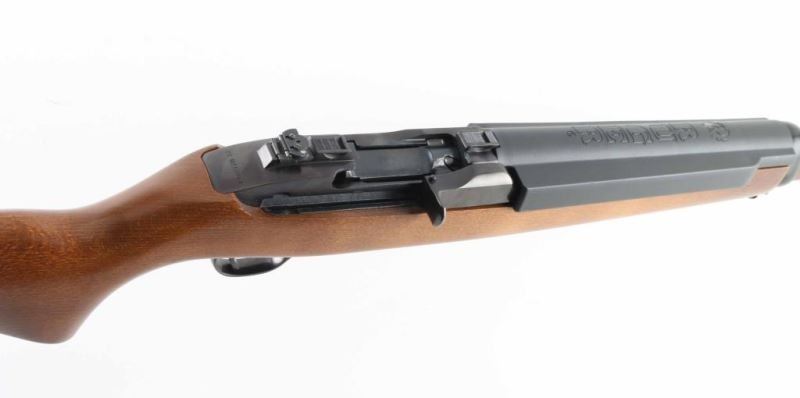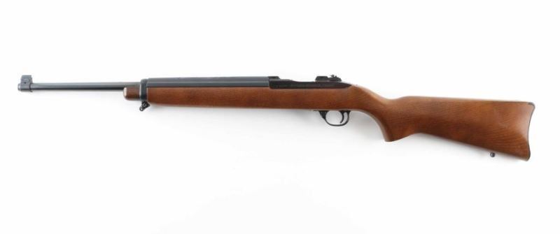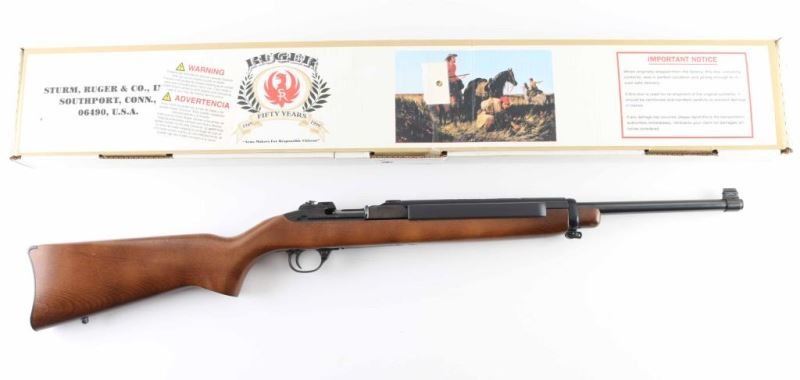 Rotating-bolt short-stroke gas-piston operated semi-automatic rifle chambered in .44 Magnum, manufactured in Southport, CT circa 2001. The Deerfield Carbine replaced the earlier Ruger Model 44 Deerstalker rifle, it was introduced in 2000 and discontinued in 2006. Features a blued finish, 18.5” tapered barrel, blade front sight with brass bead, adjustable folding aperture rear sight, investment cast receiver with integral scope bases, smooth trigger, cross-bolt safety, detachable 4 round rotary magazine, swivel studs, black synthetic handguard and smooth birch pistol grip shoulder stock with black synthetic carbine buttplate. Includes the original factory cardboard box. Rifle retains approximately 98% of its original finish showing light wear on the bolt with little wear observed elsewhere. Action is smooth, the bore is excellent and the wood stock is fine with some small blemishes. Condition is NRA Excellent. ***Modern Firearm***