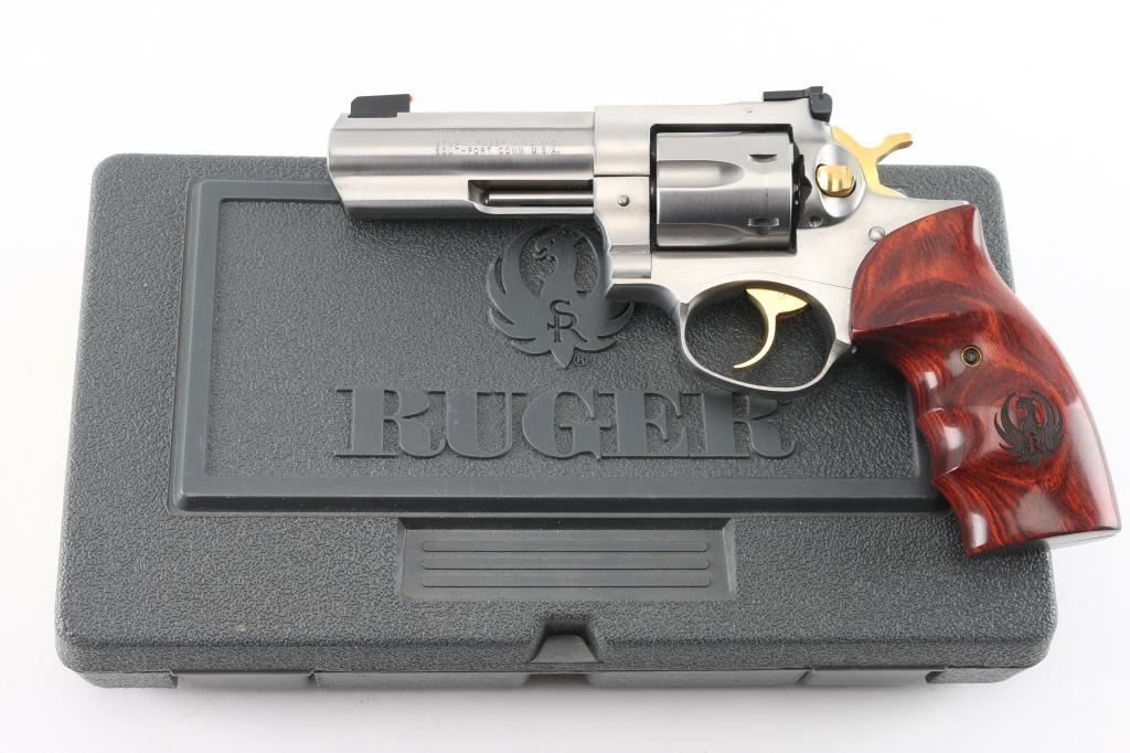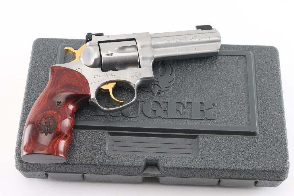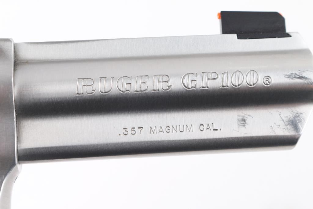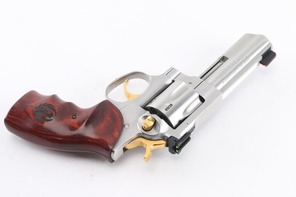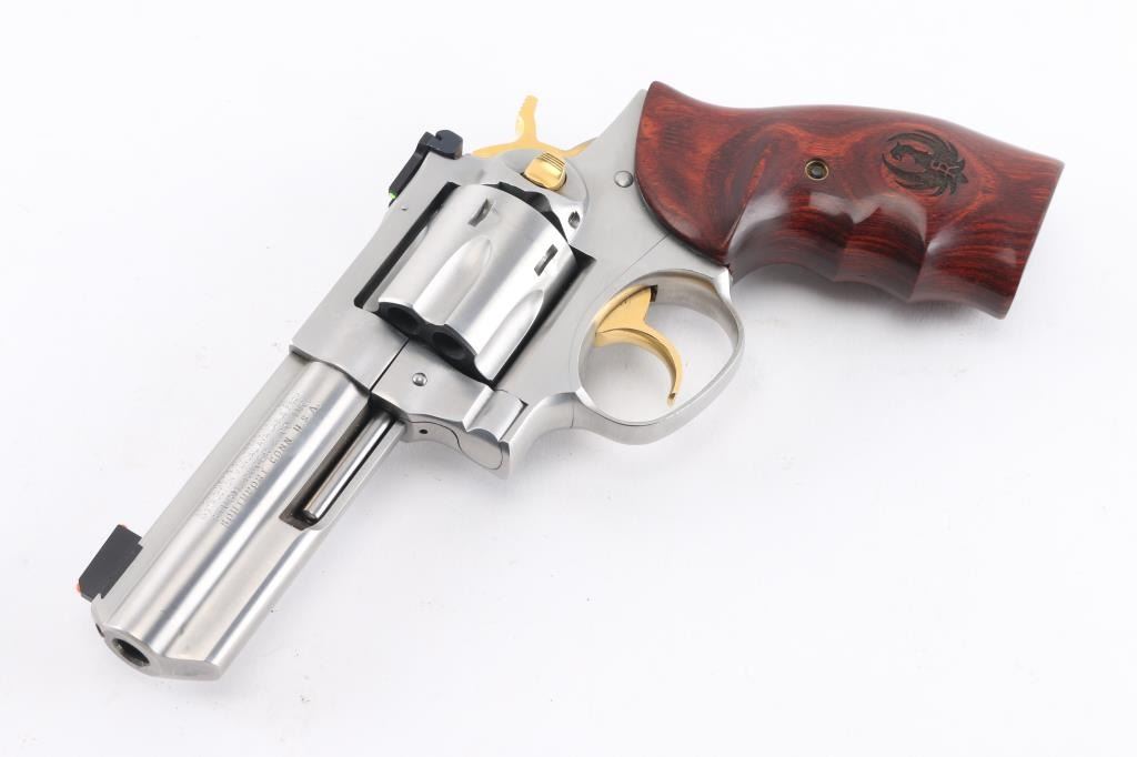 American made stainless steel double action six shot revolver chambered in .357 Magnum, manufactured circa 2001. Features a brushed finish, 4" full lug and full serrated rib barrel with three dot sights - a dovetailed Patridge front sight with orange Hi-Viz insert, pinned adjustable square notch rear sight with two green Hi-viz inserts, smooth gold colored trigger, knurled hammer spur and cylinder release button. Fluted six-shot cylinder and smooth wood target grips with laser etched Ruger logos. Bore is bright with strong rifling. Retains approx. 98% metal finish with light scratches at the muzzle and little to no handling marks. Grips are excellent condition. Action is smooth with tight lock-up. Includes original factory gray plastic case, manual and lock. Condition is NRA excellent. ***Modern Firearm***