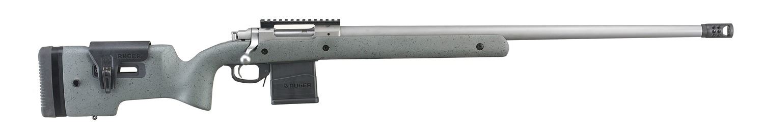 This is a Ruger Hawkeye Long-Range Target Bolt-Action rifle is 6.5 Creedmoor caliber with a 26” barrel and speckled gray laminate stock. Non-rotating, Mauser-type controlled round feed extractor is among the most positive case extraction systems ever invented, and features a fixed blade-type ejector that positively ejects empty cases as the bolt is moved fully rearward. Scope mounts are machined directly on the solid-steel receiver. Heavy-contour target barrel features a Ruger Precision® Rifle Hybrid Muzzle Brake to reduce recoil, noise, and blast to the sides of the shooter. Two-tone target stock features a two-way adjustable comb, adjustable length of pull with soft rubber buttpad, QD attachment points and flush-mounted lower M-LOK® rail. Comes with a 10-round capacity magazine.