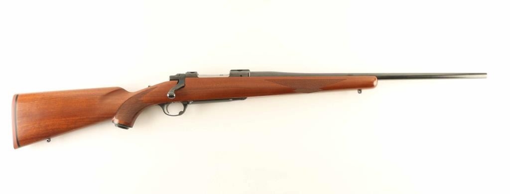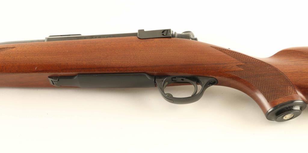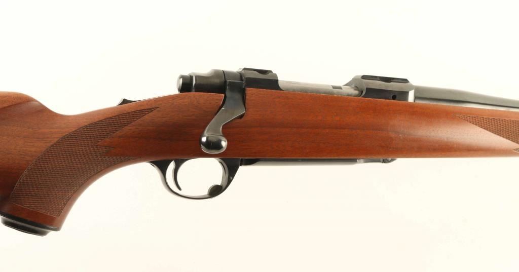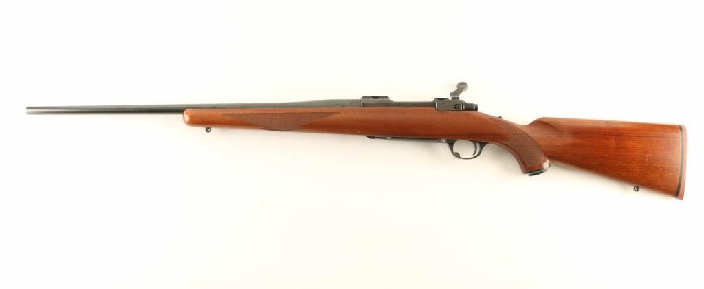 Bolt action rifle features blued finish, wood stock with checkered panels at forend & curved wrist, no cheekpiece, thin solid rubber recoil pad, sling studs, 22" barrel, no sights, hinged floorplate, manual safety. Bore is very good condition. Retains 95% blue with some scratches and scuffs. Wood is very good to excellent condition with dents & scratches. Condition is NRA Very Good ++ *** Modern Firearm ***