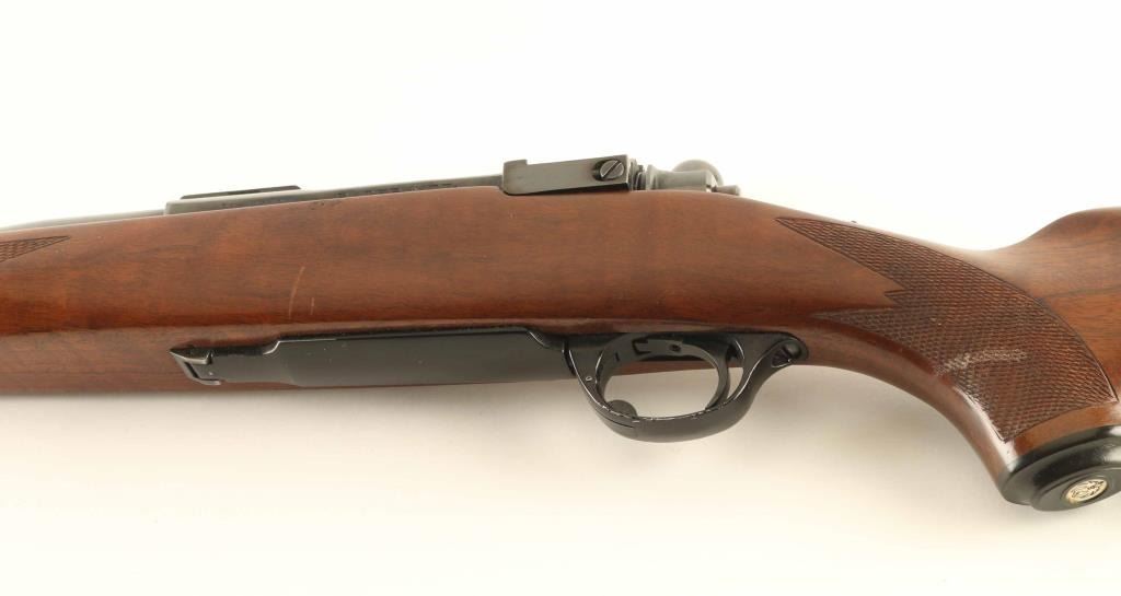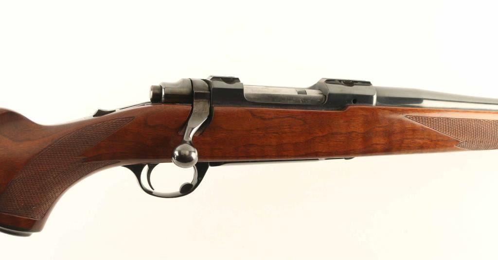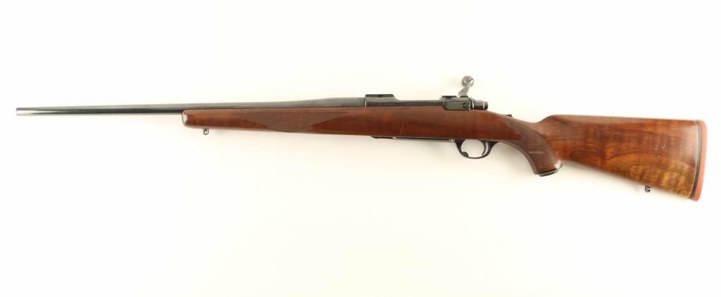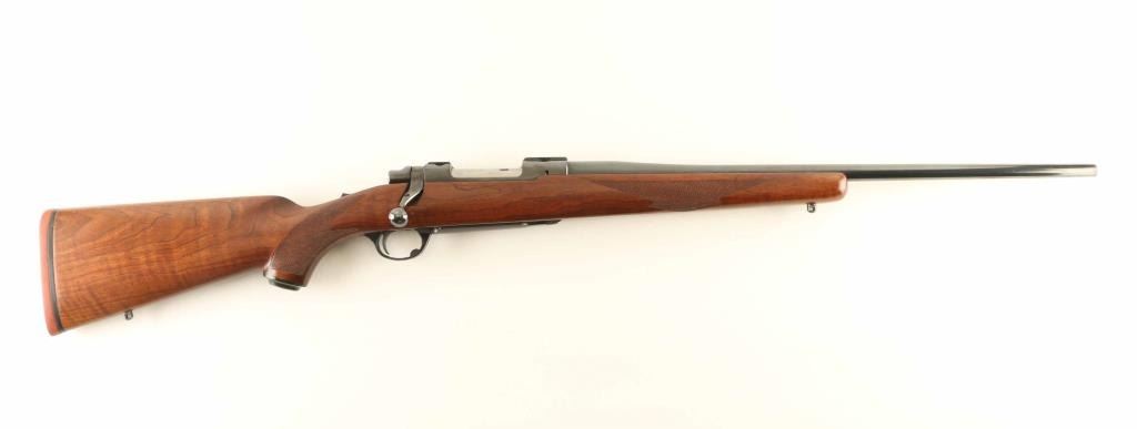 Bolt action rifle features blued finish, fancy figured walnut stock with checkered panels at forend & curved wrist, no cheekpiece, thin solid rubber recoil pad, sling studs, 22" barrel, no sights, hinged floorplate, manual safety. Bore is excellent condition. Retains 90% blue with scratches and scuffs. Wood is very good condition with dents & scratches. Condition is NRA Very Good ++ *** Modern Firearm ***