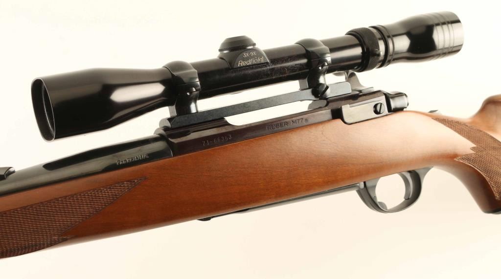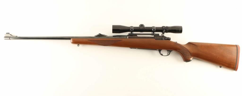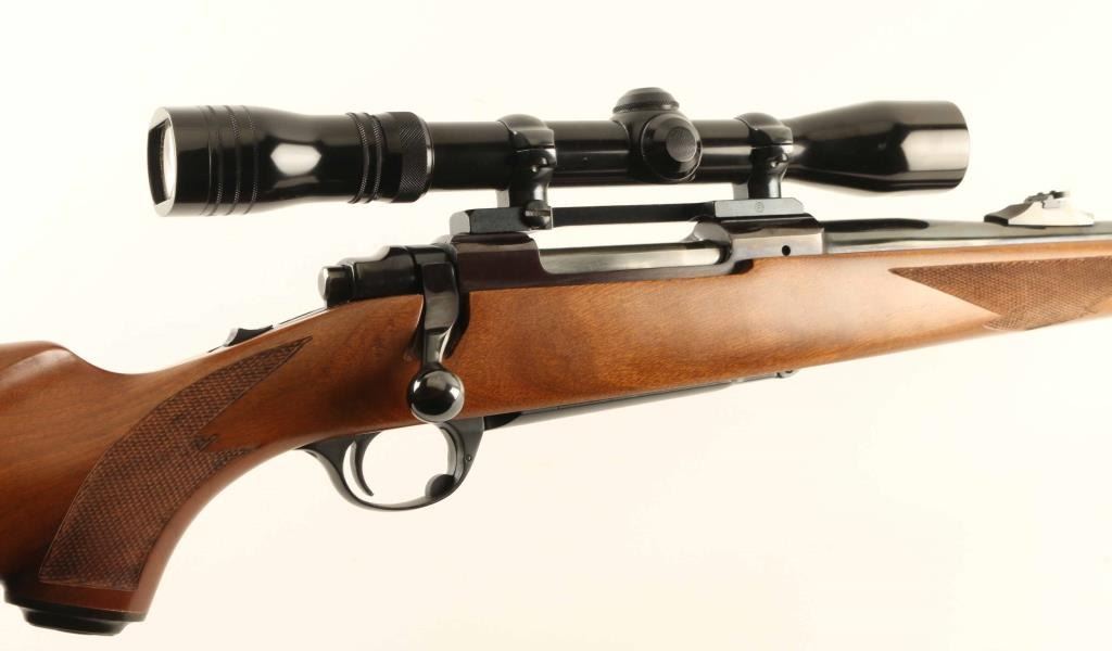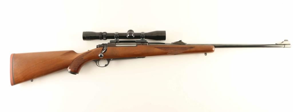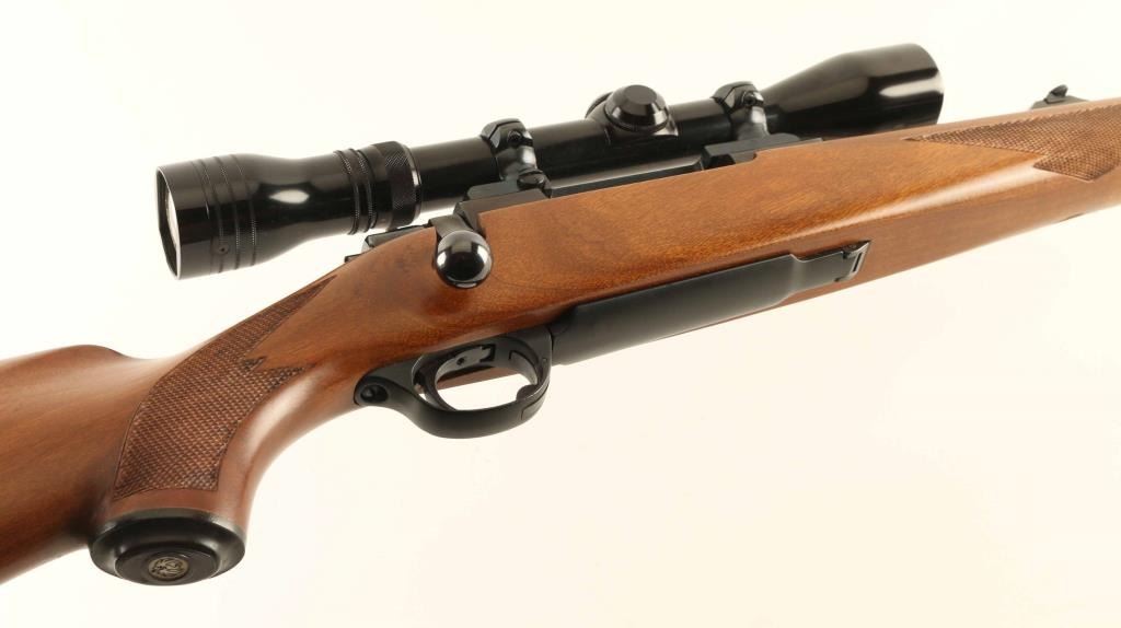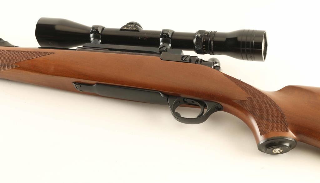 "Round Top' Bolt action rifle features blued finish, wood stock with checkered panels at forend & curved wrist, no cheekpiece, thin solid rubber recoil pad, sling studs, 23" barrel, blade front sight and flip down adjustable rear sight, hinged floorplate, manual tang safety. Bore is very good condition. Retains 95% blue. Wood is very good to excellent condition with no dents, dings or scratches. Older Redfield 3-9 scope mounted. Condition is NRA Very Good ++ *** Modern Firearm *** Modern Firearm