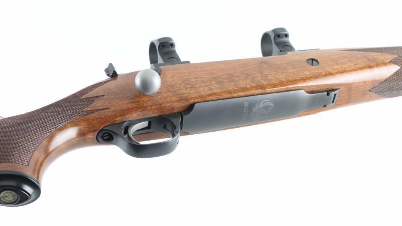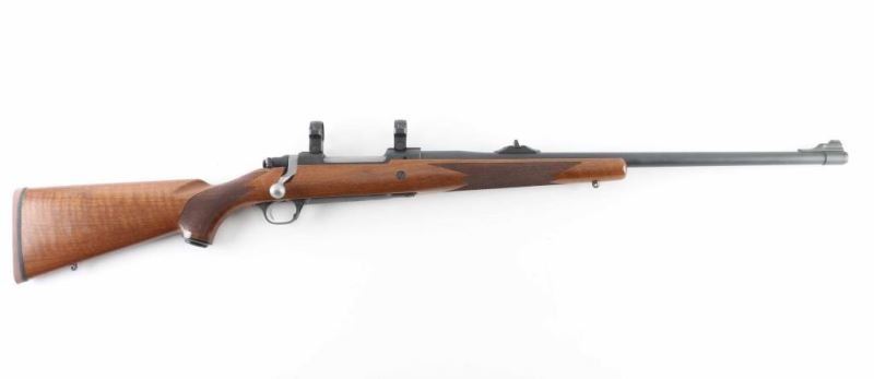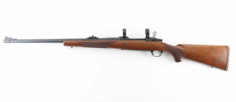 American made bolt action sporting rifle chambered in .375 Ruger circa 2008. Features a matte blued finish, 23" tapered barrel, ramped blade front sight with white bead, express style rear sight with one fixed leaf & one folding leaf, integral scope ring cuts in the receiver, smooth trigger, three position safety on the right side of the receiver, internal box magazine with hinged floorplate, and checkered walnut pistol grip shoulder stock with forend cap, swivel studs, factory grip cap. Rifle retains the majority of it's matte finish showing scattered scuffs, a few light scratches and slide wear on the bolt. Stock is in good shape with no marring, scuffs or scratches but there is a black sticky substance on a small section of the butt stock. Comes with scope rings. NRA Very Good Modern Firearm