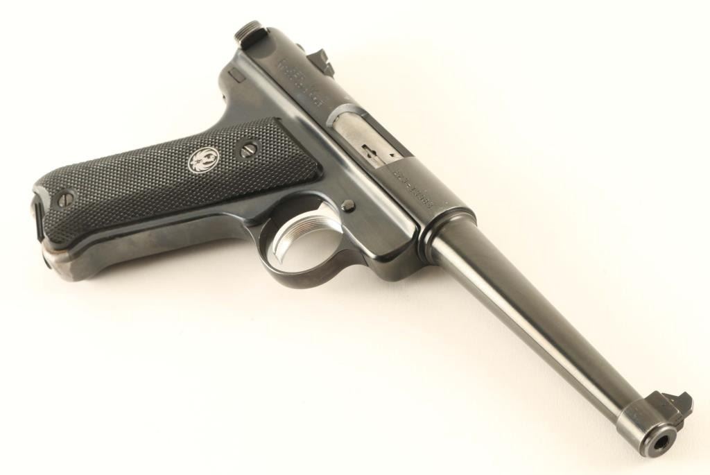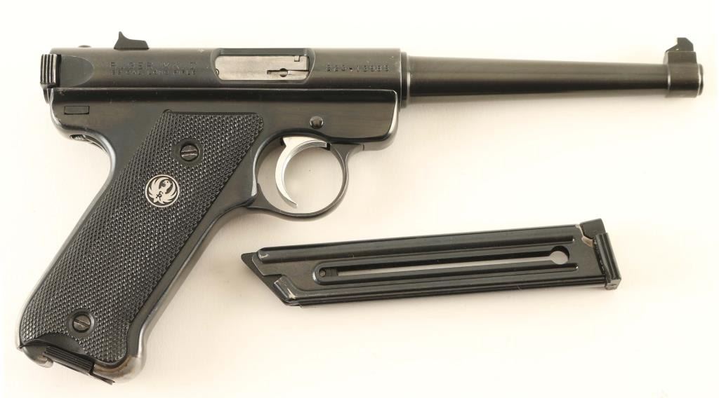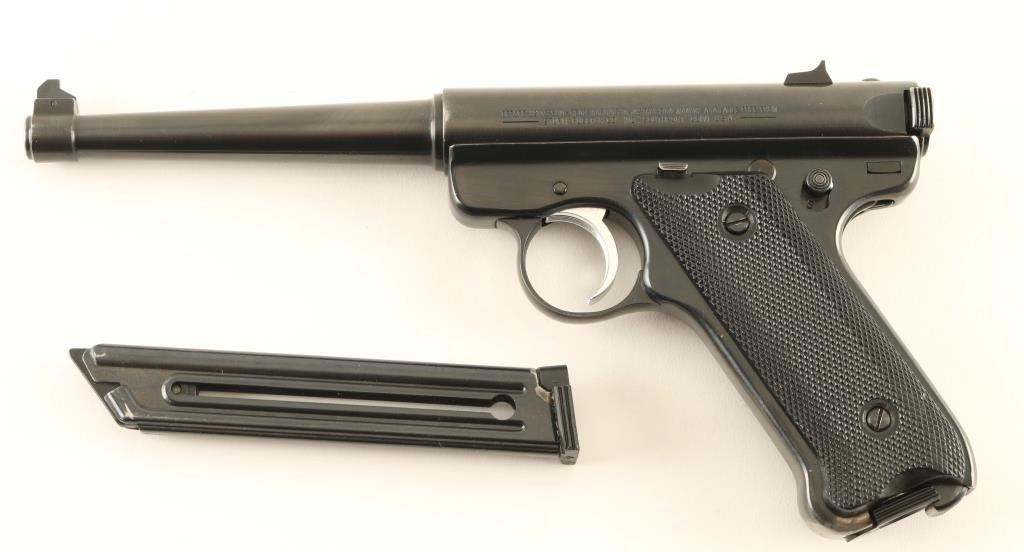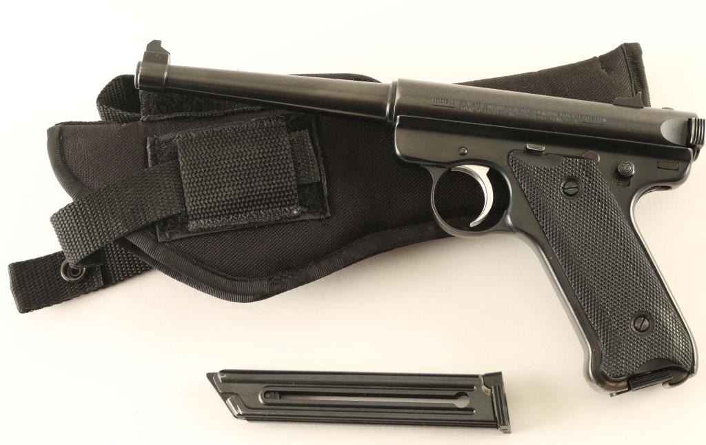 Single action semi-automatic rimfire pistol chambered in .22 Long Rifle, manufactured in Southport, CT circa 1999. Features a blued finish, 6" tapered barrel, patridge front sight with green painted accent, dovetailed rear sight with square notch, serrated trigger, concealed hammer, manual safety on the left side of the frame, bolt catch on the left side of the frame, heel magazine release, factory 10 round magazine, steel frame and two-piece checkered black synthetic grips with silver/black medallion in the right panel. Includes a KNJ black nylon holster with spare magazine. Pistol retains approximately 95% of its original blued finish showing edge wear, scattered handling marks and finish loss on the grip straps. Action is sound, the bore is pristine and the synthetic grips are very good. Condition is NRA Very Good to Excellent. ***Modern Firearm***