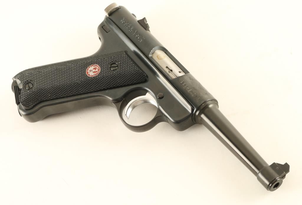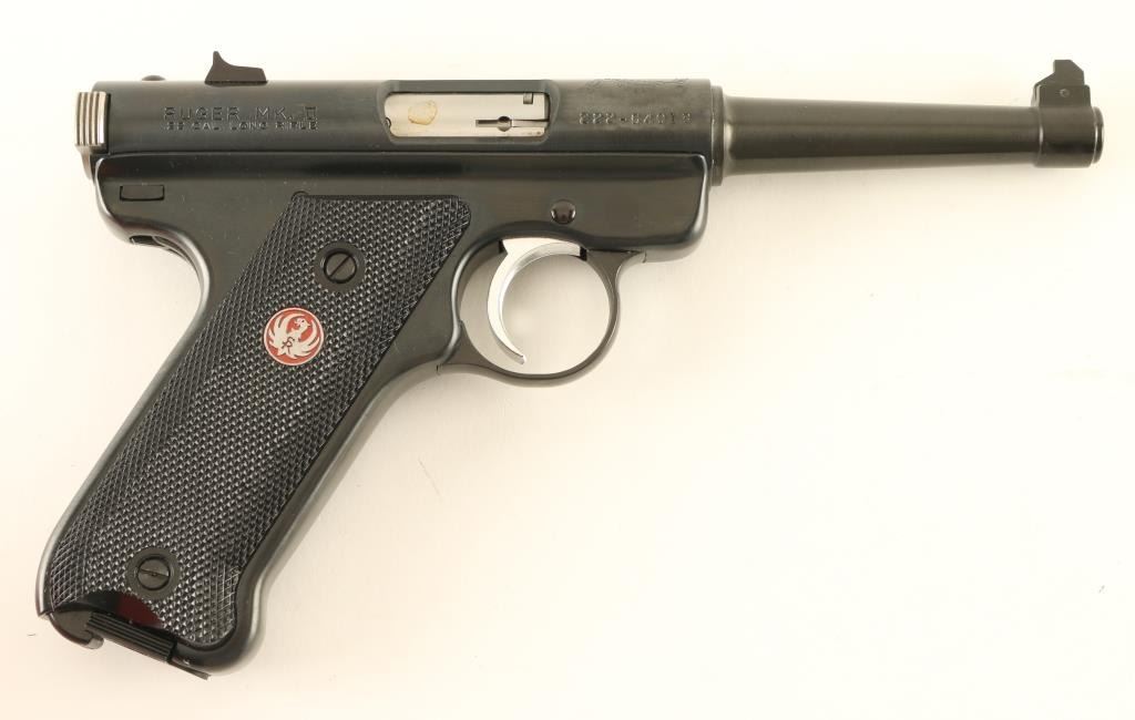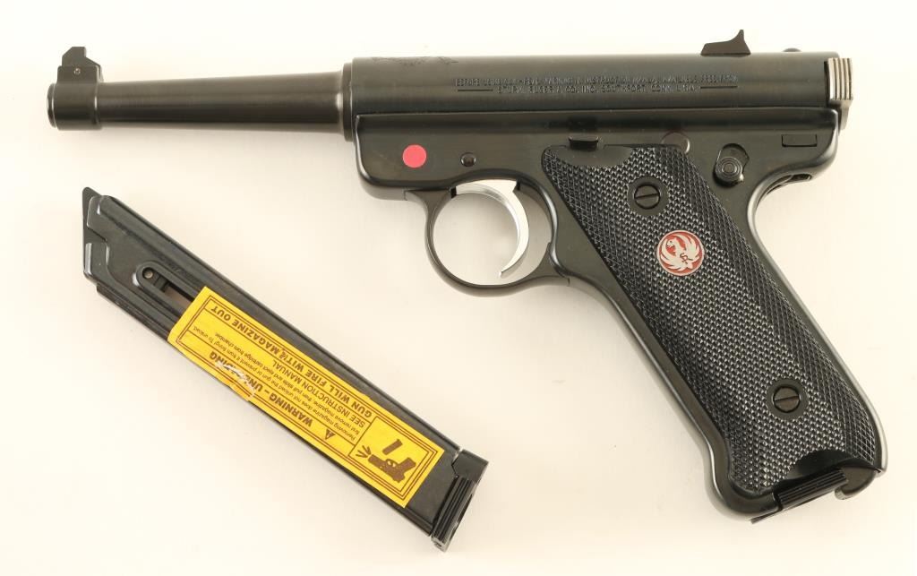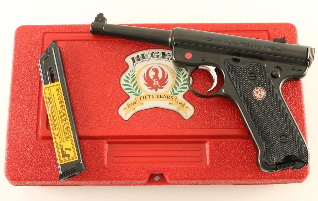 "50 YEARS" engraved receiver with Ruger logo across top. Semiautomatic rimfire pistol features blued finish, nickel accent trigger, 4.75" barrel, fixed sights, manual safety, heel magazine release, checkered black plastic grips with red & silver Ruger medallions. Condition is like new, few signs of handling, in factory red plastic box, with manual & spare magazine (2 mags total) Condition is NRA Excellent - Like New *** Modern Firearm ***