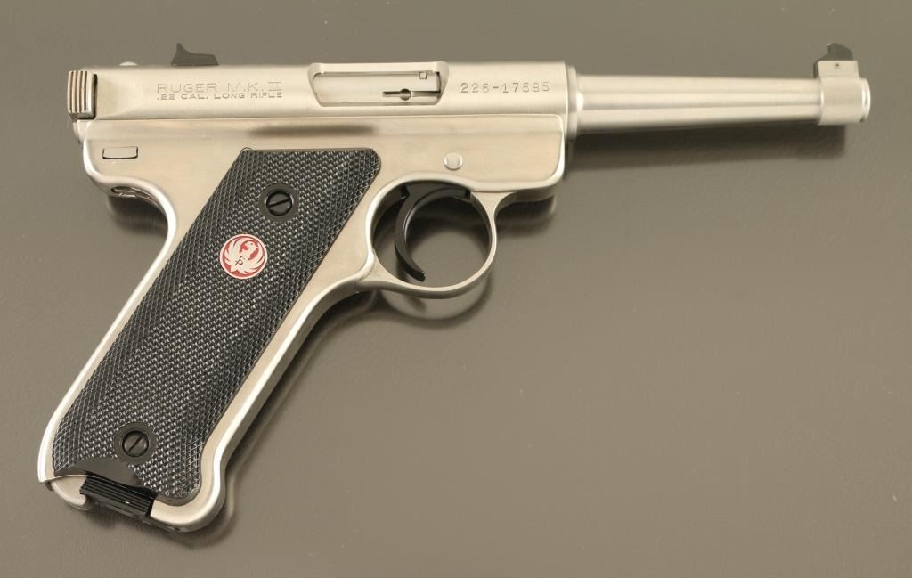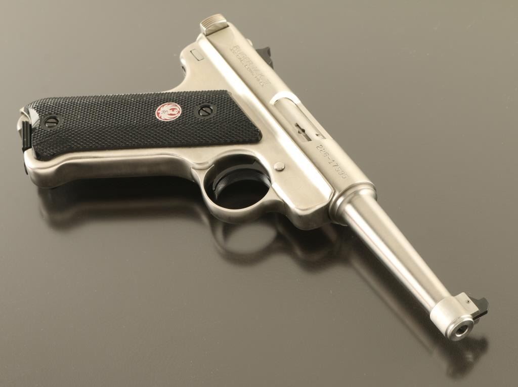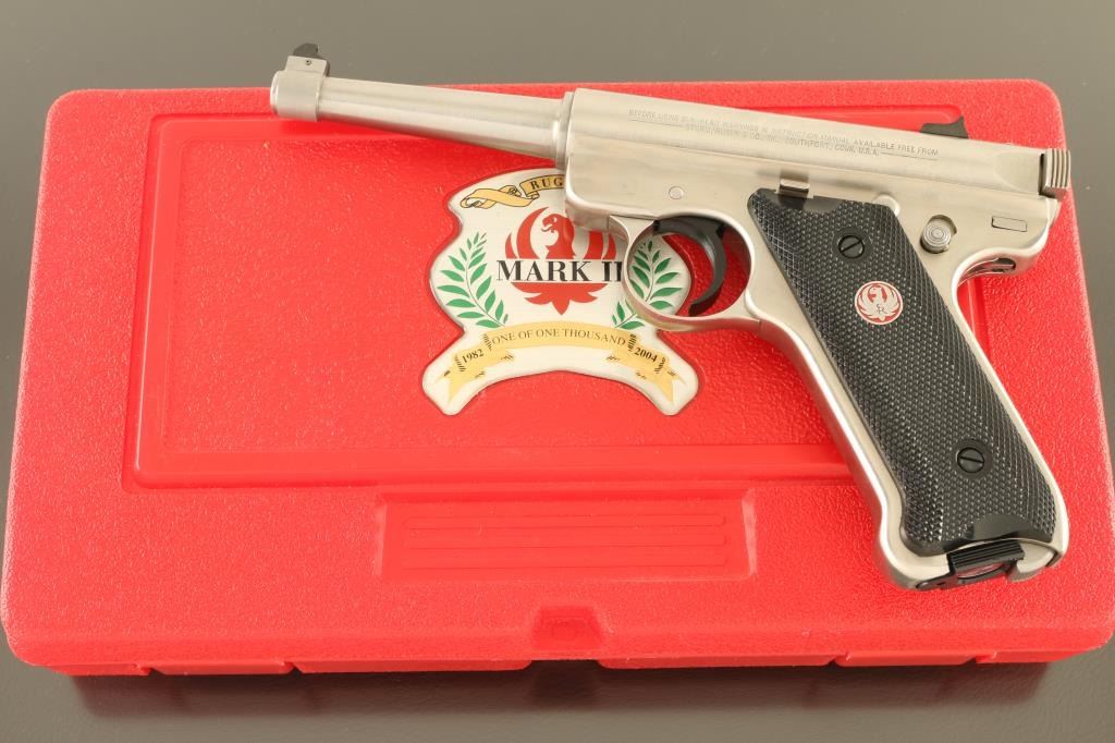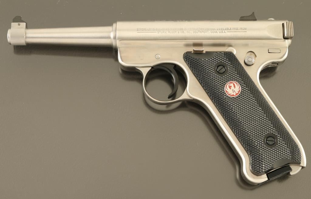 "ONE OF ONE THOUSAND" engraved on receiver. Semiautomatic rimfire pistol features stainless steel construction, blued accent trigger, 4.75" barrel, fixed sights, manual safety, heel magazine release, checkered black plastic grips with red & silver Ruger medallions. Condition is like new, few signs of handling, in factory red plastic box, with manual, one magazine. Condition is NRA Excellent - Like New *** Modern Firearm ***