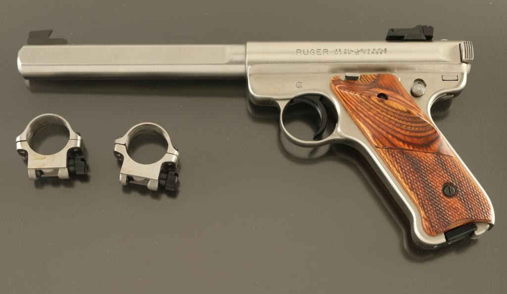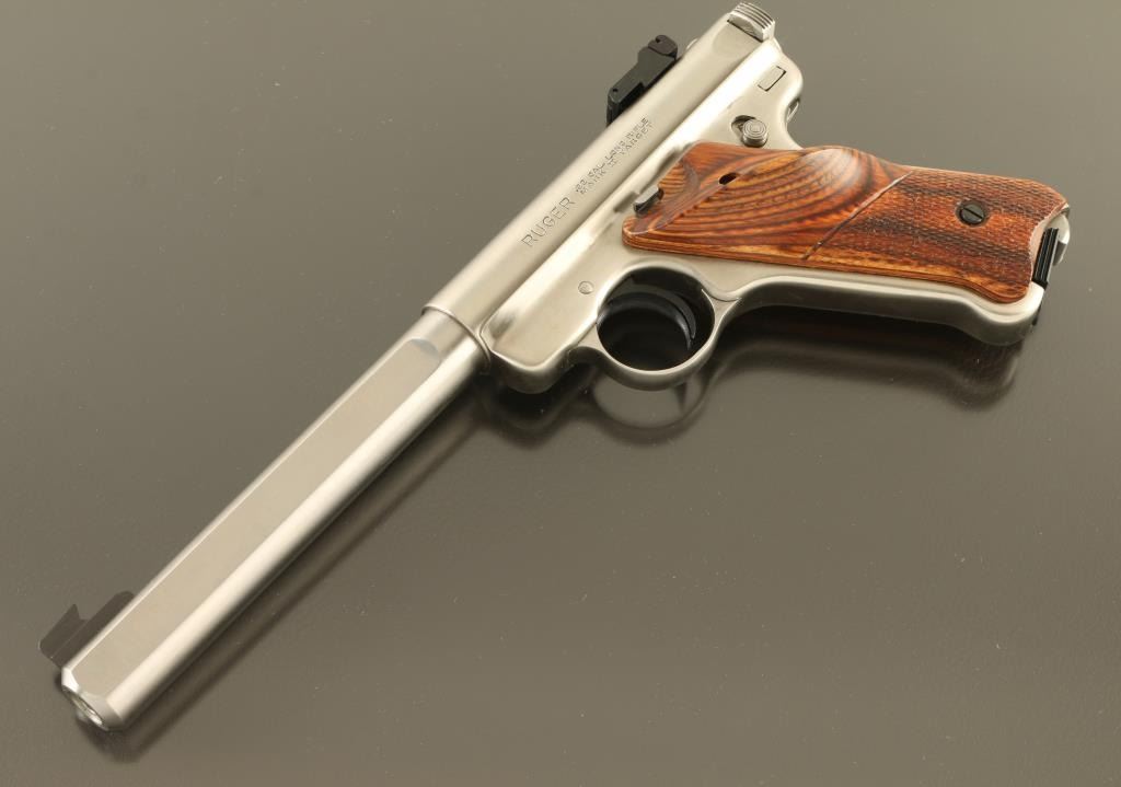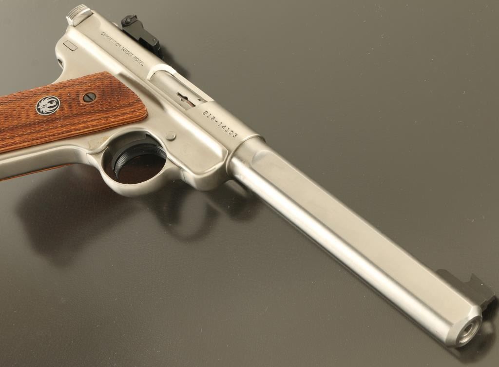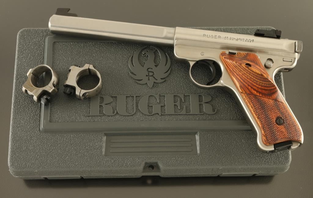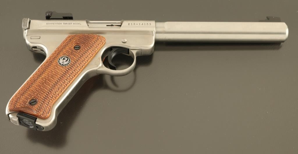 'Competition Target Model' Semiautomatic rimfire pistol features stainless steel construction, blued accent trigger, 6.75" slab sided bull barrel, adjustable sights, manual safety, heel magazine release, checkered wood thumb rest grips with black & silver Ruger medallions. Condition is like new, few signs of handling, in factory gray plastic box with cardboard outer sleeve, with manual & one magazine. Condition is NRA Excellent - Like New *** Modern Firearm ***