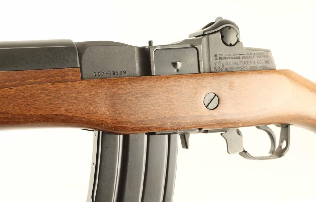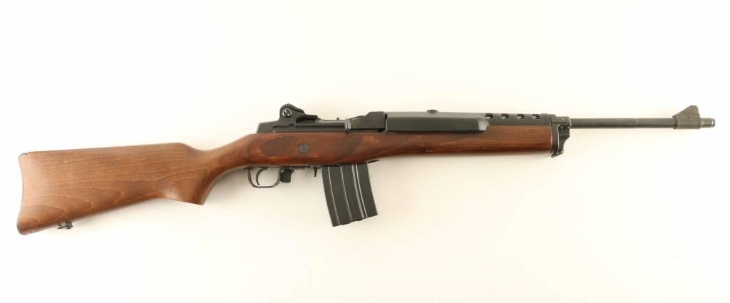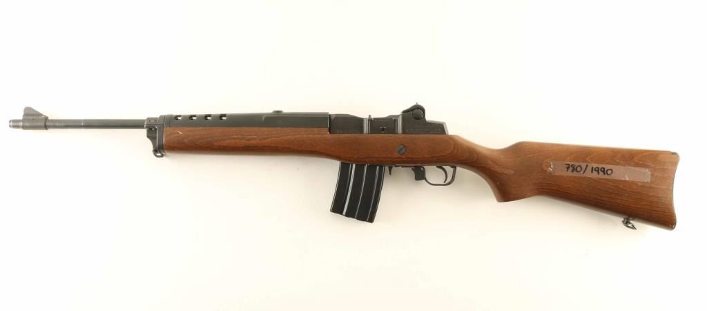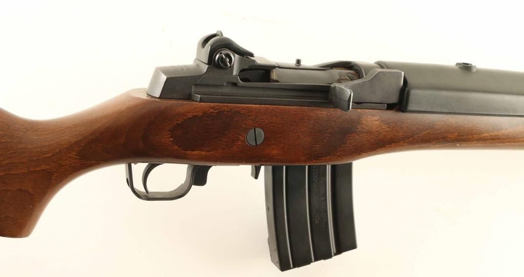 Rifle. Semi-Automatic. Gas-operated, rotating bolt. 18" round barrel, with adjustable rear peep, and front blade sights, Black steel, ventilated handguard. Smooth walnut stock. Blued finish. Bore appears very good, but a little dirty. Action is smooth/tight. Blue finish is about 98% with some minor scratches. Wood is very good with a couple of minor scratches/dings. There is tape on the left stock, with numbers/letters on it. There is a little surface rust on the bolt. Comes with a 15-rd Roger magazine. NRA Condition-Very Good. Modern Firearm.