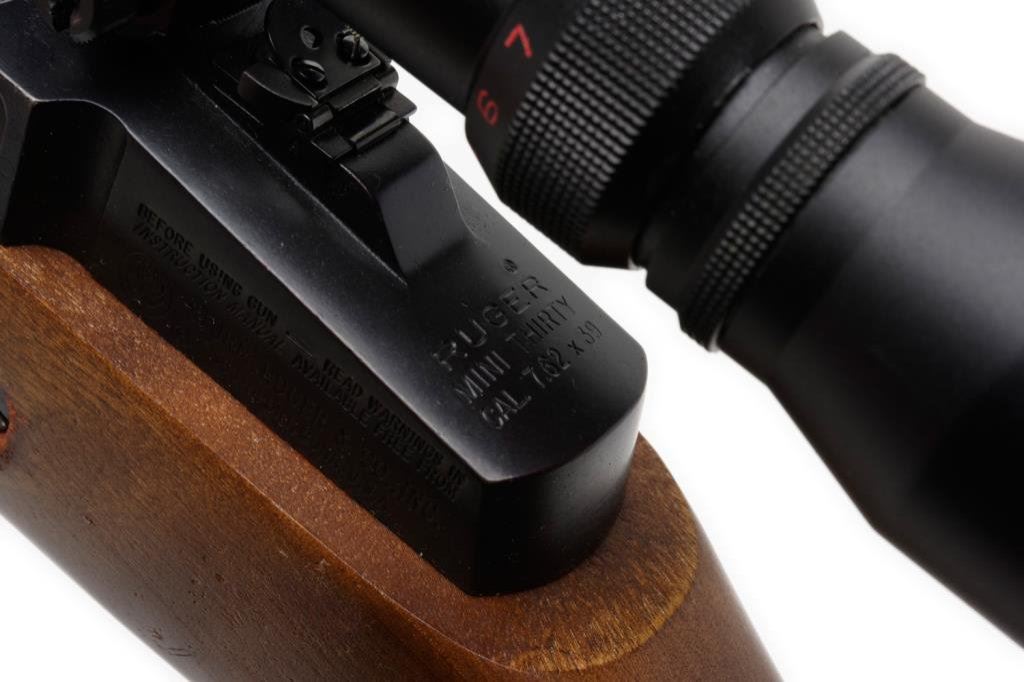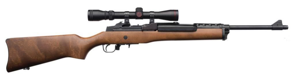 *Ruger Mini-Thirty Model semi-automatic carbine, 7.62 X 39 caliber, 18” barrel, S/N 189-75074, no magazine, mounted with a Simmons 3-9X32 scope displaying crisp optics, black finish, wood stock in overall fine condition showing little use. Est.: $400-$600.