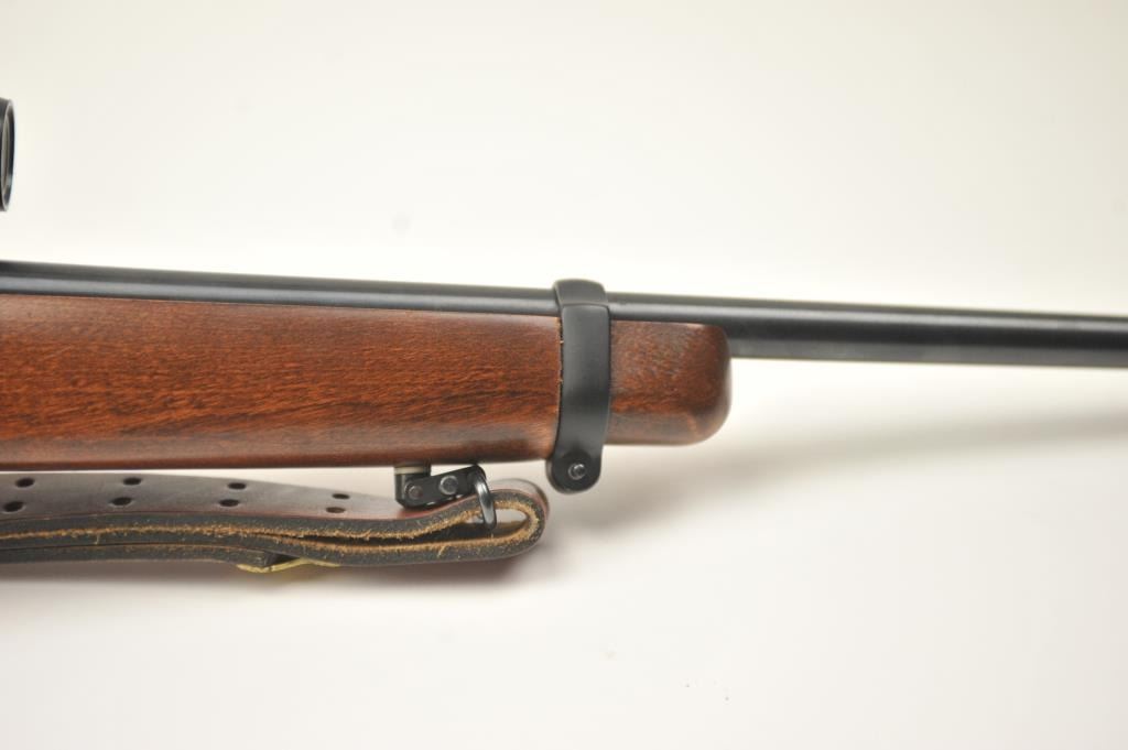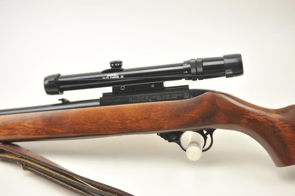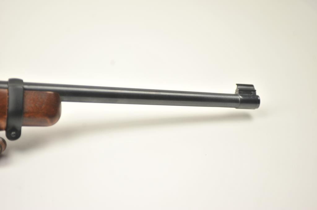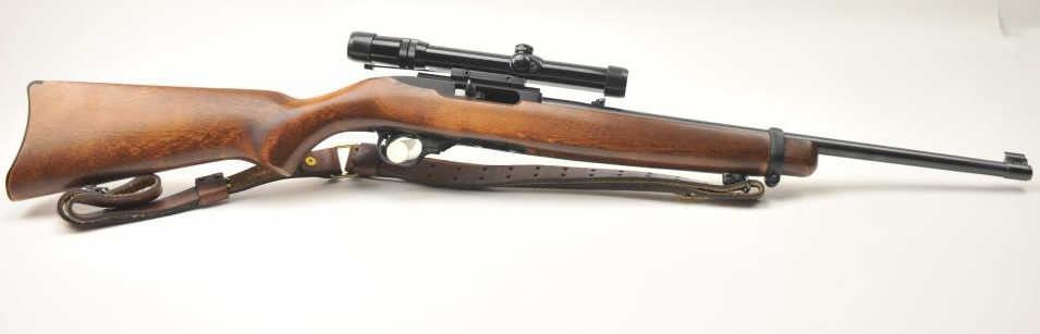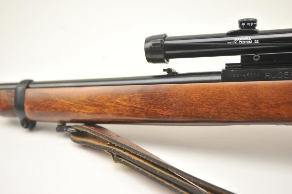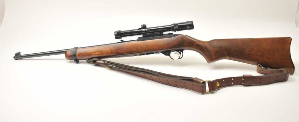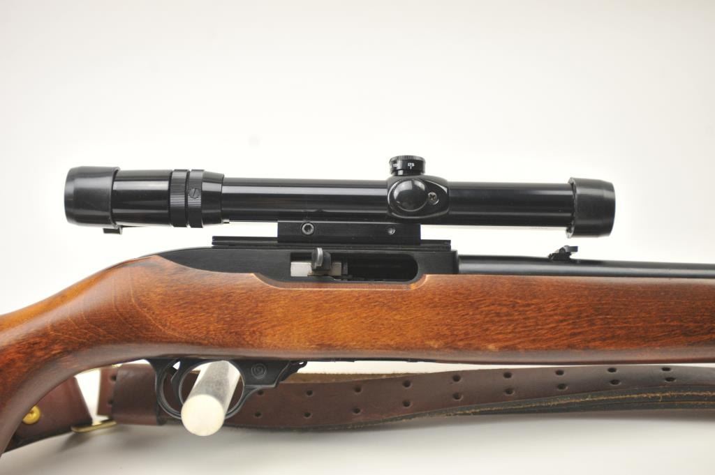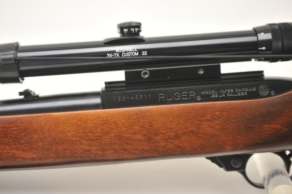 Ruger Model 10-22 semi-automatic carbine, .22 Long Rifle caliber, Serial #122-45711. The carbine is in nearly excellent condition with an 18” barrel with a ramped blade front and folding rear sights. The carbine retainsapproximately 98-99% of the blue finish with only storage marks. The smooth wood stock is in excellent condition showing little use with sling swivels and a leather rifle sling. The bore is very good, the action is crispand the markings are sharp on this lightly used Ruger. The rifle is topped with a Bushnell 3 x 7 Custom .22 variable power scope. The lot includes one correct magazine. Est.: $200-$400. (Modern).