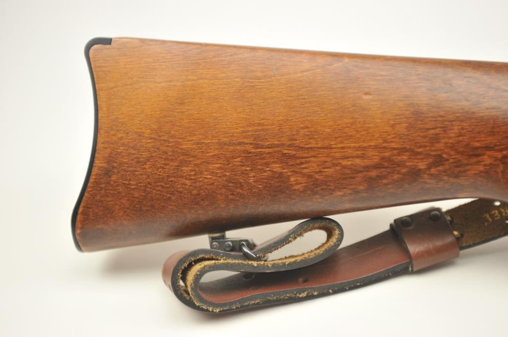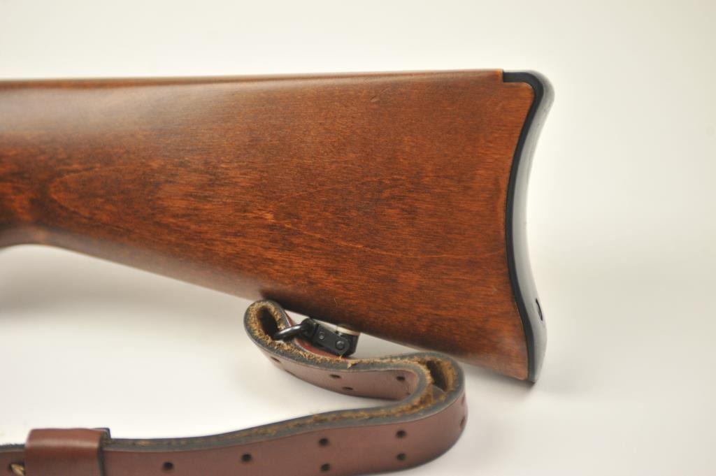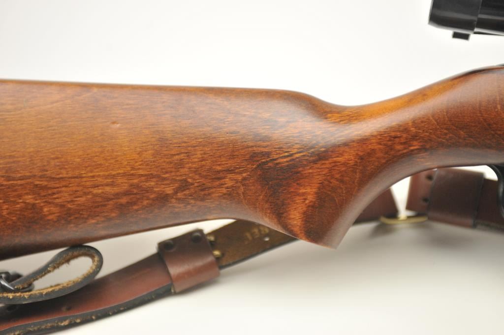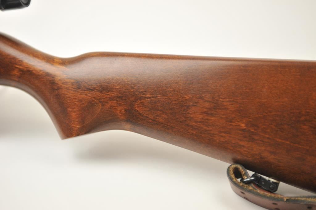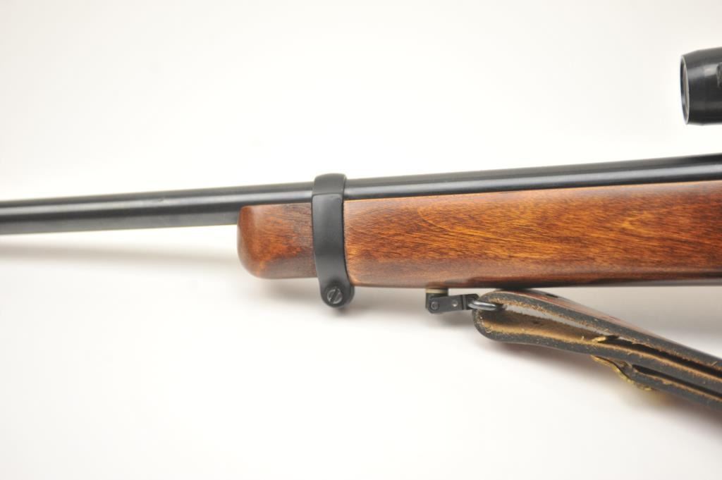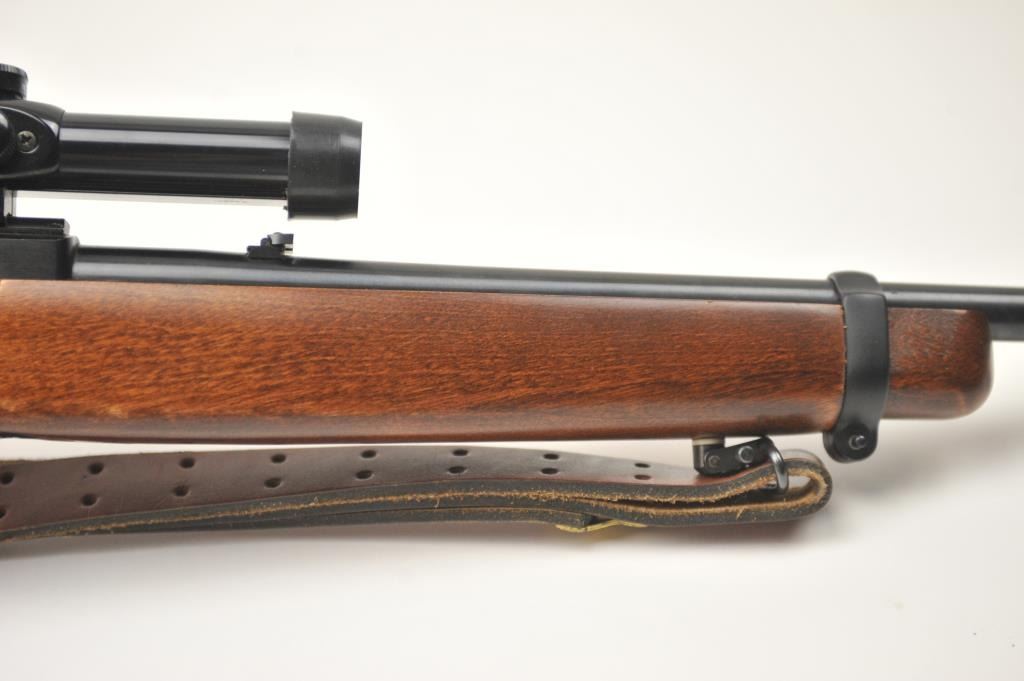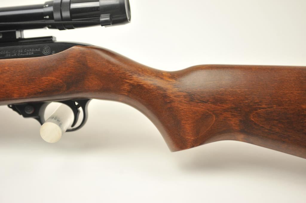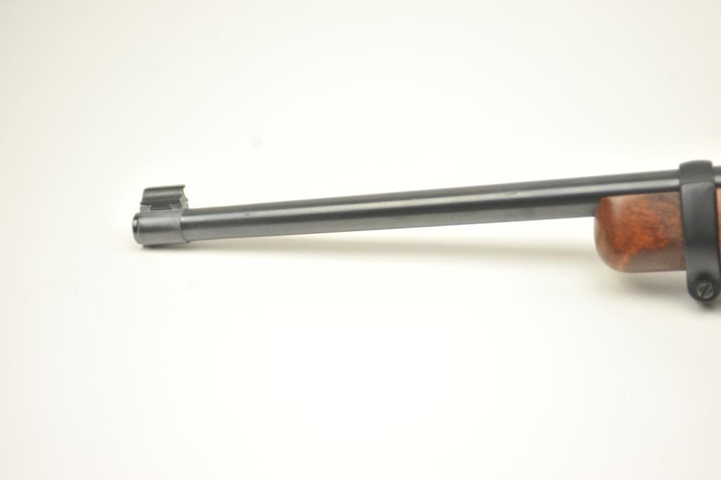 Ruger Model 10-22 semi-automatic carbine, .22 Long Rifle caliber, Serial #122-45711. The carbine is in nearly excellent condition with an 18” barrel with a ramped blade front and folding rear sights. The carbine retainsapproximately 98-99% of the blue finish with only storage marks. The smooth wood stock is in excellent condition showing little use with sling swivels and a leather rifle sling. The bore is very good, the action is crispand the markings are sharp on this lightly used Ruger. The rifle is topped with a Bushnell 3 x 7 Custom .22 variable power scope. The lot includes one correct magazine. Est.: $200-$400. (Modern).