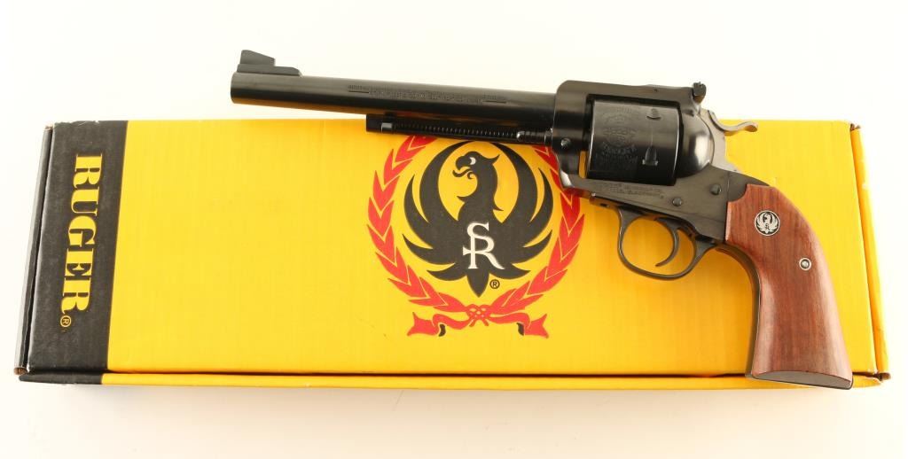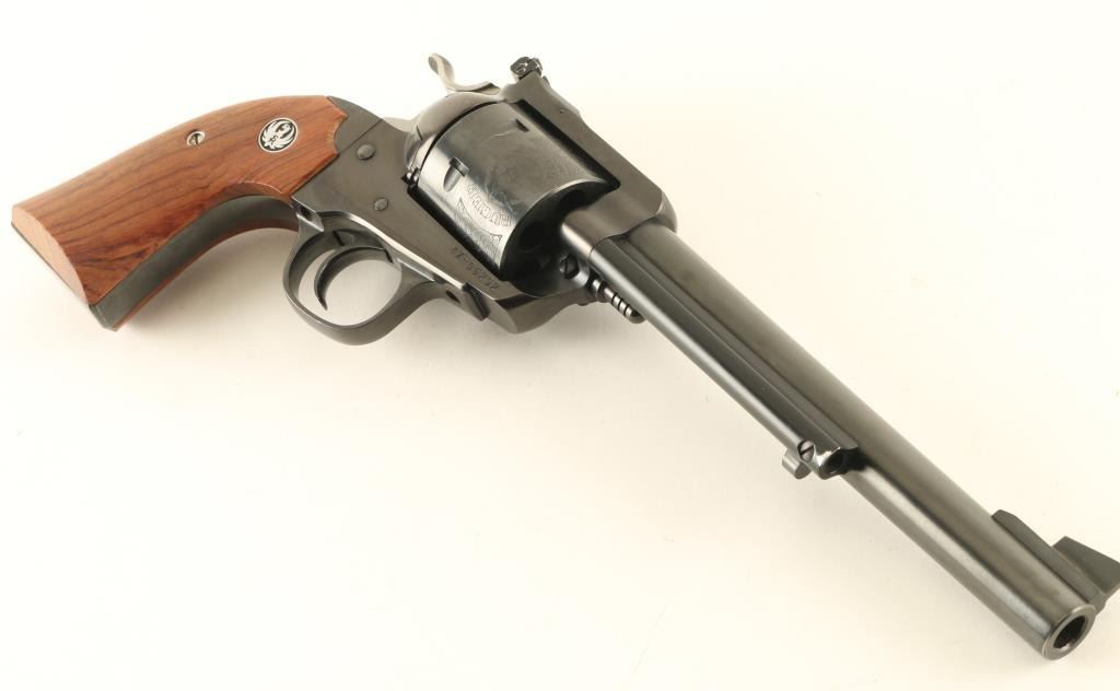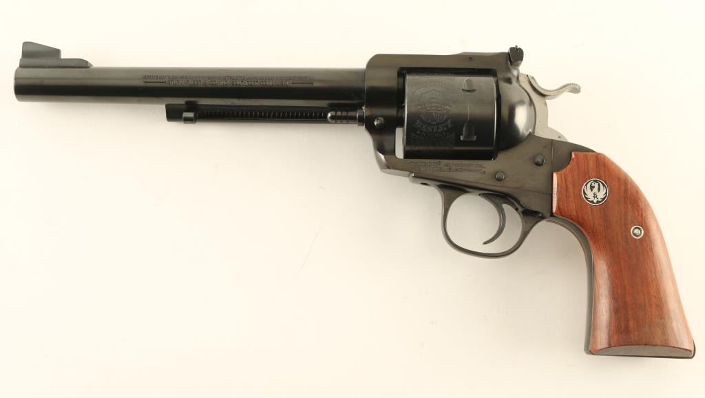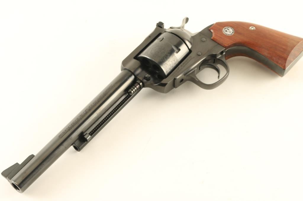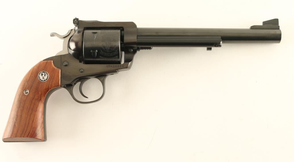 'Bisley' framed single action revolver manufactured circa 1993. Features blued finish, engraved cylinder scene, smooth wood grips with Ruger medallions, 7.5" barrel, adjustable sights. Bore & charge holes are in excellent condition. Retains 98% blue with bare metal showing at sharp edges on rear sight. Grips are very good or better with few small dents. Includes manual, yellow cardboard factory box, set of miscellaneous Wolff gun springs for Ruger single action revolvers. Condition is NRA Excellent *** Modern Firearm ***