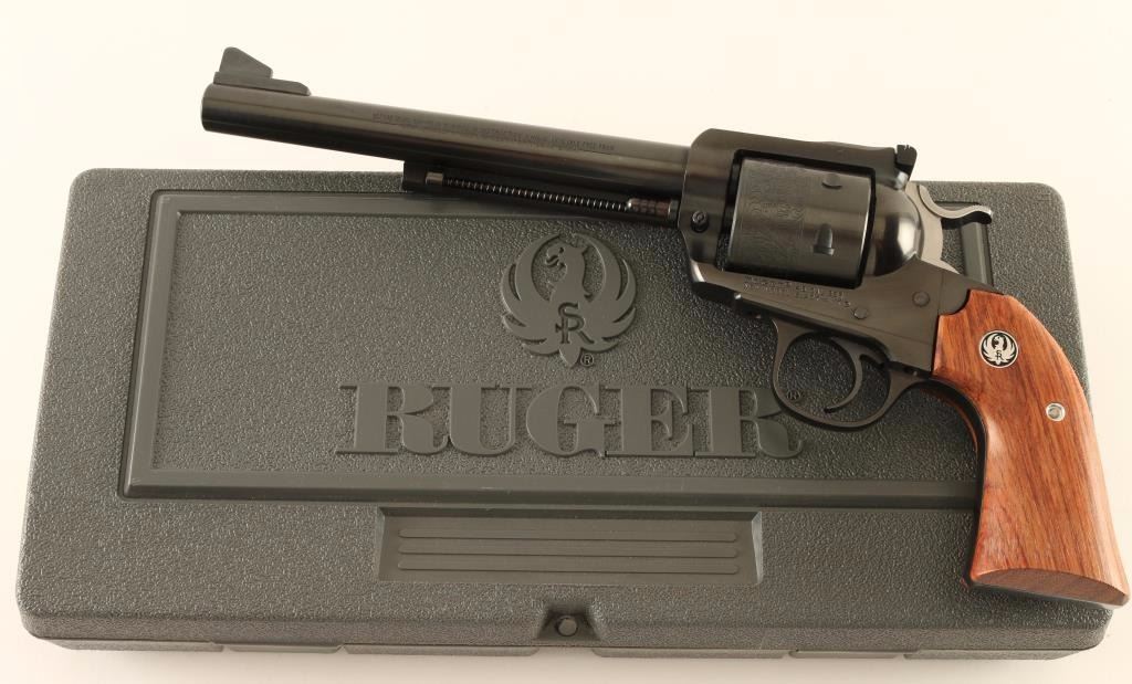 SN: 47-86587 'Bisley' American made six-shot single action revolver chambered in .45 Colt, circa 1997. Features a blued finish, 7 1/2" barrel, raised ramp front sight, adjustable rear window sight, ejector rod, non-fluted cylinder with roll-stamped 'BISLEY MODEL' & floral scroll embellishment, transfer bar safety, serrated wide low-profile hammer spur, smooth trigger, humpback backstrap, and two-piece smooth wood grips with Ruger medallions. Includes the original factory hard case with documents and lock. Revolver exhibits approximately 97% of it's original blued finish showing few handling marks/scratches, a small bright spot of wear on the backstrap, scrapes on the underside of the ejector rod housing and a faint drag line on the cylinder. Action is smooth with tight lock-up, bore is excellent and wood grips are fine. Condition is excellent in case. ***Modern Firearm***