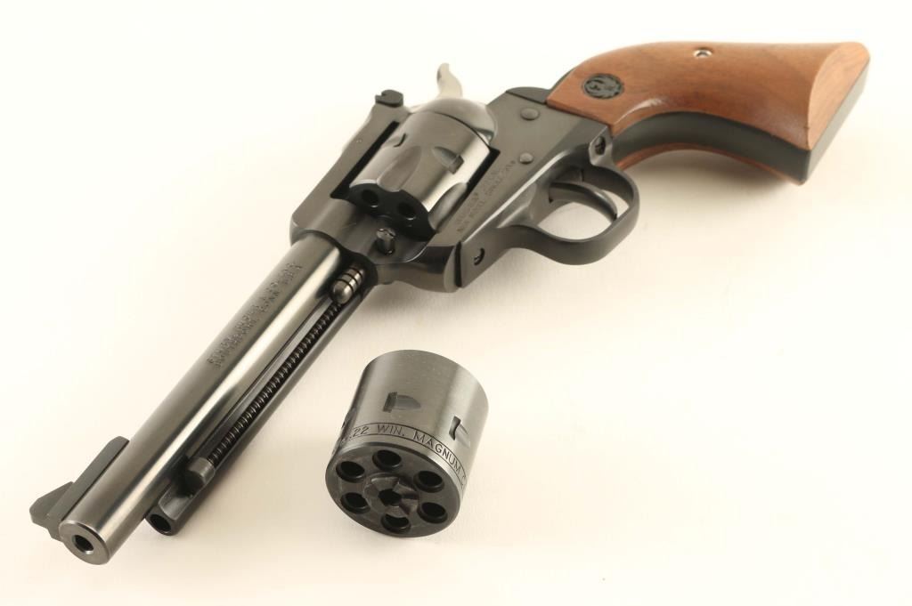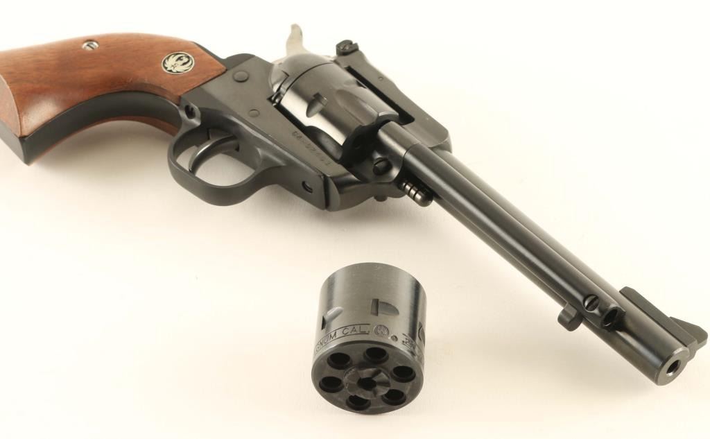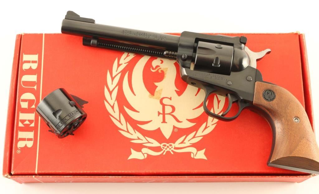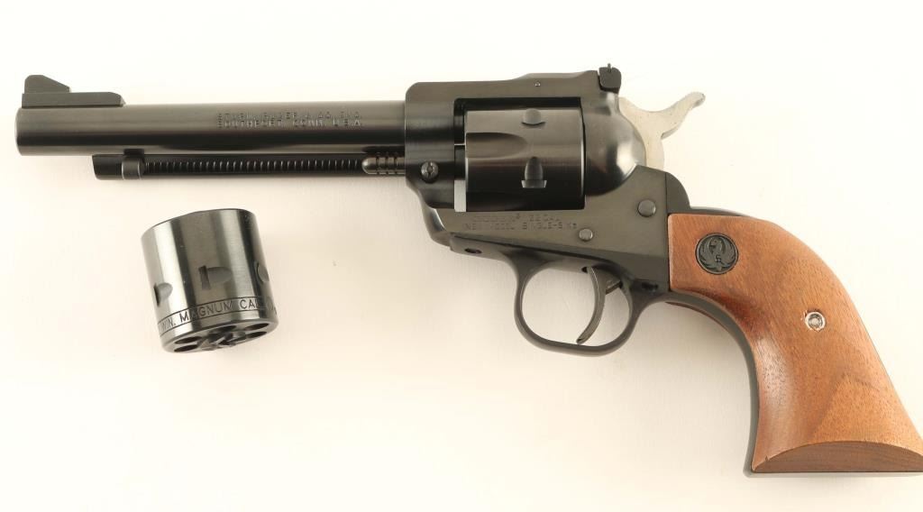 SN: 64-52463 Western style small frame single action revolver with convertible cylinders chambered in .22 Long Rifle & .22 Magnum. Manufactured in 1976 with the barrel roll stamped “MADE IN THE 200th YEAR OF AMERICAN LIBERTY”. Features a blued finish, 5 1/2" barrel, raised serrated ramp front sight, adjustable rear sight with square notch, smooth trigger, serrated hammer spur, transfer bar safety, fluted six-shot .22 LR cylinder with recessed chambers, ejector rod with flat faced button, steel frame, black anodized alloy grip frame and two-piece smooth walnut grips with Ruger medallions. Includes the original factory red cardboard box with hard case with documents and serial number matched .22 Magnum unfluted cylinder with recessed chambers. Revolver retains approximately 99% of its original finish showing light muzzle wear and scattered handling marks/scratches. Action is sound with very good lock-up, the bore is pristine and the wood grips are near fine with minor imperfections. Condition is NRA Excellent in box. ***Modern Firearm***