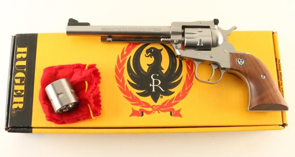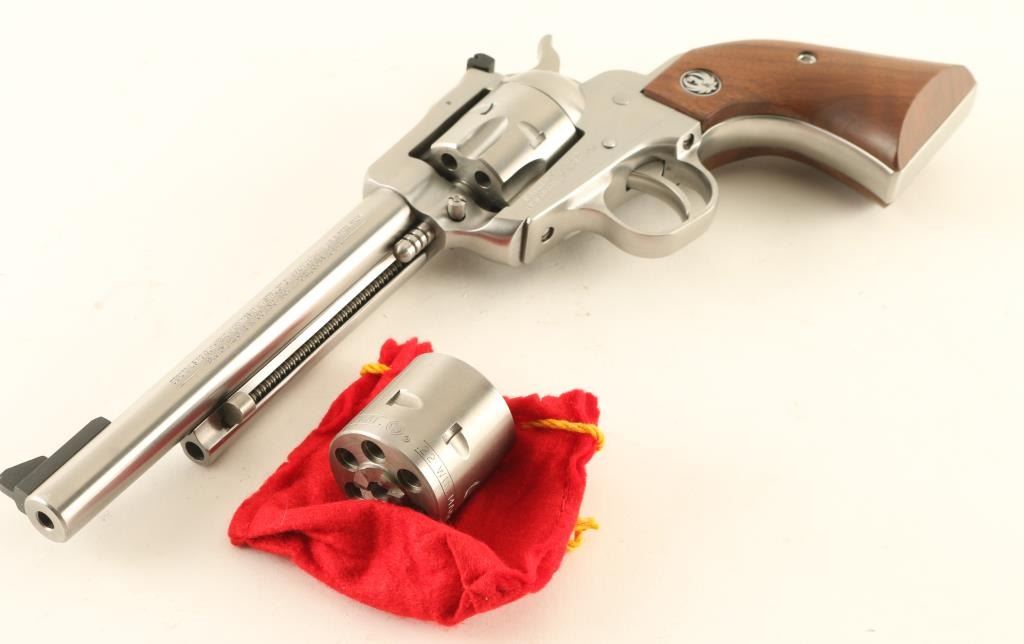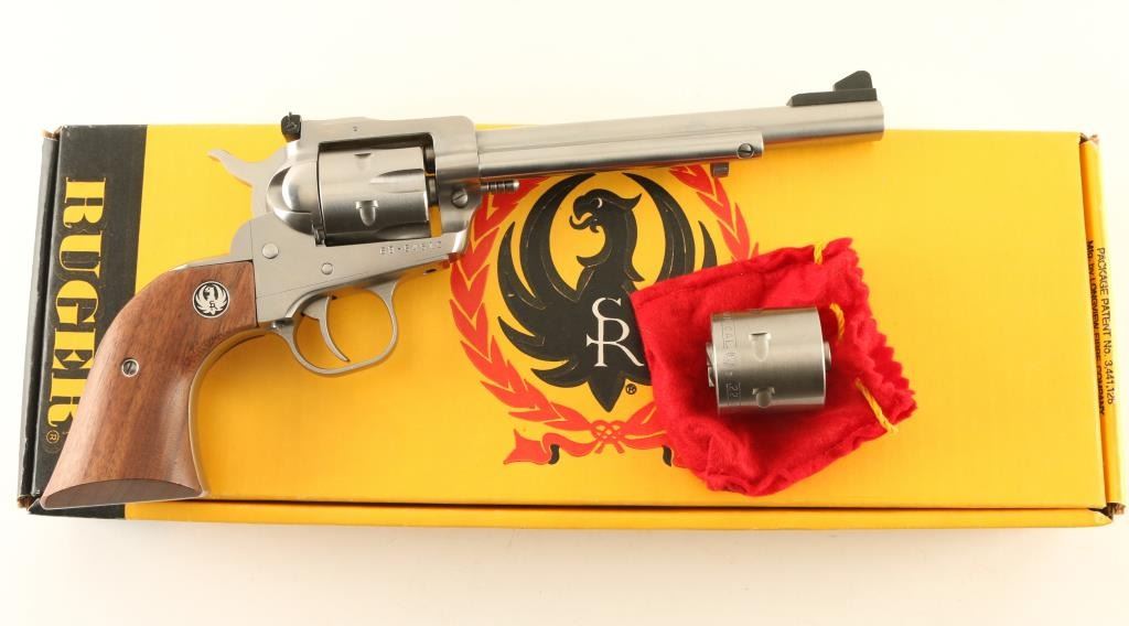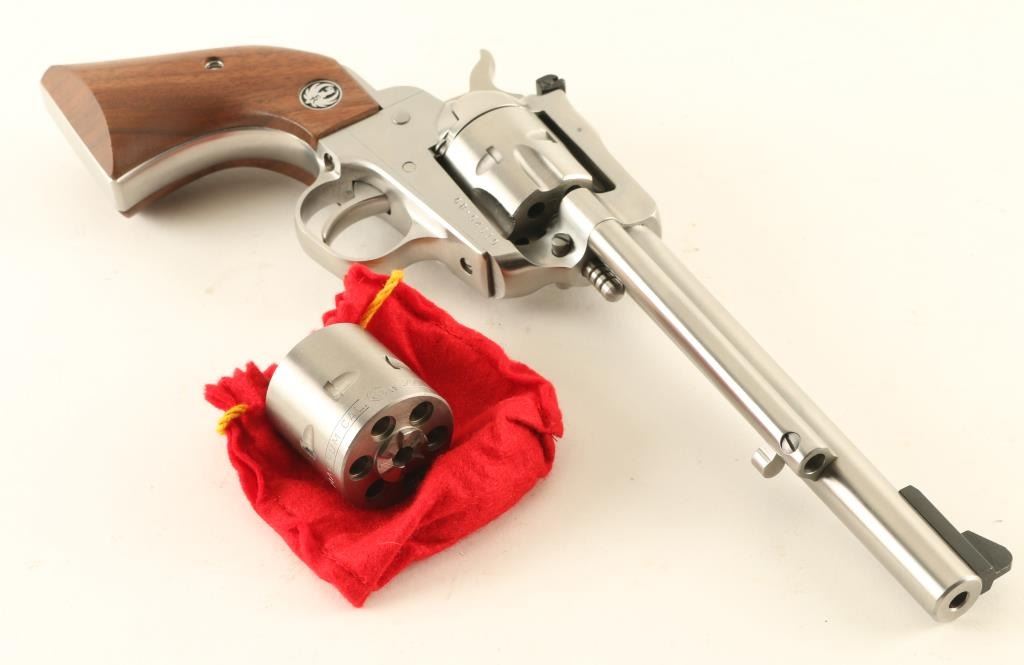 Single action rimfire revolver features stainless steel finish, smooth wood grips with Ruger medallions, 6.5" barrel, adjustable sights. Bore is excellent. Overall condition is like new with few signs of handling. Includes additional cylinder for 22 WMR (Magnum) in red cloth bag, Ruger factory yellow cardboard box, original outer shipping box, manual. Condition is NRA Excellent - Like New *** Modern Firearm ***
