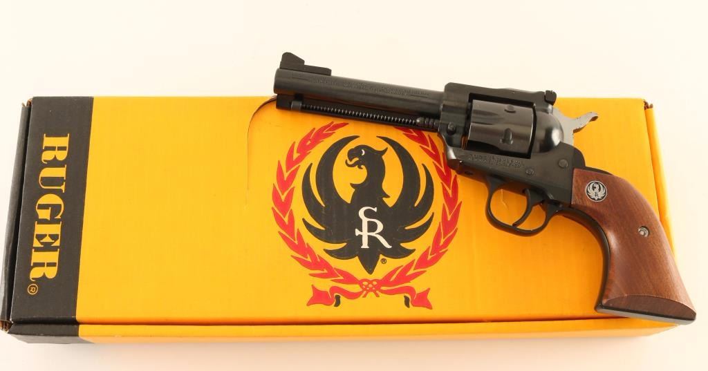 SN: 650-32340 'SSM' Small frame single-action revolver chambered in .32 Harrington & Richardson Magnum, circa 1991. Features a blued finish, 4 5/8" barrel, raised ramp front sight, adjustable rear window sight, ejector rod, fluted six-shot cylinder, transfer bar safety, smooth trigger, serrated hammer spur, black finished alloy grip frame and two-piece smooth walnut grips with Ruger medallions. Includes a factory cardboard box with manual. Revolver exhibits approximately 97% of it's original finish showing light handling marks, some minor blemishes and a light drag line on the cylinder. Action is crisp with tight lock-up, bore is excellent and wood grips are fine. Condition is excellent in box. ***Modern Firearm***