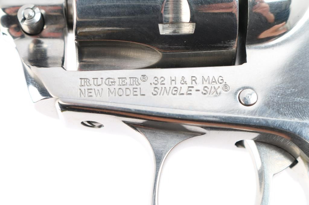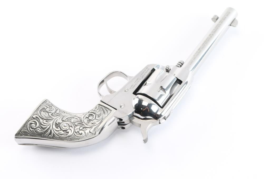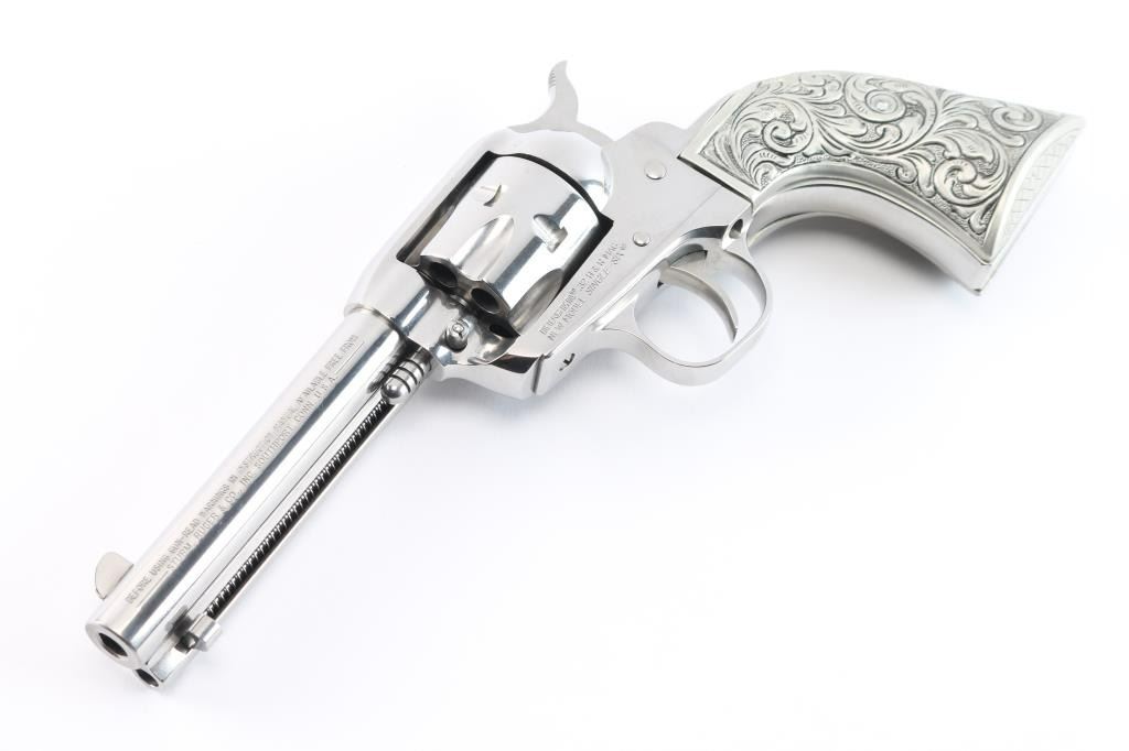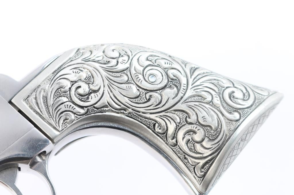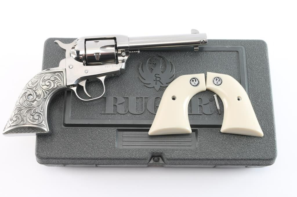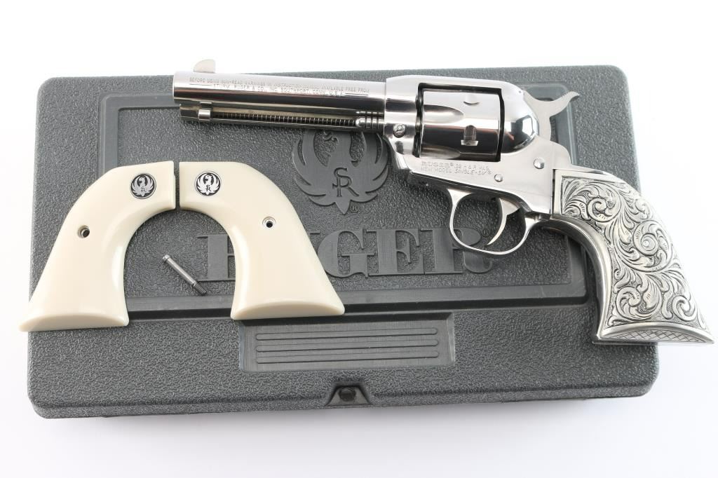 #650-34919. Single action centerfire revolver Features a high polish stainless steel finish, two piece pewter fancy engraved Grips, 4.5" barrel, fixed sights, fluted 6 shot cylinder. Transfer bar safety. Bore is excellent/bright. Retains 98% finish with very minor scratches. grips are excellent. Action is smooth with tight lock-up. Comes in factory gray hard case with matching label, manual and the original factory faux ivory crips. Manufactured 2000.