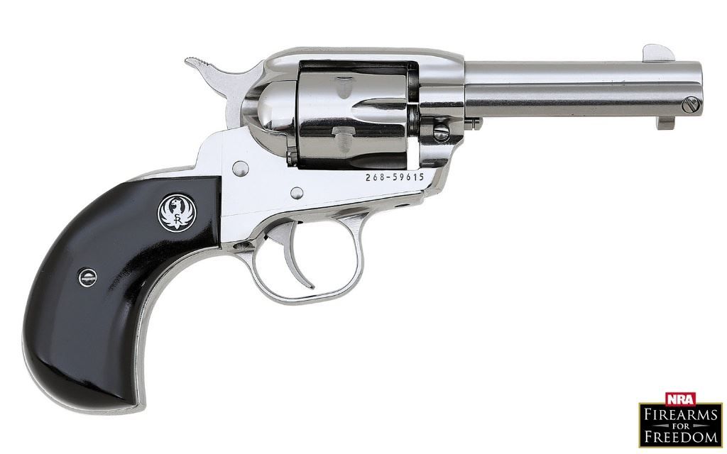 serial #268-59615, 22 LR, 3 3/4" barrel with a bright excellent bore. The high-polish stainless steel surfaces of this revolver remain excellent, showing only perhaps a scattered light handling mark or two. The black micarta birdshead grips with Ruger Eagle medallions rate excellent showing little if any wear. This revolver retains the standard open sights and timing and lockup remain excellent. Included is the factory plastic hardcase, manual, factory fired case, and triggerlock. (26A11608-378) {MODERN} [N.R.A. Firearms For Freedom] (700/900)