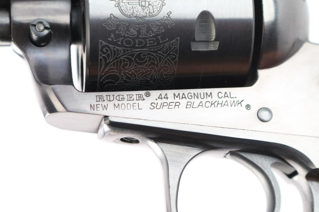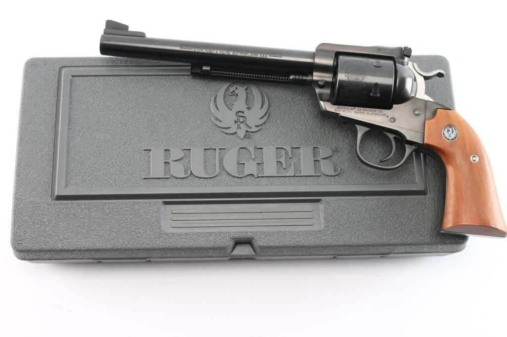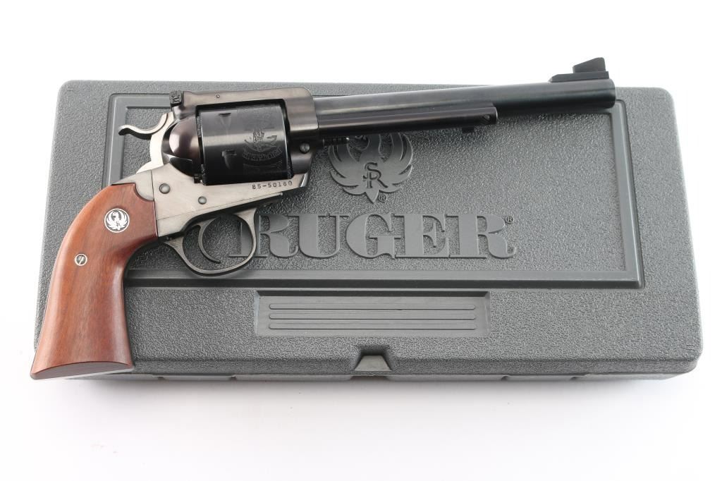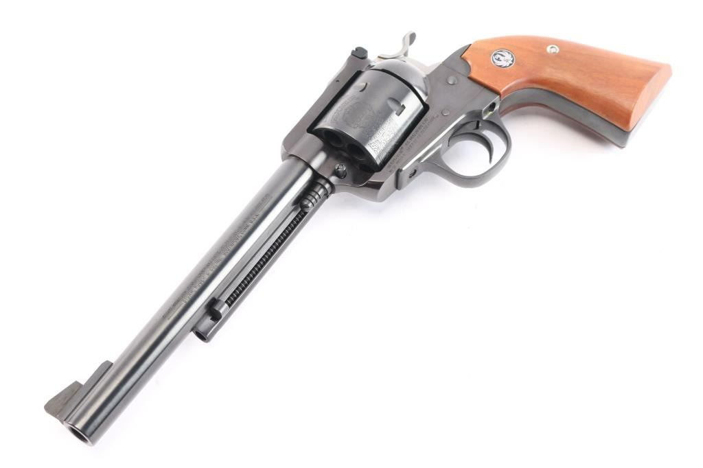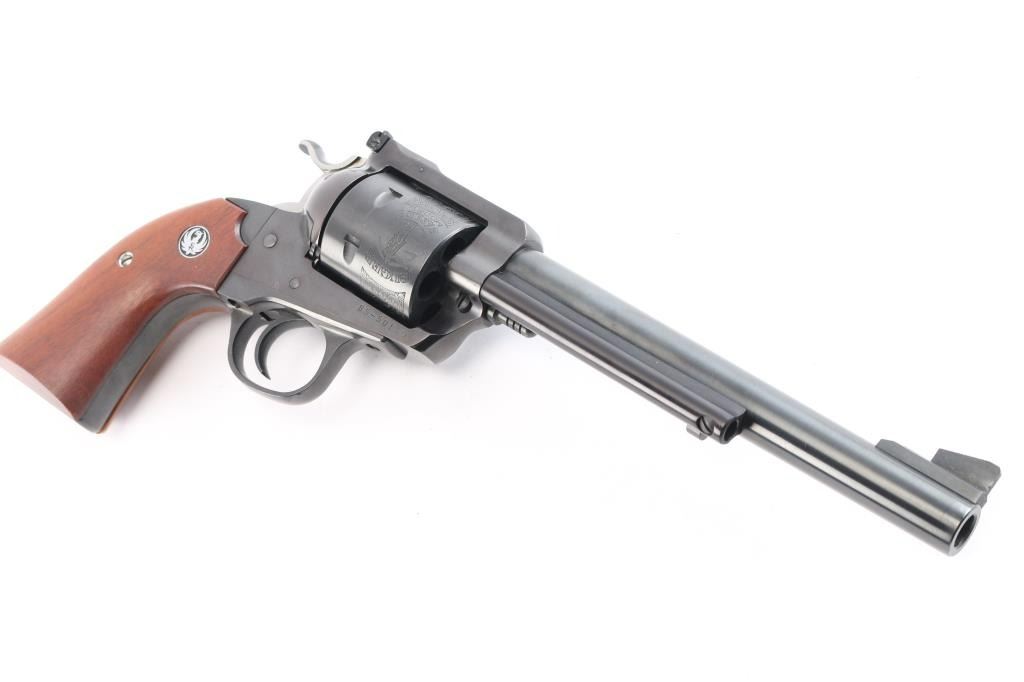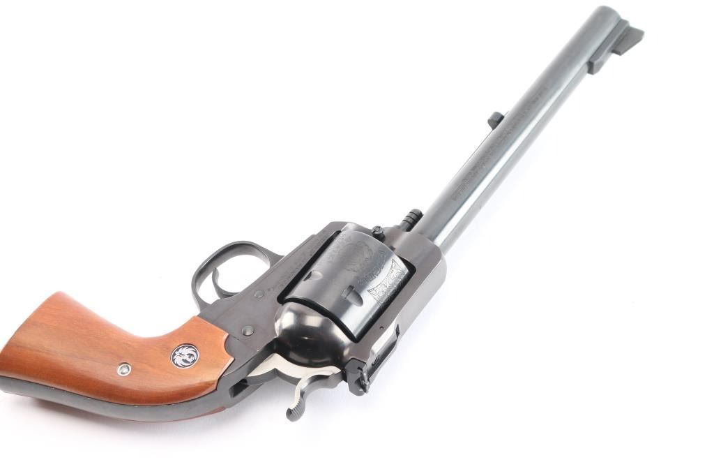 SN: #85-50160. 'Bisley Model'. Single-action revolver manufactured circa 1986. Features blued finish, 7 1/2" barrel, serrated ramp front sight, pinned and adjustable square notch rear sight, non-fluted 6 shot cylinder with "Bisley Model" engravings, serrated wide hammer spur and smooth curved trigger. Bore is bright with strong rifling. Bisley style two piece smooth wood grips with Ruger medallions. Bore is bright with strong rifling. Retains approx. 98% finish with no visible wear and faint drag line on cylinder. Action is smooth/tight. Grips are excellent. Comes with factory gray plastic case, manual and lock. NRA Condition is excellent. ***Modern Firearm***