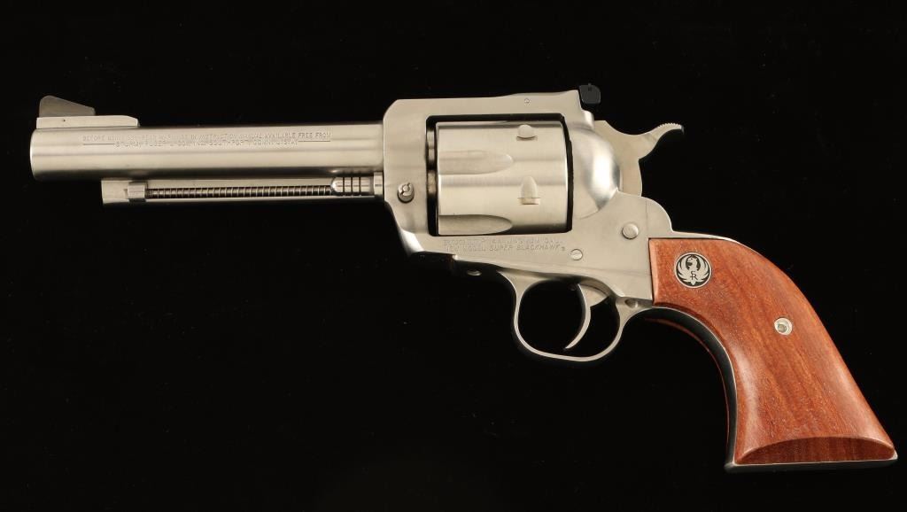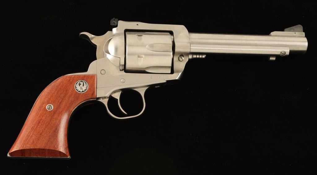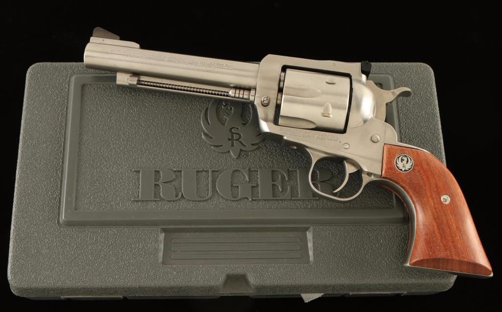 SN: 87-46912 American made stainless steel single-action revolver chambered in .44 Magnum, circa 2002. Features a brushed finish, 5 1/2" barrel, raised ramp front sight, adjustable rear window sight, ejector rod, fluted six-shot cylinder, transfer bar safety, serrated wide hammer spur, smooth trigger, and two-piece smooth wood grips with Ruger medallions. Includes the original factory hard case with documents, spent case and lock. Revolver exhibits some light handling marks/bright scratches and a faint drag line with no major wear observed. Action is smooth with tight lock-up, bore is excellent and wood grips are fine. Condition is excellent in case. ***Modern Firearm***