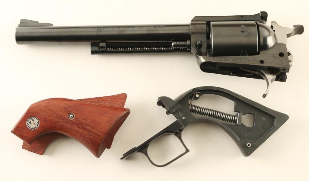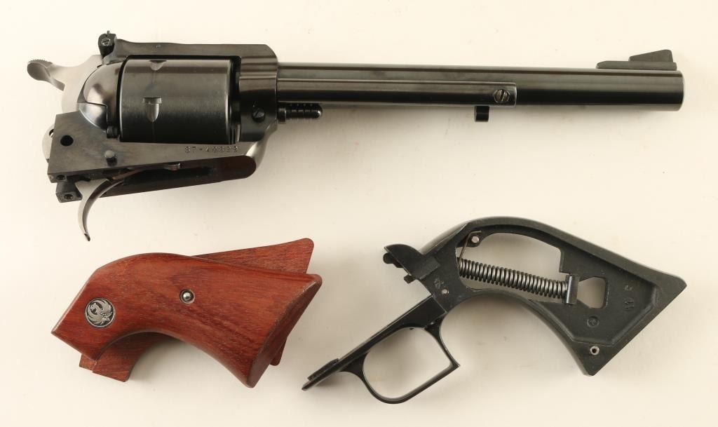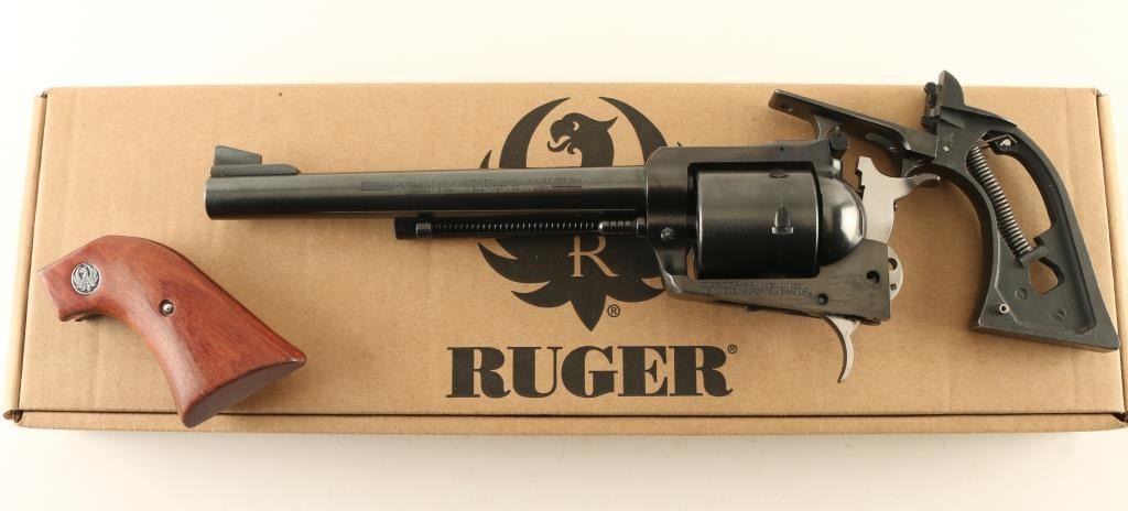 SN: 87-40829 Disassembled single action revolver. Appears to include most parts needed to reassemble a functioning revolver. 7.5" barrel, smooth wood grips with Ruger medallions, adjustable sights. All the larger parts are present (receiver, grip frame, barrel, cylinder, ejector rod assembly). May be missing one or more small parts such as springs or pins. Condition of parts is almost like new with some small handling marks. Includes original box, replacement Ruger cardboard box, manual, cable lock. Condition is NRA Excellent - needs reassembly - missing parts *** Modern Firearm ***