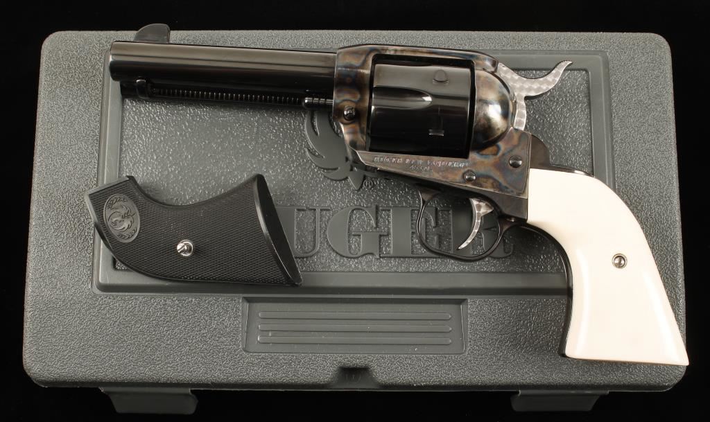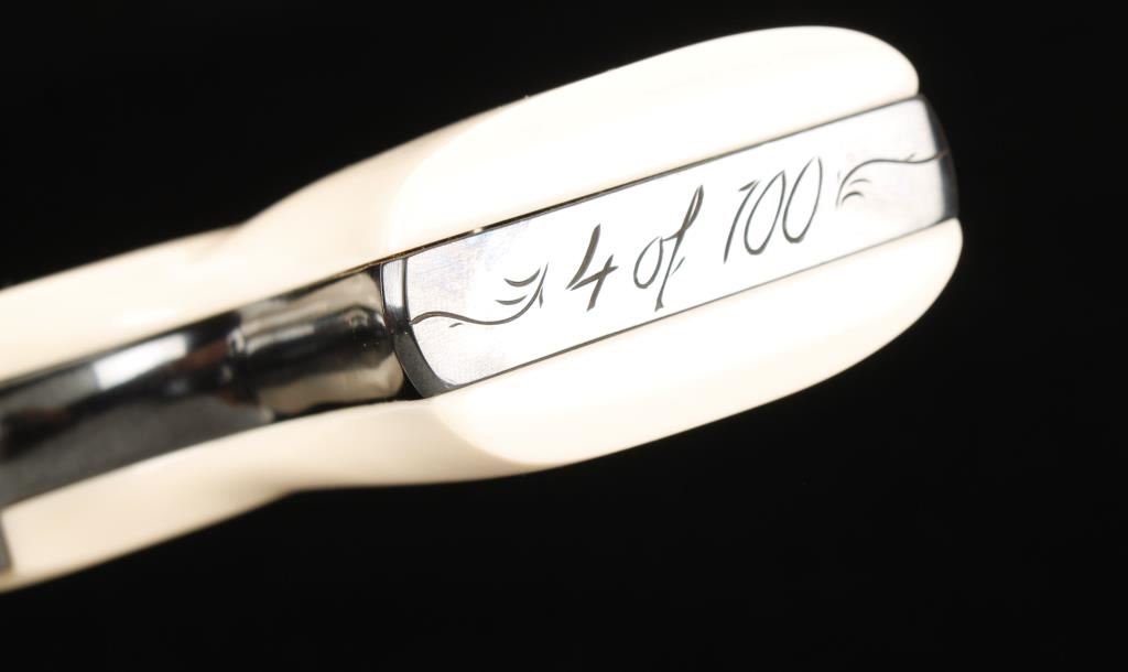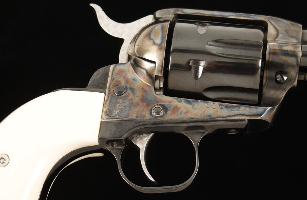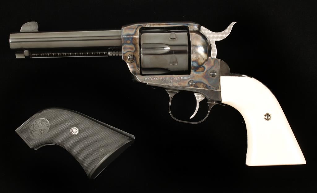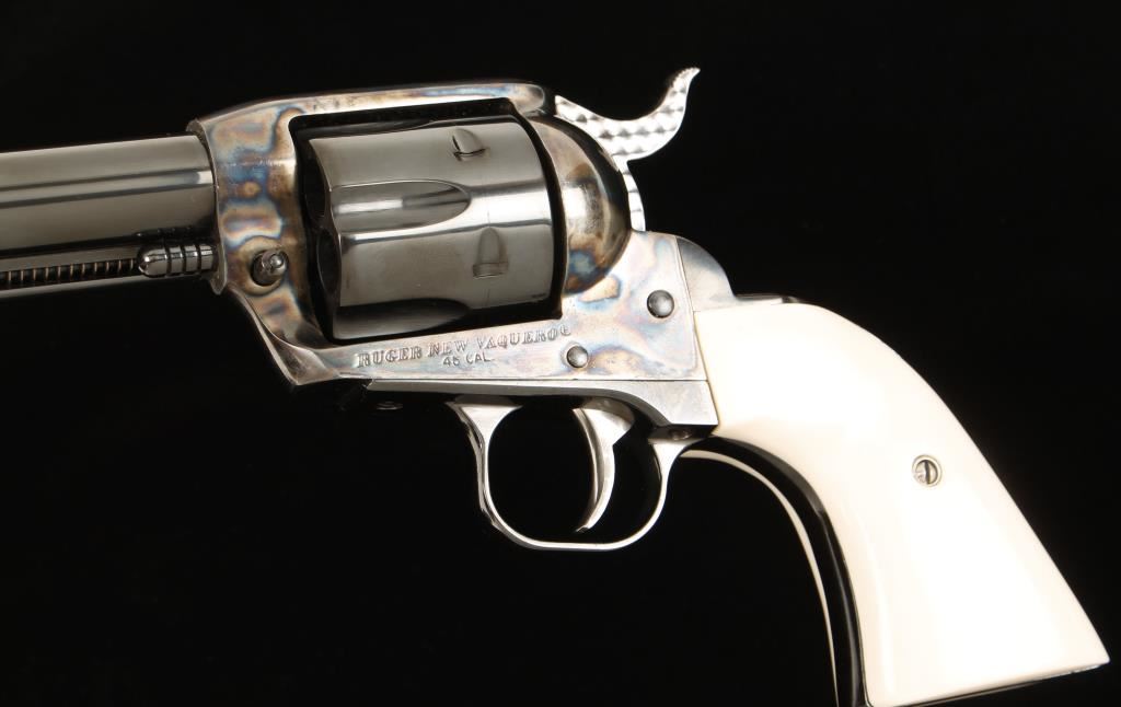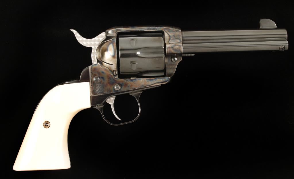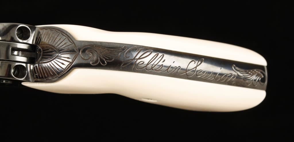 Engraved six shot single action revolver chambered in .45 caliber. This revolver has been extensively reworked, honed, fitted, tuned and re-finished to the highest quality done by a top cowboy action shooter/re-enactor. Features a 4.5" blued barrel, case hardened frame, blued cylinder & trigger guard, jeweled trigger & hammer, simulated ivory Gunfighter grips and blued and engraved backstrap inscribed "Hell's in Session" & "4 of 100". One of the first guns in a series to have this type of elaborate work done, less than ten were actually produced. Bore is exceptional. Condition is excellent in box and will also include original factory grips. *Note- Ruger New Vaquero SN: 510-15914 is done in the same fashion and is inscribed "3 of 100" to be offered as buyer's option. ***Modern Firearm***