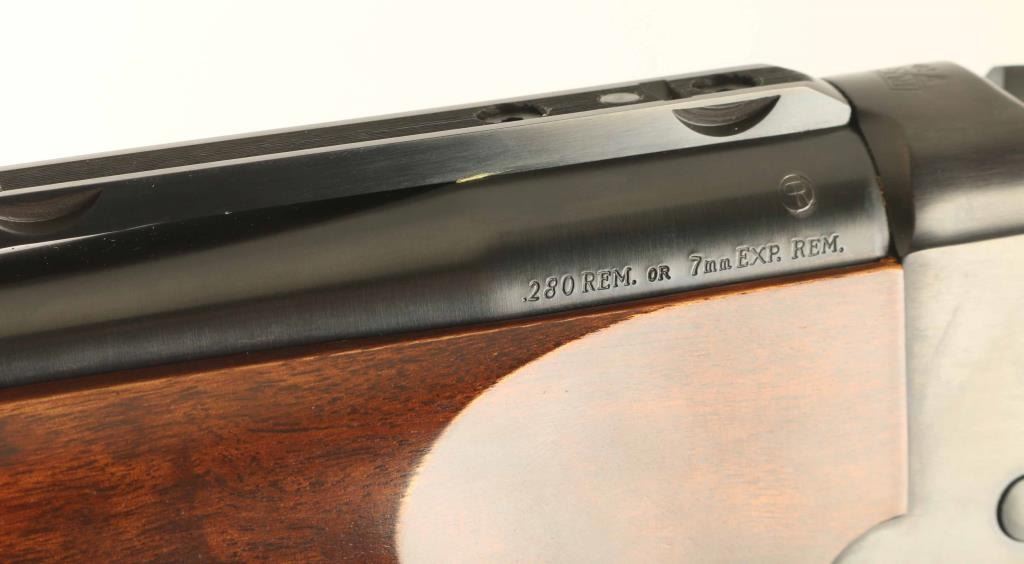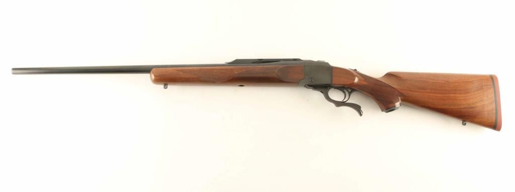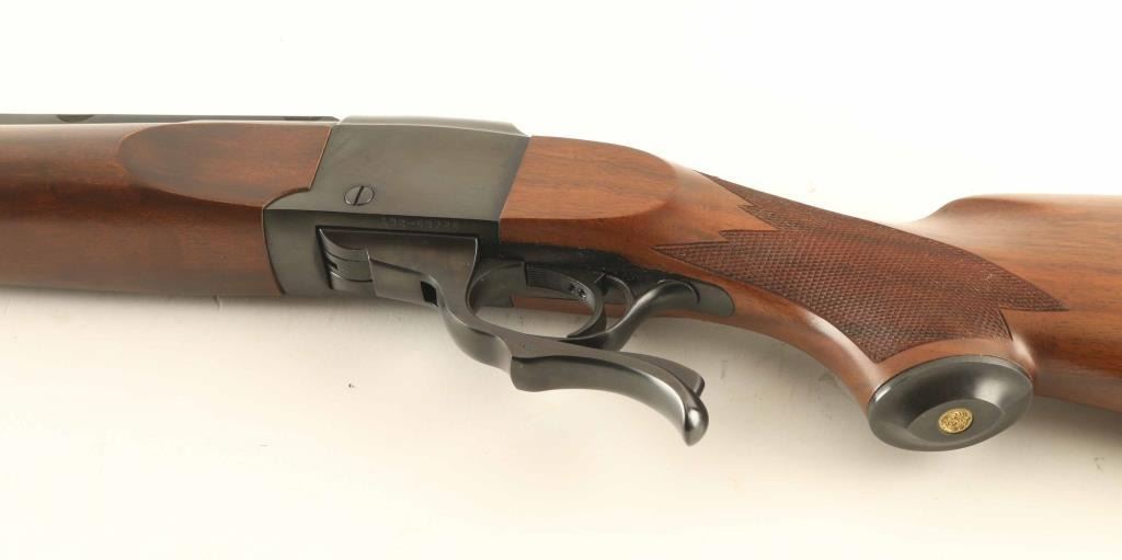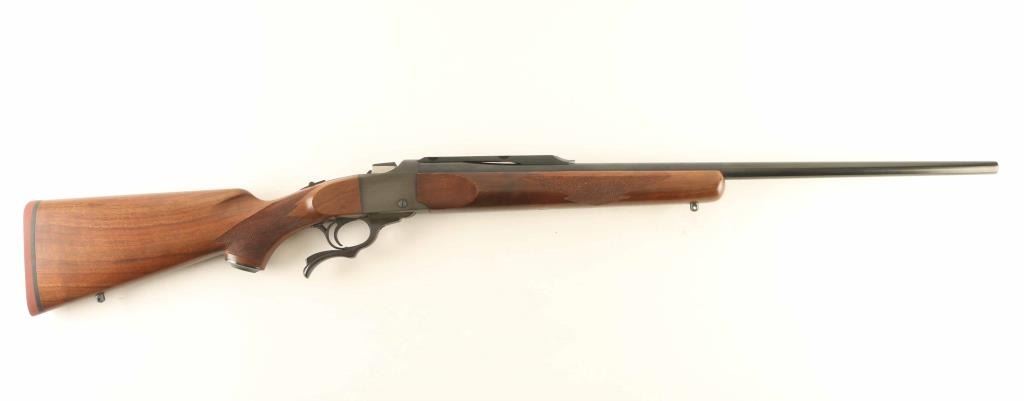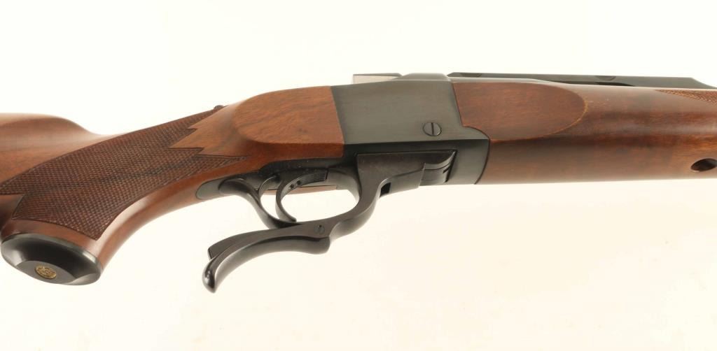 Falling block single shot lever action rifle features blued finish, two piece wood stock, checkering at forend & pistol grip, plastic grip cap, solid rubber butt pad, sling studs, 26" barrel, no sights, scope base mounted to barrel, tang safety. Bore is very good condition, needs cleaning. Retains 95% blued finish with scratches and light scuffs. Wood is excellent condition. Includes factory cardboard box with manual & scope rings. Condition is NRA Excellent *** Modern Firearm ***