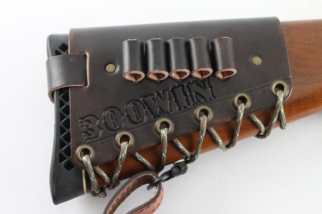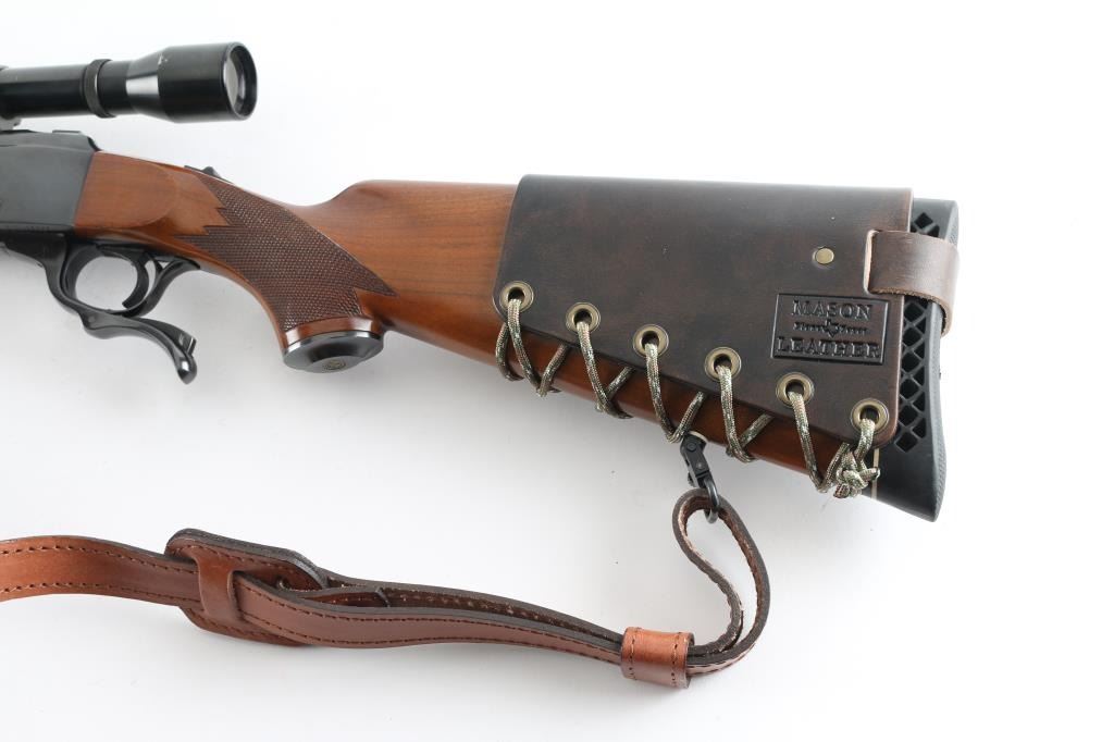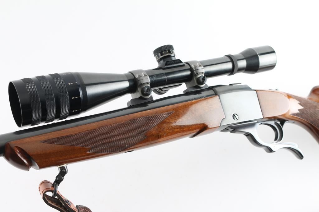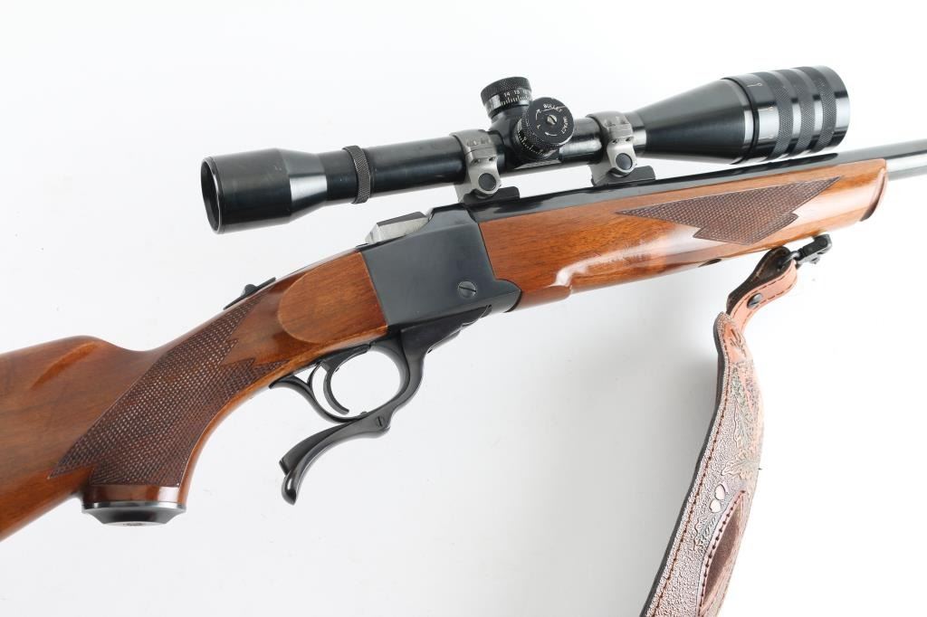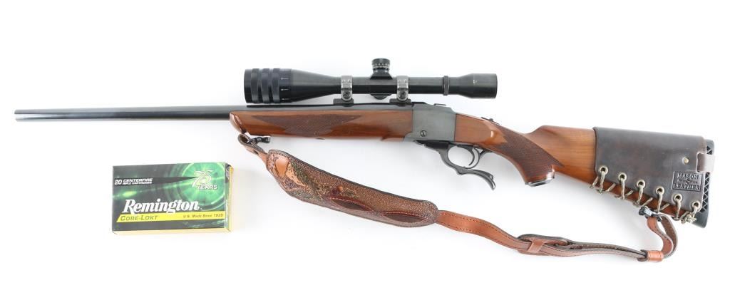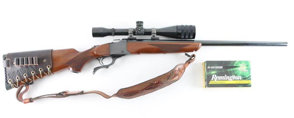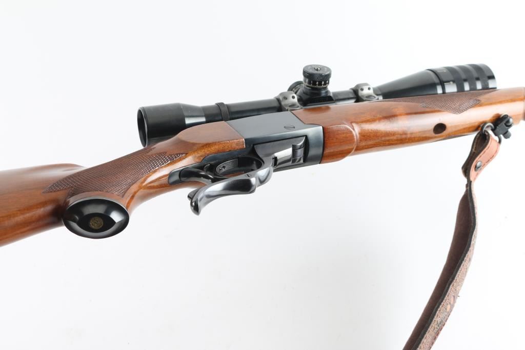 American made single shot, Falling-Block rifle chambered for .300 Win. Mag. cartridges. Based on John Farquharson's falling-block design that was patented in Scotland in 1872. It features a 24" blued, tapered barrel and receiver with no iron sights but is drilled and tapped. It has a serrated trigger, tang safety and smooth operating lever. The two piece walnut stocks, checkered at the wrist and forearm have a black metal Ruger grip cap, sling swivels and a black ventilated recoil pad. Mounted with a Weaver T-6 Micro-Trac scope, rings, bases. (Clear Optics) Padded brown leather sling with image of Elk on pad, Mason brown leather 5 cartridge holder attached to the buttstock. Bore looks great, bright. Metal finish looks great. Wood stocks look very good with a few scratches/scuffs. Overall very few signs of use, wear or handling. Comes with a 20-rd box of Remington 180 Gr. Core-Lokt cartridges. Condition is NRA Very Good+ Modern Firearm