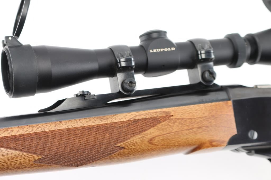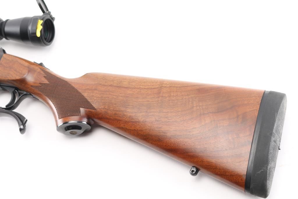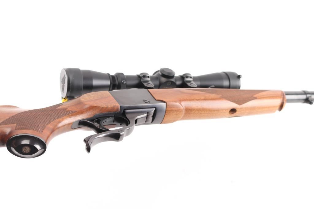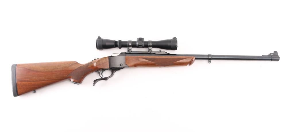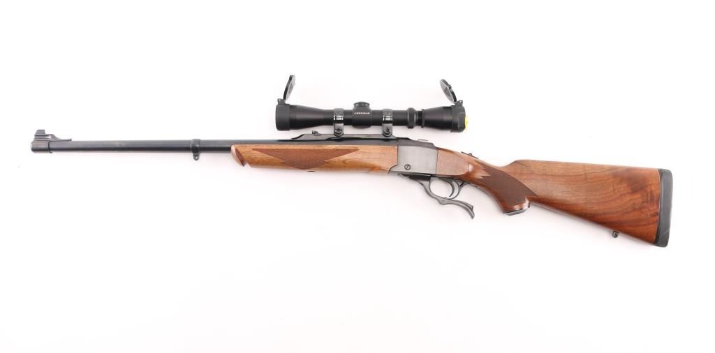 High quality, American made, single shot falling block rifle, circa 2009. Rifle features a 24" tapered, high polish blued barrel with raised blade/brass bead front sight, and adjustable flip. 'white diamond' rear sight on scope base, High polish blue receiver. It has a two piece wood stock with checkering at the wrist and forearm and a black Ruger grip cap with solid black rubber recoil pad and sling swivel studs, front swivel is on barrel band.. LOP is 14". Bore is excellent/bright. Blue finish is excellent, about 99%. Wood stocks are excellent. Almost new condition. Mounted with a Leupold VX II 2.7x33mm scope in excellent condition, Butler Creek lens caps. Condition-NRA Excellent. Modern Firearm.
