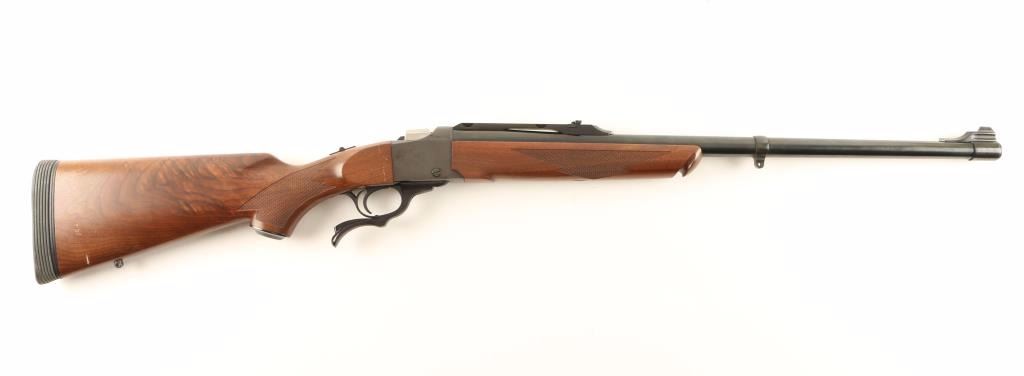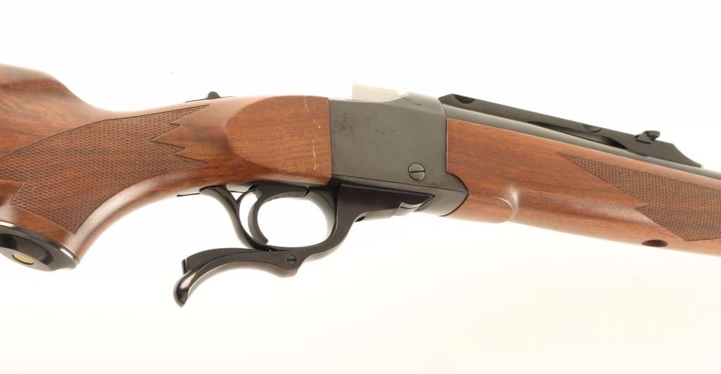 American single shot falling block rifle chambered in .450/400 Nitro Express 3", circa 2010. Features a blued finish, 24" factory barrel, ramped blade front sight with brass bead, adjustable folding leaf rear sight, integral scope base, serrated trigger, sliding tang safety, swivel studs, checkered walnut forend and pistol grip shoulder stock with Limbsaver recoil pad & metal grip cap. Includes the original factory cardboard box with documents. Rifle shows very little wear with only a few light handling marks. Action is smooth, bore is excellent, and wood stocks are near fine with a few small blemishes. Condition is near new in box. ***Modern Firearm***