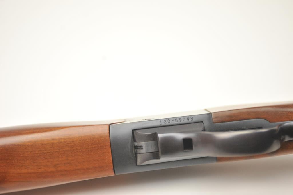 Ruger No. 3 single shot carbine, .30-40 Krag caliber, Serial #130-59048. The carbine is in nearly excellent overall condition with a 22” barrel with a folding rear sight. The carbine retains approximately 99% of theoriginal finish with light scratches, marked, “MADE IN THE 200TH YEAR OF AMERICAN LIBERTY” indicating manufacture in 1976. The smooth wood stock is in very good plus condition with only handling marks. The bore is goodand the action is crisp on this No. 3, desirable in the Krag chambering. Est.: $600-$1,200. (Modern).
