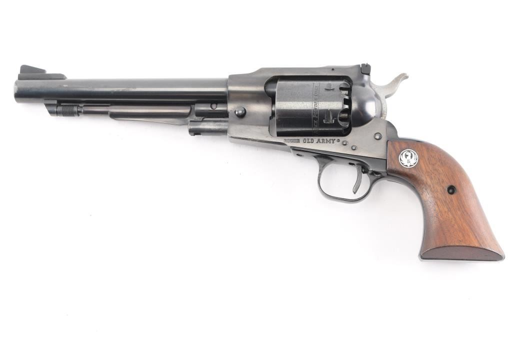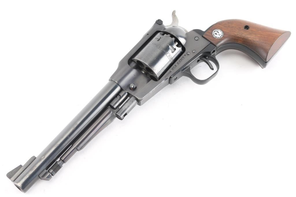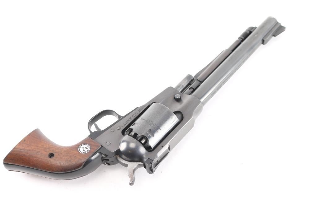 Single action black powder percussion revolver, manufactured circa 1989. Features blue finish, 7.5" barrel, loading lever, raised serrated ramp front sight, adjustable rear sight, smooth trigger, serrated hammer spur, non-fluted cylinder with safety stops, three-screw steel frame, two-piece smooth wood grips with Ruger medallions. Bore and charge holes are pristine, appear unfired. External appearance is overall good with muzzle wear, minor scratches, rubs on the barrel, handling wear on the cylinder, tracking on the cylinder and some patina on the hammer sides. Action is smooth with tight lock-up. Grips are very good.