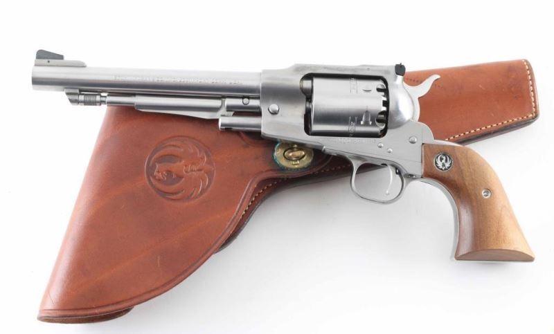 Single action black powder percussion revolver. Features stainless steel construction, 7.5" barrel, loading lever, raised serrated ramp front sight, adjustable rear sight, serrated trigger, serrated hammer spur, non-fluted cylinder with safety stops, three-screw steel frame, two-piece smooth walnut grips with Ruger medallions. Bore and charge holes are in very good condition. External surfaces are very good condition with minor handling marks and scratches. Grips are very good condition. Action is smooth with very good lock-up. Includes good condition Ruger marked tan leather full flap belt holster. Condition is NRA Excellent *** Antique Firearm ***
