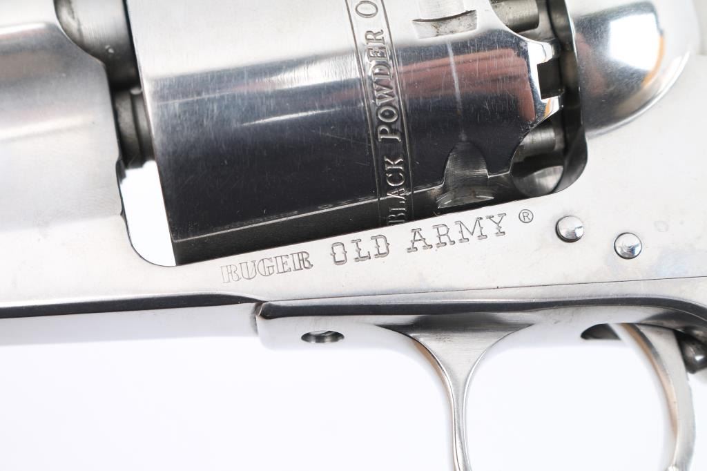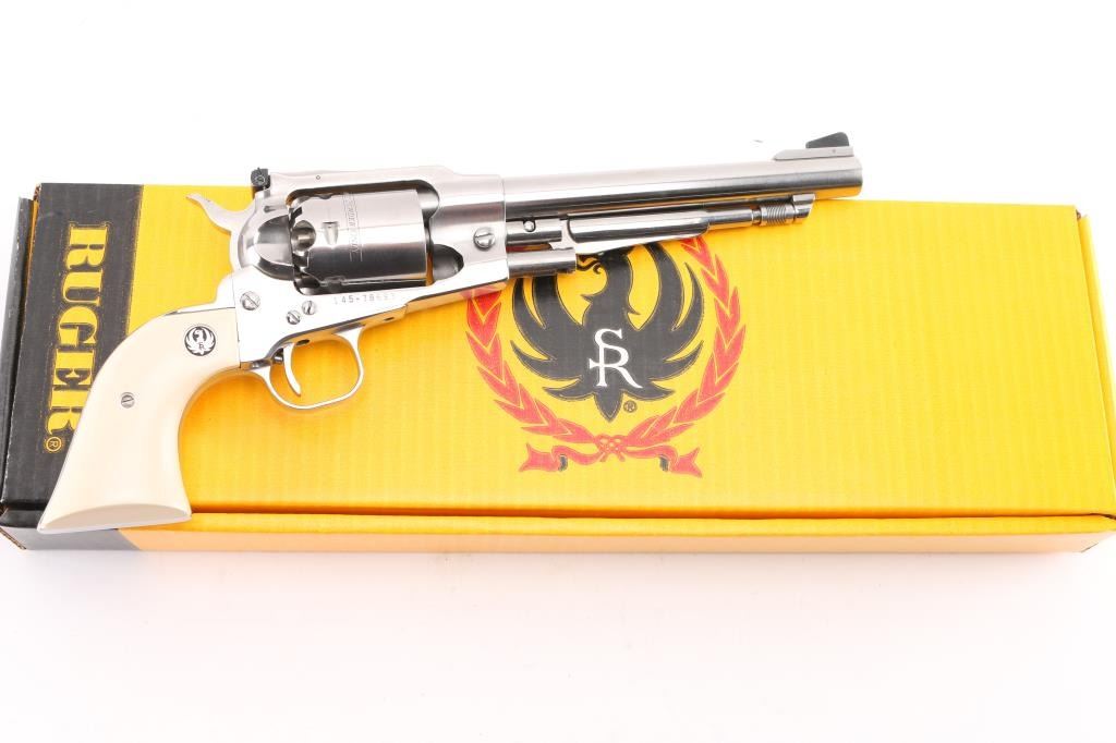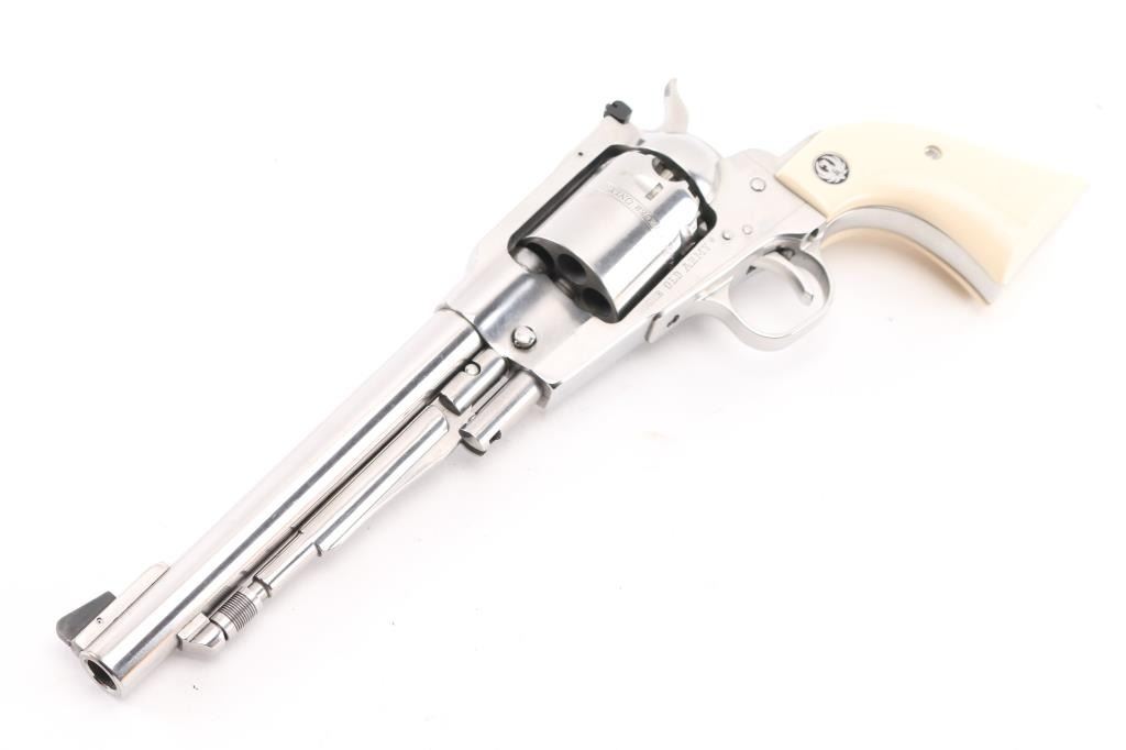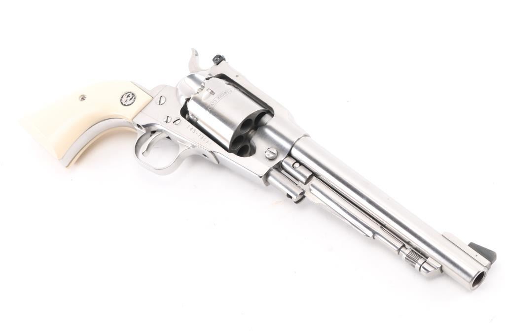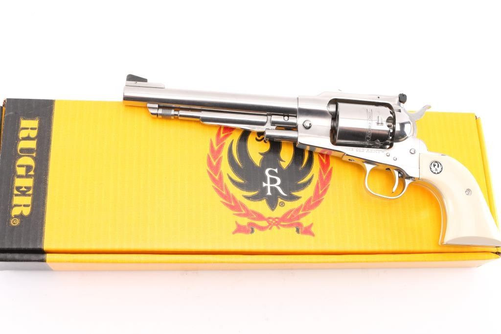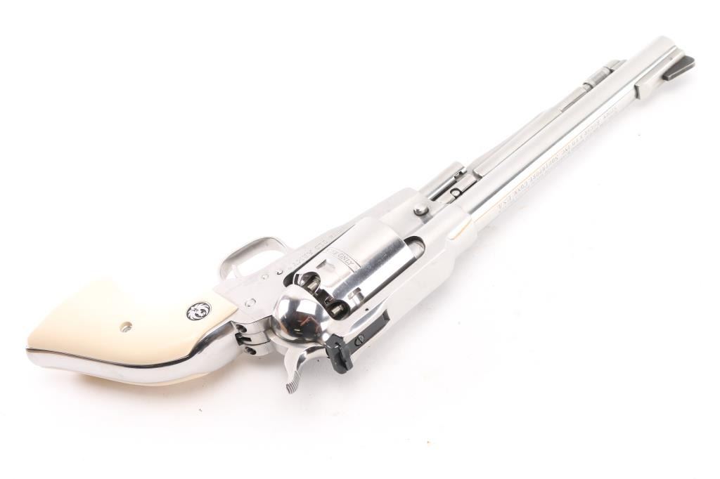 Single action black powder percussion revolver, manufactured circa 1994. Features high polished stainless steel construction, 7.5" barrel, loading lever, raised serrated ramp front sight, adjustable rear sight, smooth trigger, serrated hammer spur, non-fluted cylinder with safety stops, three-screw steel frame, two-piece smooth faux ivory polymer grips with Ruger medallions. Bore and charge holes are pristine, appear unfired. External appearance is like new with few handling marks. Action is smooth with tight lock-up. Includes factory yellow cardboard box with outer brown sleeve, manual, Ruger nipple wrench. Condition is NRA Excellent - like new *** "Antique" Firearm ***
