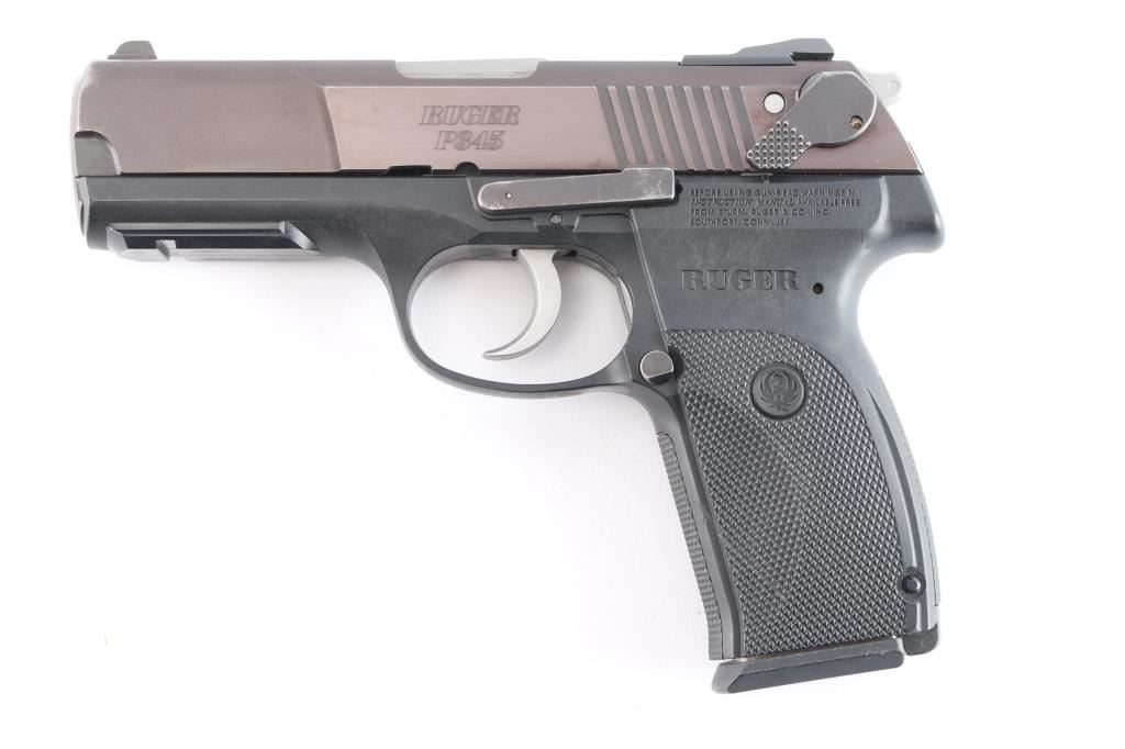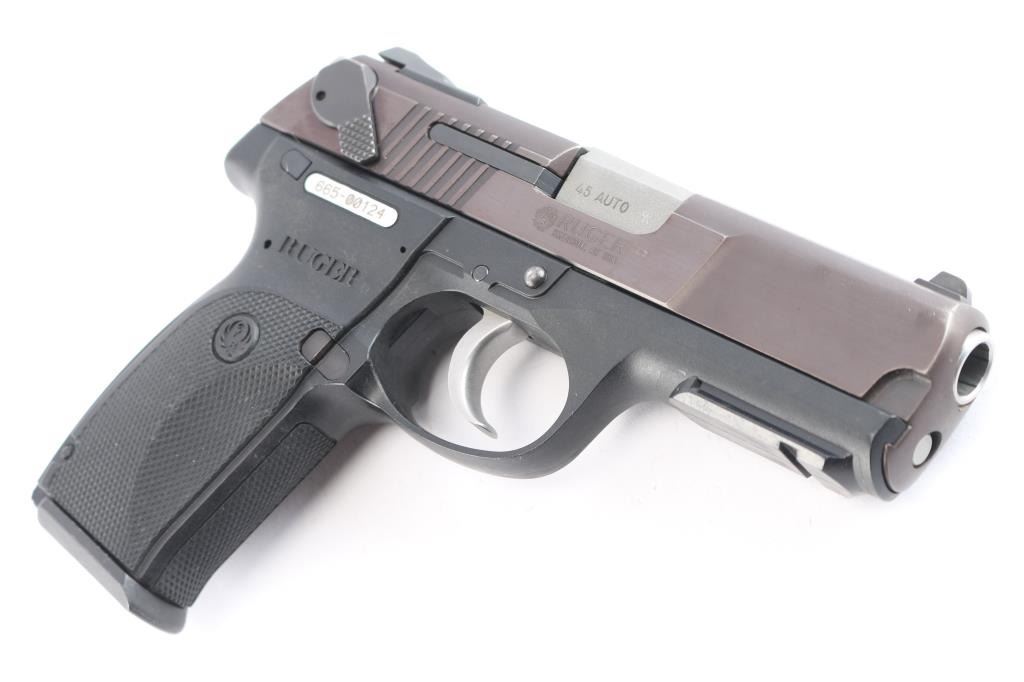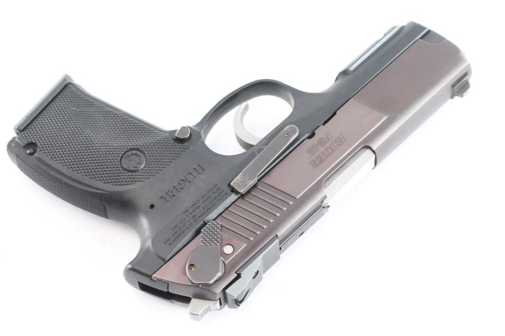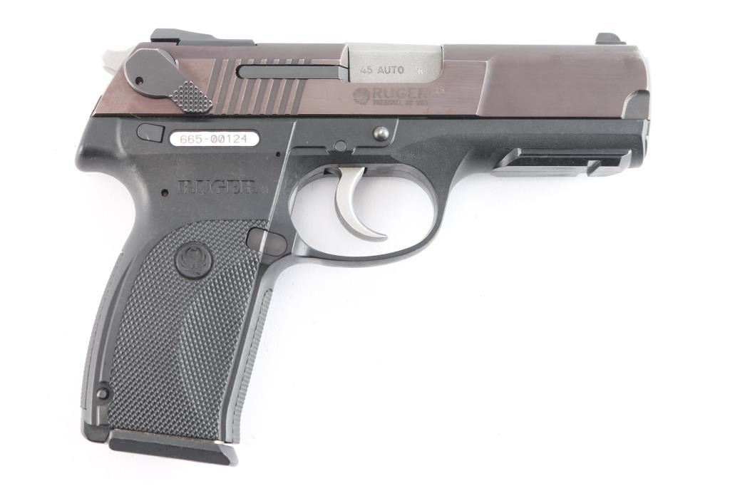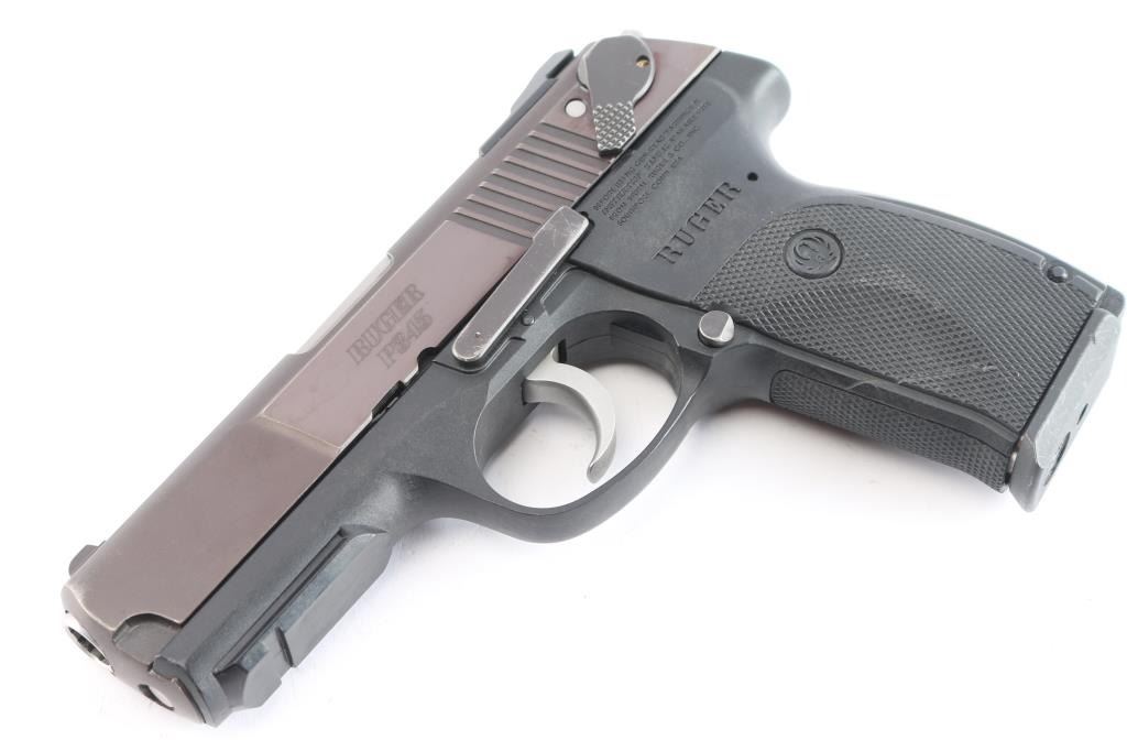 Full size double action semi-automatic pistol chambered in .45 Auto, circa 2011. This model was the last of the P series and along with it's many upgrades was designed to be legal for sale in states that require elaborate safety measures. Features a plum colored slide, 4.2" barrel, dovetailed three-dot sights with drift adjustable rear sight, smooth trigger, serrated hammer spur, ambidextrous safety/decocker, loaded chamber indicator, internal locking safety, magazine disconnect safety, push button magazine release, black polymer frame with integral accessory rail & checkered grip. Bore is very good and bright. Retains approx. 95% finish to slide with slight edge wear. Frame has a scratch on left side of grip. Action is smooth. Comes with one 8rd magazine. Condition is near NRA very good +. ***Modern Firearm***.