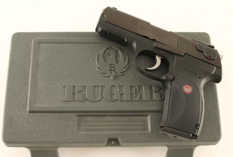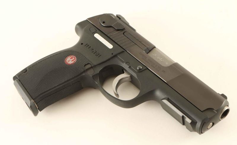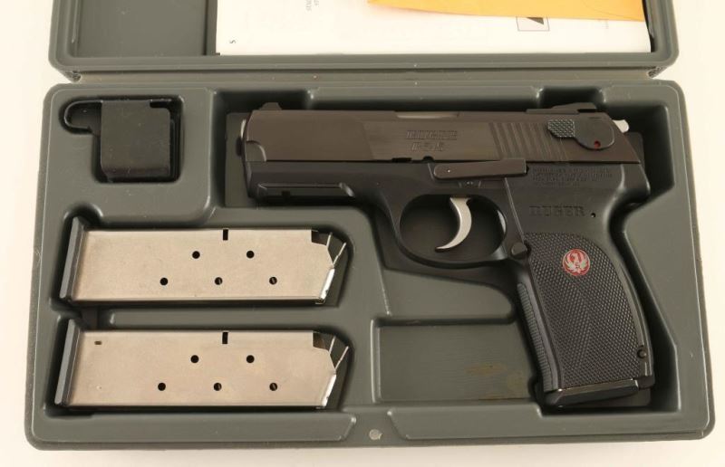 Full size double action semi-automatic pistol chambered in .45 Auto, circa 2005. This model was the last of the P series and along with it's many upgrades was designed to be legal for sale in states that require elaborate safety measures. Features a blued slide, 4.2" barrel, dovetailed three-dot sights with drift adjustable rear sight, smooth trigger, serrated hammer spur, ambidextrous safety/decocker, loaded chamber indicator, internal locking safety, magazine disconnect safety, push button magazine release, factory 8 round magazine and black polymer frame with integral accessory rail & checkered grip. Includes the original factory hard case with manual, safety keys, speed loader, spent case and two spare magazines. Pistol exhibits only minor handling marks & light slide wear on the barrel. Action is smooth, bore is pristine and polymer is fine. Condition is near NRA Perfect in box. ***Modern Firearm***