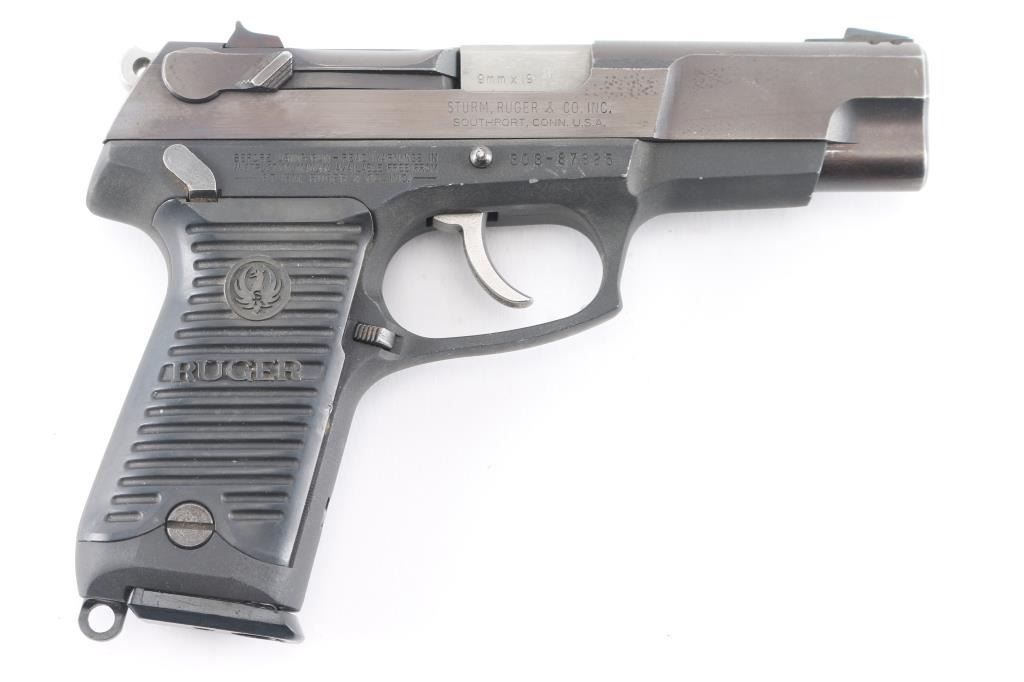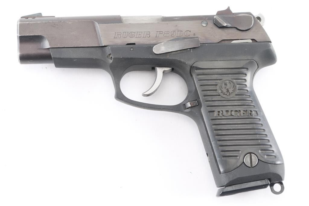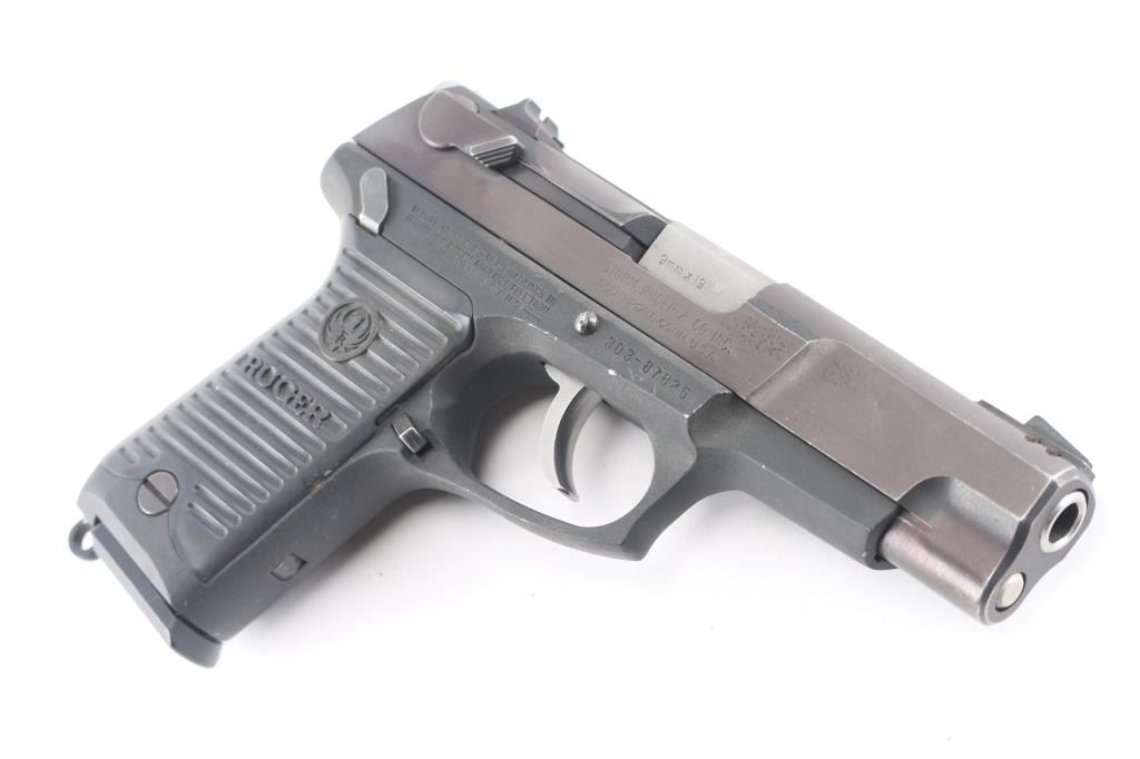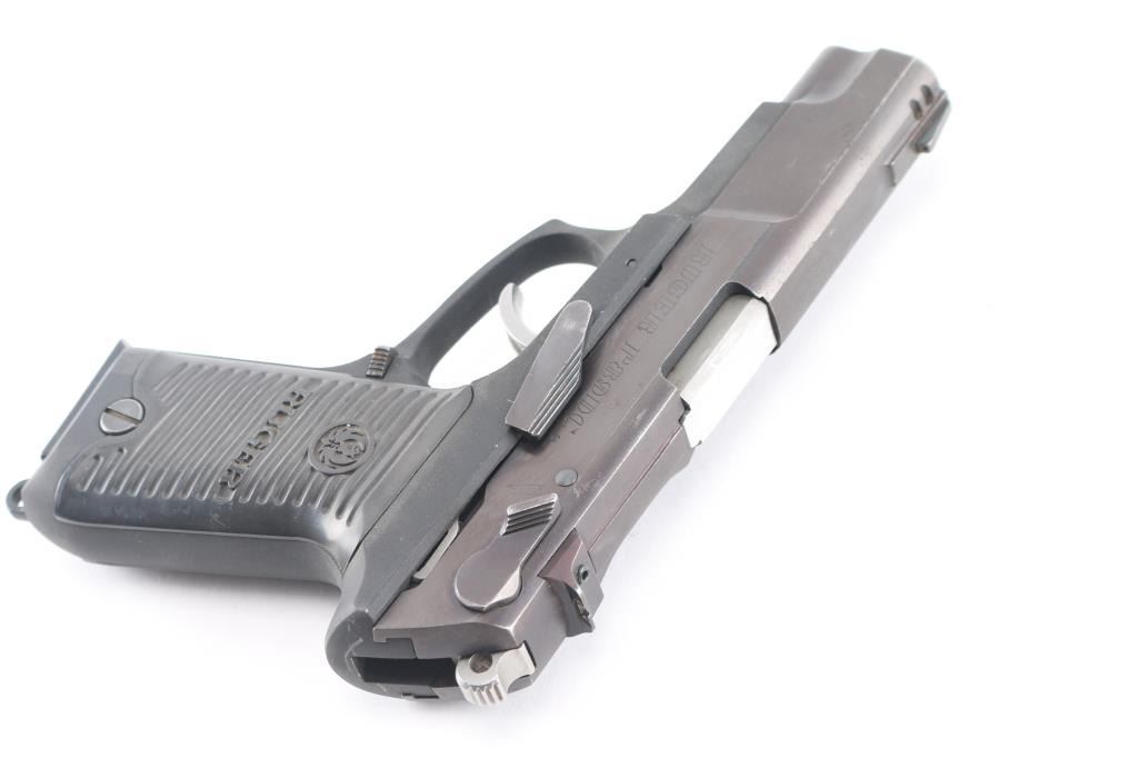 Semiautomatic pistol features blued steel slide over dark gray parkerized aluminum alloy frame, Ruger black plastic grips, double/single action, approx 4.5" barrel, decocker levers on both sides of slide, 3 dot sights (rear is adjustable for windage), lanyard stud at butt, 10 round magazine. Bore is excellent/bright. Retains 90% finish, with edge losses, handling marks. Grips are very good.