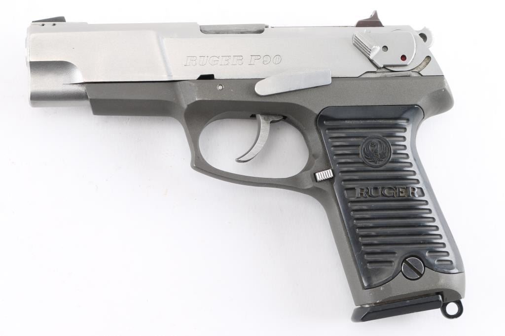 American made semi-auto pistol chambered for .45 ACP ammunition, circa 1993. It has a 4.25" barrel, matte stainless slide, grey alloy frame with lanyard loop, black serrated Ruger plastic grips, pinned front sight, dovetailed rear 3 dot sights, ambidextrous thumb safety/Decocker, smooth trigger and serrated round hammer spur. Metal finish looks very good except for some minor scratches. Grips are fine. Bore looks excellent/bright, needs cleaned. Comes with a factory magazine