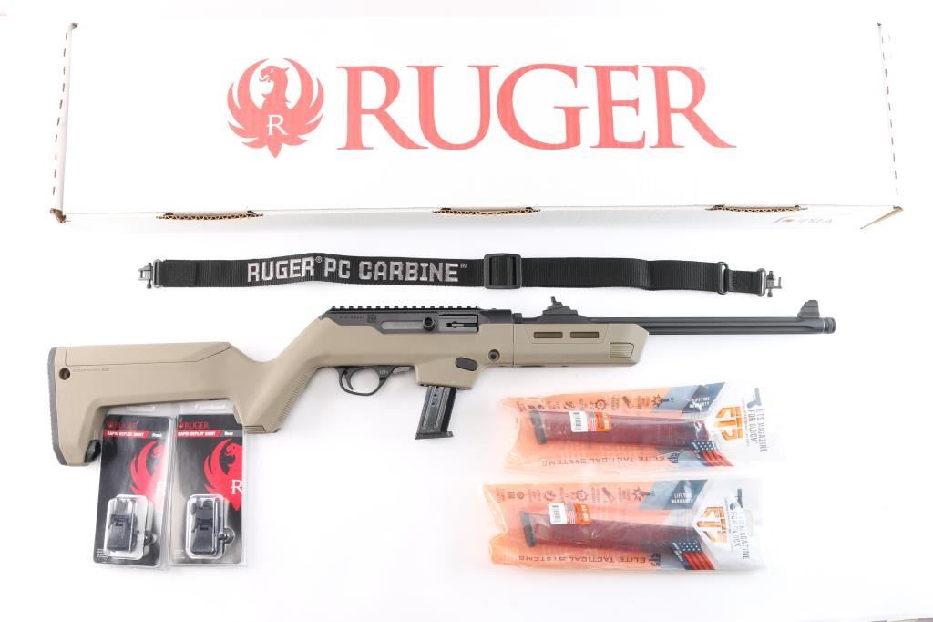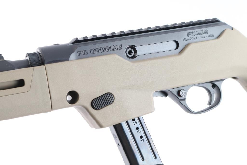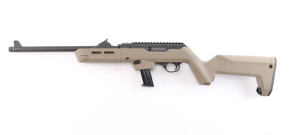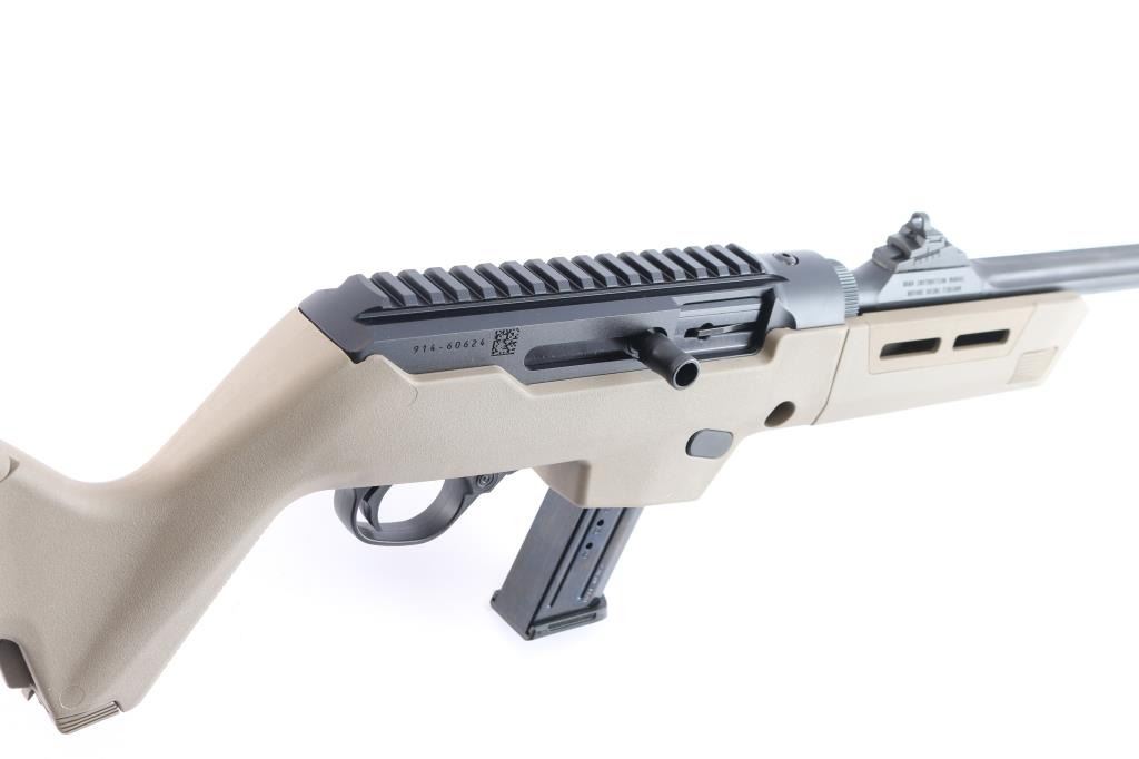 'Dead blow' action semi-automatic take-down rifle chambered in 9x19mm, manufactured circa 2023. Features a threaded and fluted 16" cold hammer forged chrome-moly steel heavy barrel with matte black finish and thread protector, shrouded blade fixed front sight, sliding adjustable ghost ring rear sight, CNC machined 7075-T6 aluminum alloy receiver with integral Picatinny rail & Type III hard-coat anodized matte black finish, reversible push button magazine release, reversible cylindrical charging handle, interchangeable SR9 pattern magazine well, push button safety, serrated curved wide trigger, FDE polymer forend and pistol grip Magpul Backpacker shoulder stock with provisions for QD cups. Butt stock has interchangeable top door to adjust for comb height. Bore is very good. Retains approx. 98% finish only minor losses. Action is smooth. Comes with one 17rd magazine, additional magazine well for Glock magazines, additional butt stock compartment door, tools, manual cable lock and factory box. Condition is NRA excellent. ***Modern Firearm***.