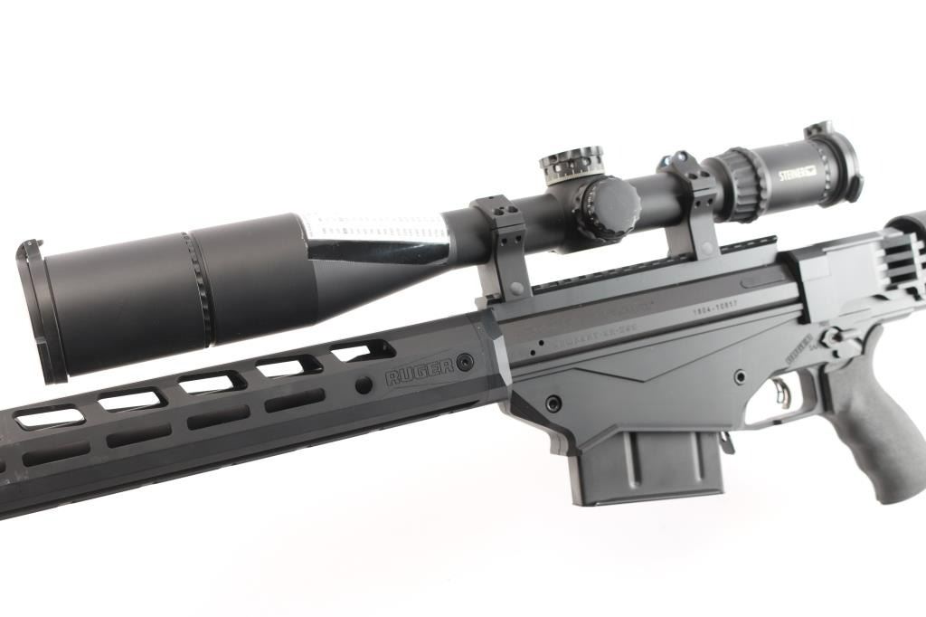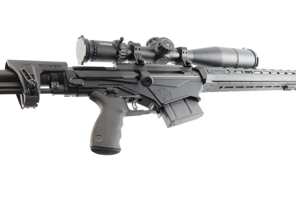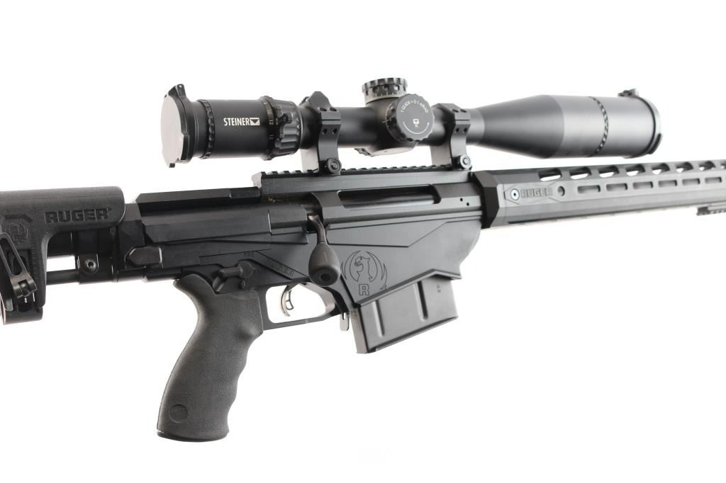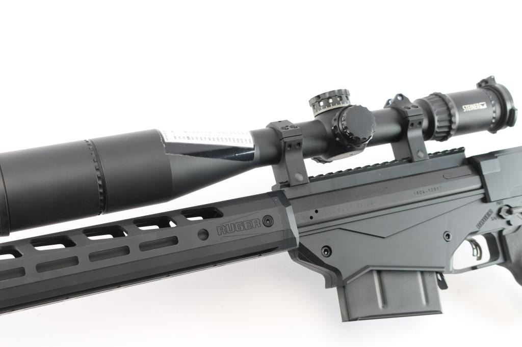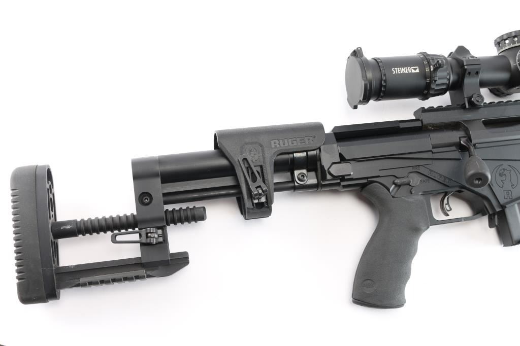 Magazine fed bolt action target rifle chambered in .338 Lapua Magnum. Features matte black finish, heavy contour 26” barrel with Ruger muzzle break, adjustable trigger, accepts detachable magazines, manual safety, 18” aluminum free-float key-mod handguard, Picatinny rail section attached to handguard at 6 o'clock position, AR style Ergo pistol grip, Ruger left-side folding fully adjustable shoulder stock. Bore is bright, appears very good. Retains 95% finish with handling marks. Mounts an excellent condition Steiner T5Xi 5-25x56mm scope with illuminated SCR reticle, 34mm tube, Steiner rings, extended sunshade. Illumination not tested - battery not present. Includes one magazine, factory boxes for rifle and for scope.