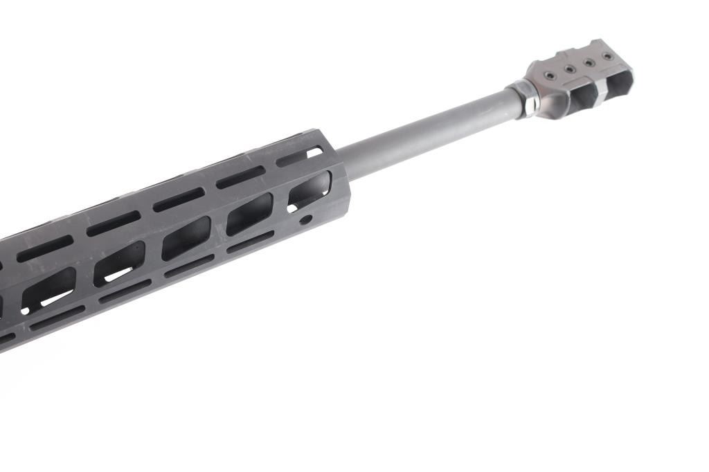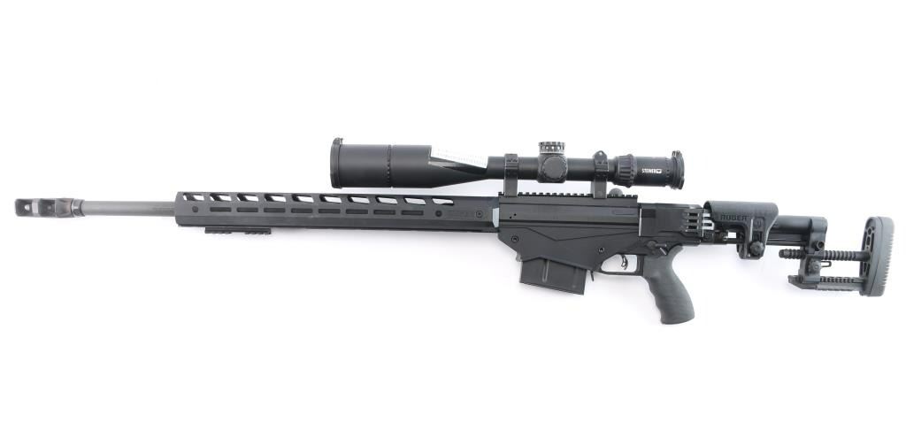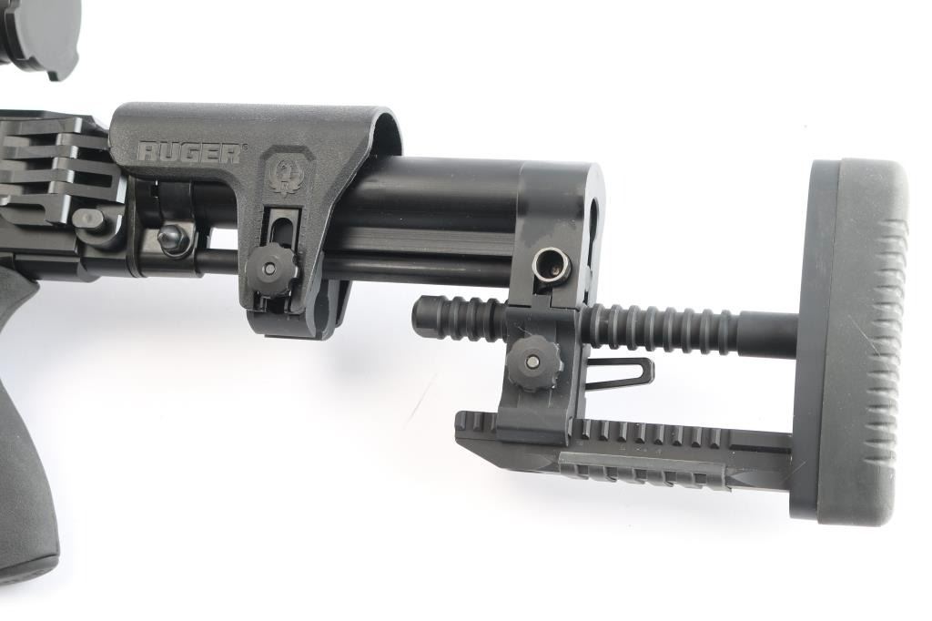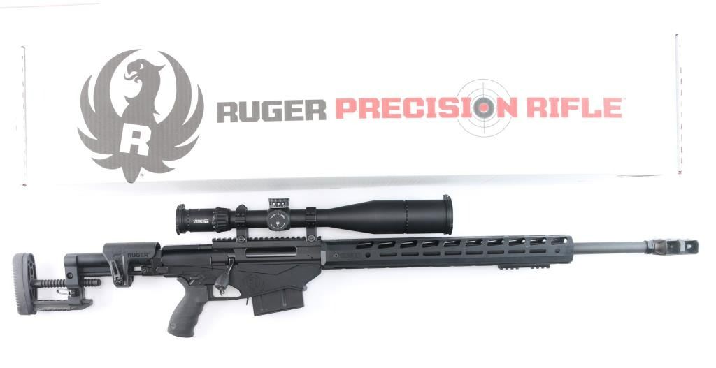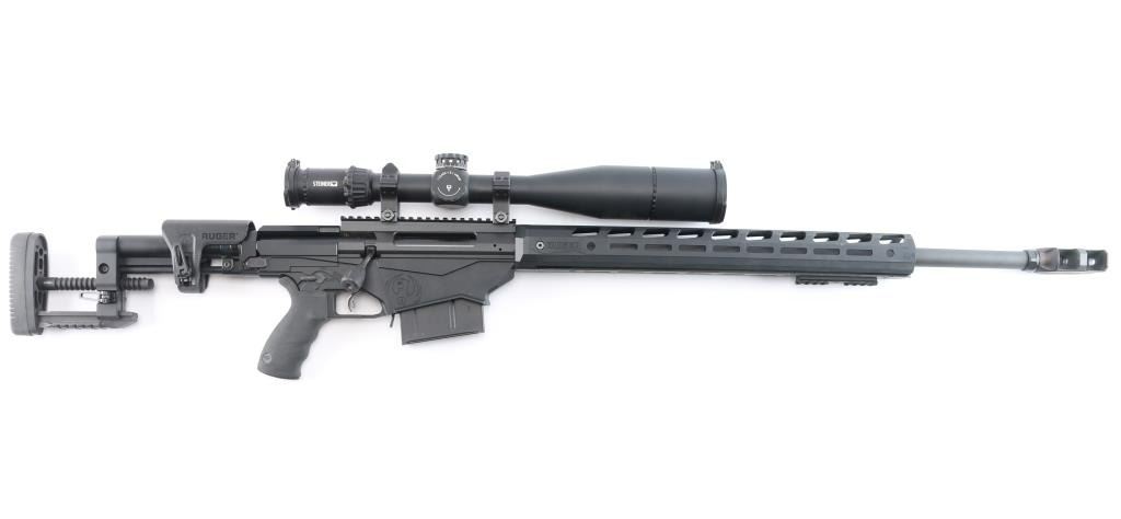 Magazine fed bolt action target rifle chambered in .338 Lapua Magnum. Features matte black finish, heavy contour 26” barrel with Ruger muzzle break, adjustable trigger, accepts detachable magazines, manual safety, 18” aluminum free-float key-mod handguard, Picatinny rail section attached to handguard at 6 o'clock position, AR style Ergo pistol grip, Ruger left-side folding fully adjustable shoulder stock. Bore is bright, appears very good. Retains 95% finish with handling marks. Mounts an excellent condition Steiner T5Xi 5-25x56mm scope with illuminated SCR reticle, 34mm tube, Steiner rings, extended sunshade. Illumination not tested - battery not present. Includes one magazine, factory boxes for rifle and for scope.